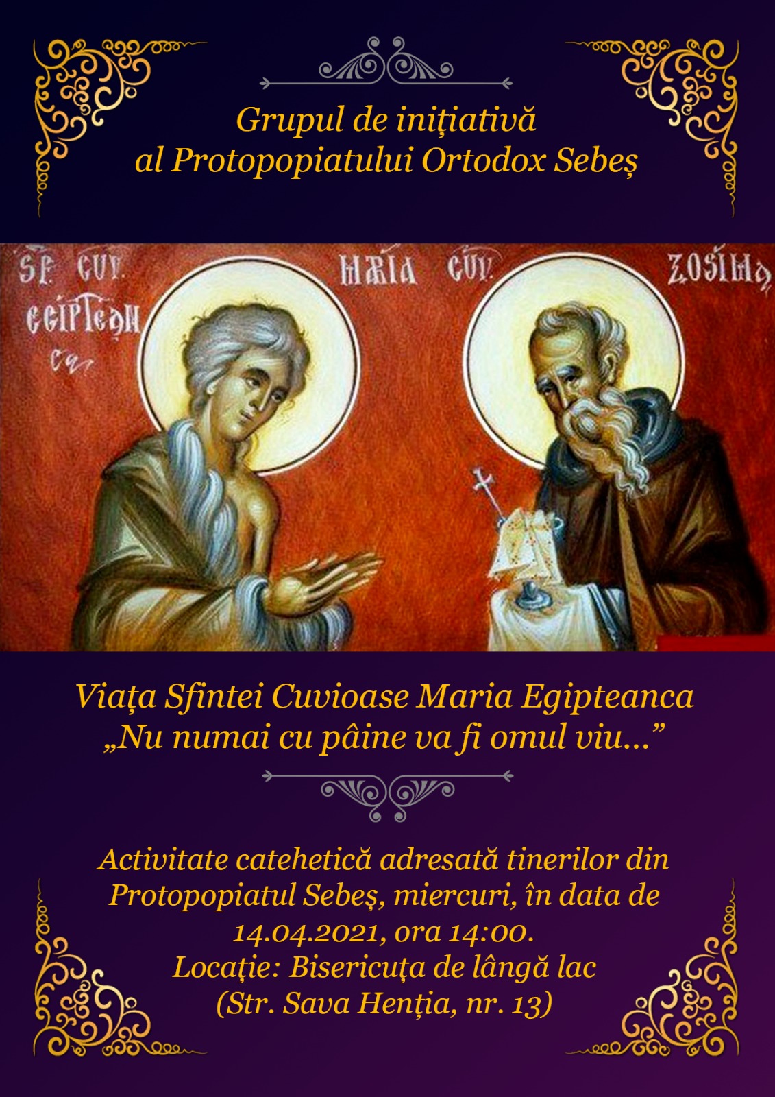 Cu binecuvântarea Înaltpreasfinţitului Părinte Arhiepiscop Irineu, Grupul de Inițiativă pentru Tineret al Protopopiatului Ortodox Sebeș a desfășurat activitatea catehetic-misionară „Viața Cuvioasei Maria Egipteanca: «Nu numai cu pâine va trăi omul...»”. Evenimentul a avut loc în biserica „Sfântul Mare Mucenic Gheroghe” din parohia Sebeș IV, miercuri, 14 aprilie 2021, în ziua oficierii Deniei Canonului celui Mare.
