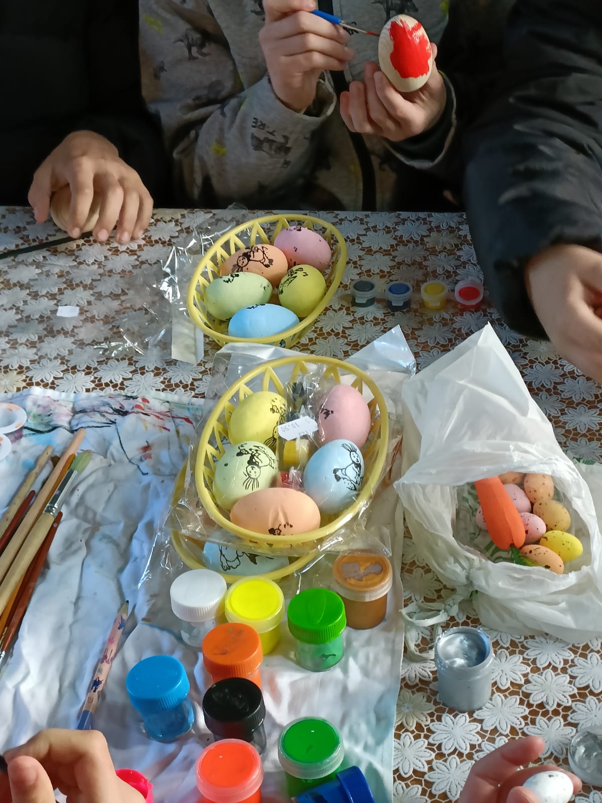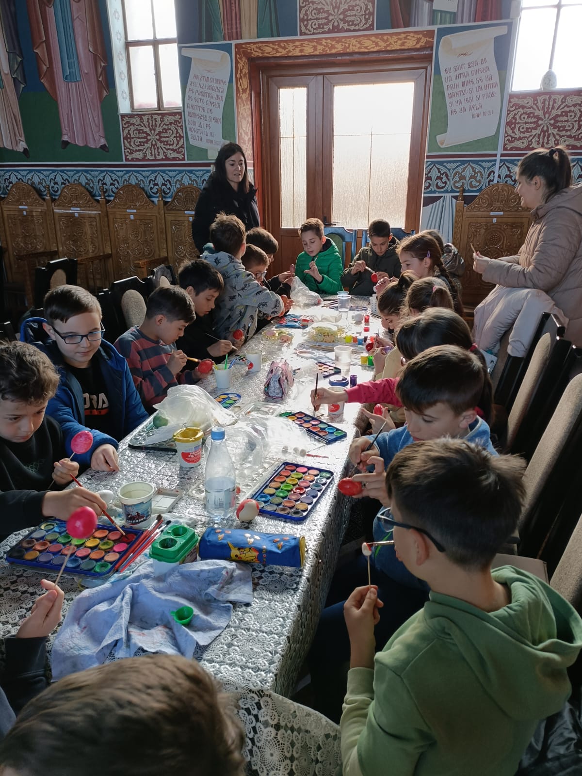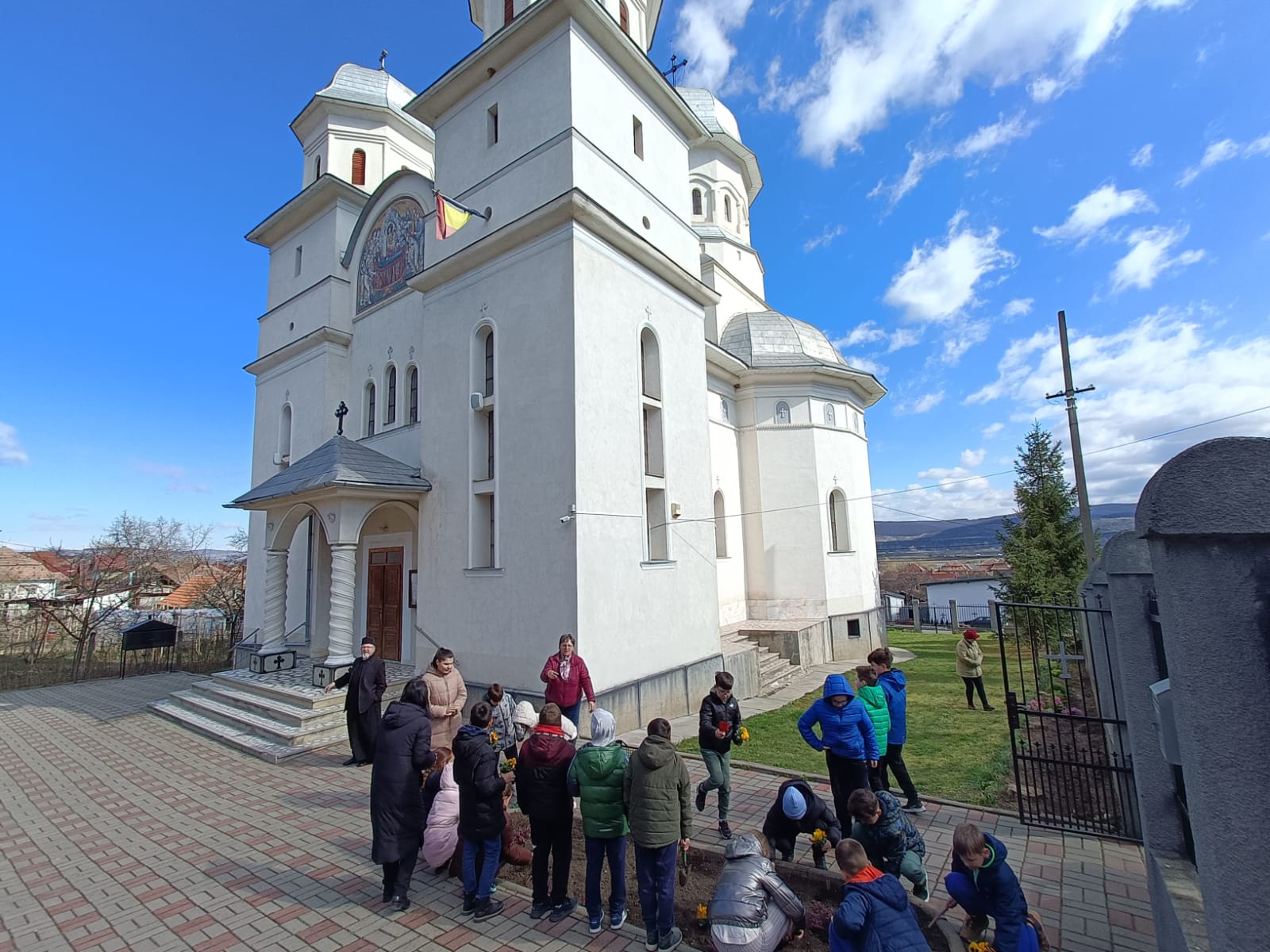 În continuare, a avut loc un atelier de lucru specific perioadei de așteptare a praznicului sfânt al Învierii Domnului. Elevii au învățat diferite practici de colorare și decorare a ouălor de Paști. Au folosit, în sensul acesta, ouă din lemn, din polistiren sau ouă fără conținut, iar la final au avut loc discuții pe marginea metodelor învățate, pe care le vor pune în practică în zilele premergătoare marelui praznic. De asemenea, în curtea bisericii, au plantat flori în spațiile special amenajate, înțelegând, astfel, însemnătatea acțiunilor din „Săptămâna verde”. Conștientizând, totodată, că natura este darul lui Dumnezeu, elevii se străduiesc să iubească plantele, florile, să protejeze mediul înconjurător și să își formeze un comportament responsabil față de creația lui Dumnezeu. Faptul că aceste activități s-au desfășurat la biserică a sporit bucuria și emoția din sufletele copilașilor.
