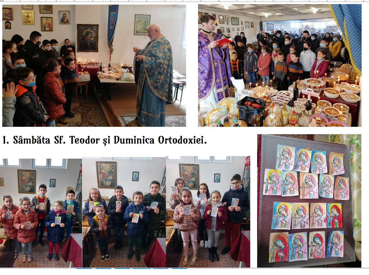 1. În prima săptămână din Postul Mare, copiii au ales grâu și au făcut colivă împreună cu părinții. Colivele au fost binecuvântate la biserică în sâmbăta Sfântului Teodor, iar părintele Gheorghe Rablou a istorisit copiilor minunea Sfântului Teodor, explicând însemnătatea prinoaselor pentru cei raposați. Pentru a sărbători Întoarcerea icoanelor în biserică, în Duminica Ortodoxiei, copiii au pictat icoane, realizând o frumoasă expoziție.