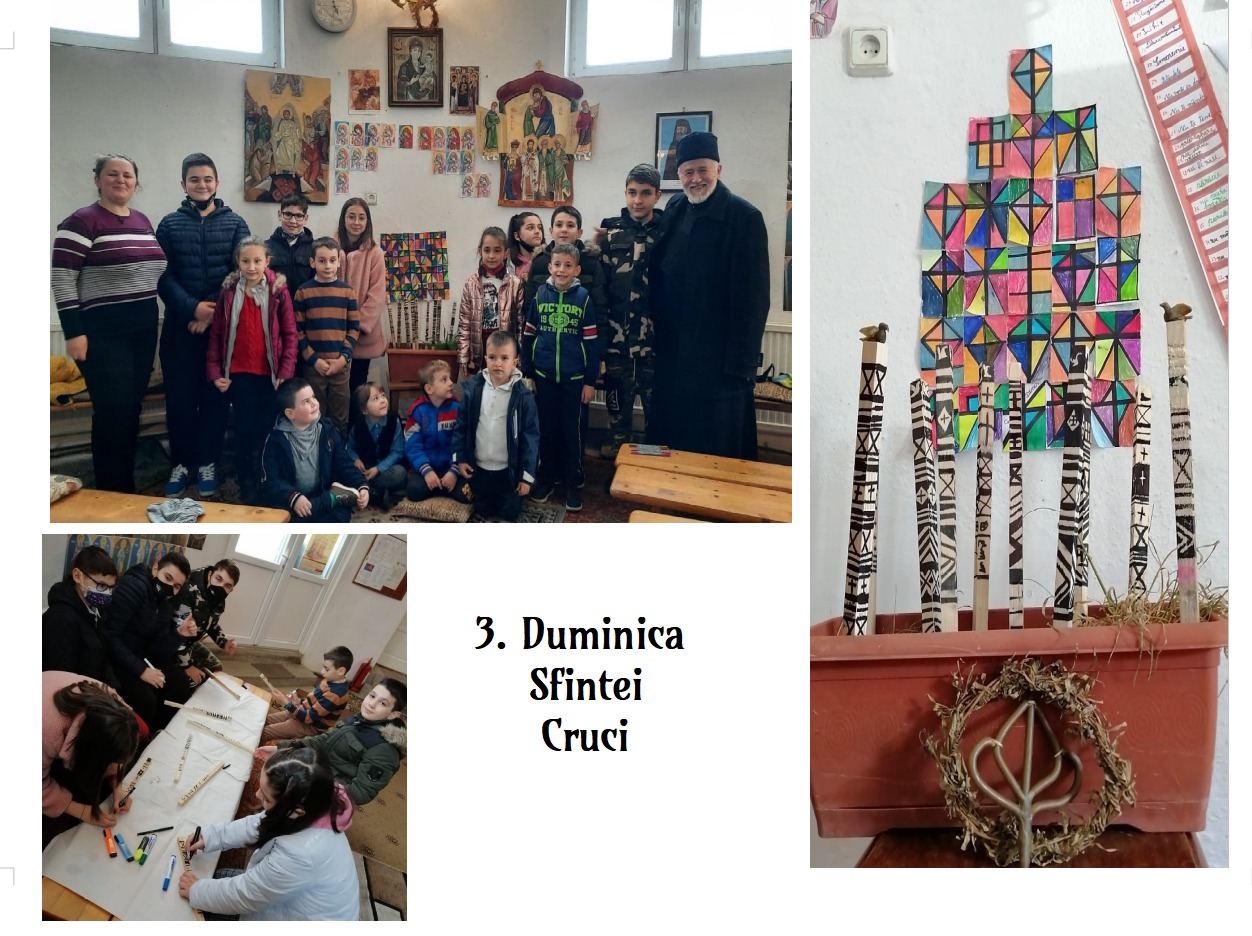 3. A treia Duminică din Post este dedicată Sfintei și de viață Făcătoarei Cruci. Pentru o înțelegere mai profundă a importanței Sfintei Cruci (atât ca altar de jertfă, cât și ca simbol al mântuirii așezat la căpătâiul celor adormiți), copiii mai mari au prelucrat stinghii de lemn, decorându-le cu motive tradiționale românești, inspirându-se după stâlpii funerari din zona Loman. Cei mici au realizat un decor abstract format din cruci de hârtie suprapuse. Aceste obiecte au fost amplasate ca o dioramă, formând un cimitir în miniatură dedicat sfinților închisorilor și tuturor acelora care nu au avut parte de cruce la mormânt.
