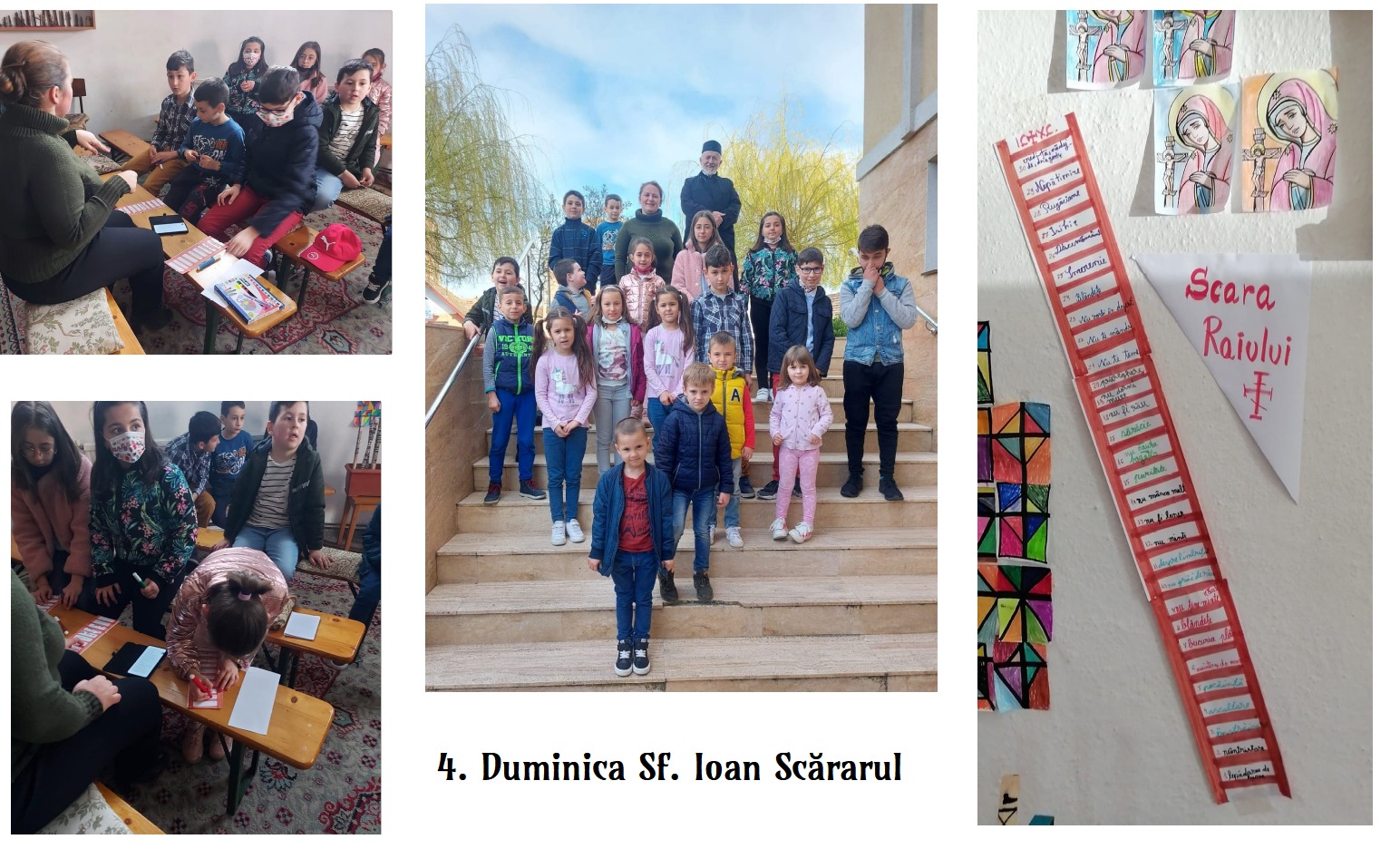4. În a patra Duminică, dedicată Sfântului Ioan Scărarul, părintele paroh a explicat copiilor înțelesul celor treizeci de trepte din lucrarea „Scara virtuților”. Copiii au notat informațiile într-un mic proiect sub formă de scară.
