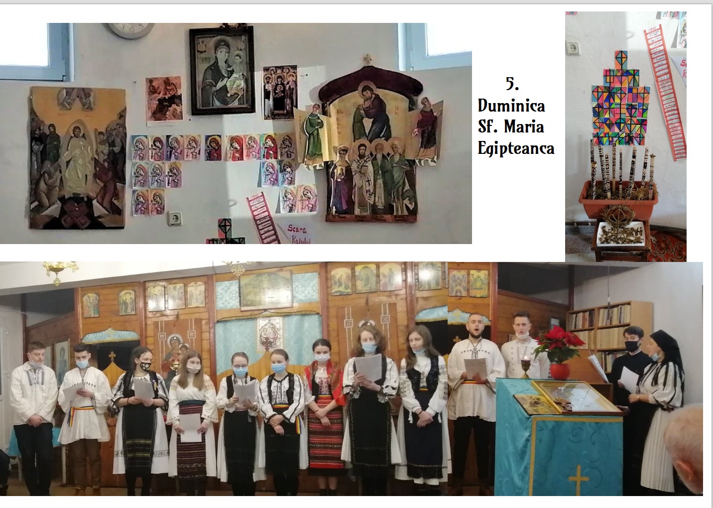5. În a cincea Duminică, părintele slujitor Ionel Arsu a prezentat pe scurt viața Sfintei Cuvioase Maria Egipteanca, iar tinerii parohiei noastre au prezentat eseuri pe diferite teme de actualitate: „Familia creștină în modernitate”, „Tinerii în biserică”, „Școala online – riscuri și oportunități” etc. De un interes deosebit s-au bucurat referatele: „Biruința prin bucurie – mărturii despre Sfinții închisorilor” și „Pasărea suflet – simbolistica ancestrală a stâlpilor funerari de la Loman”. Toate eseurile au fost colectate și urmează a fi publicate.