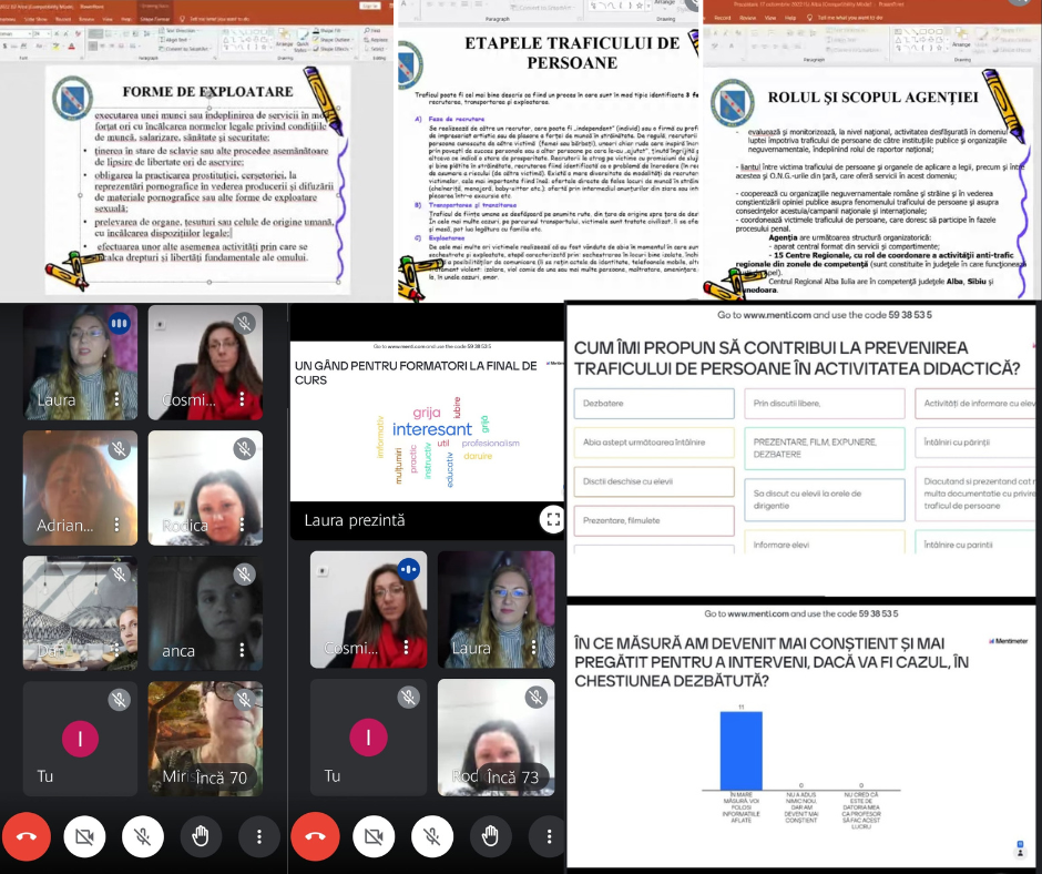 În acest context, Agenţia Naţională Împotriva Traficului de Persoane (ANITP) a lansat invitația adresată Profesorilor de Religie și Coordonatorilor de proiecte și programe educative școlare și extrașcolare din județul Alba de a participa, în data de 17 octombrie 2022, de la ora 17:00, la o sesiune de lucru online, care a fost susținută de către inspector de specialitate Mariș Cosmina din cadrul Centrului Regional Alba Iulia, fiind moderată de către inspectorul școlar pentru Religie, prof. Laura Popa.