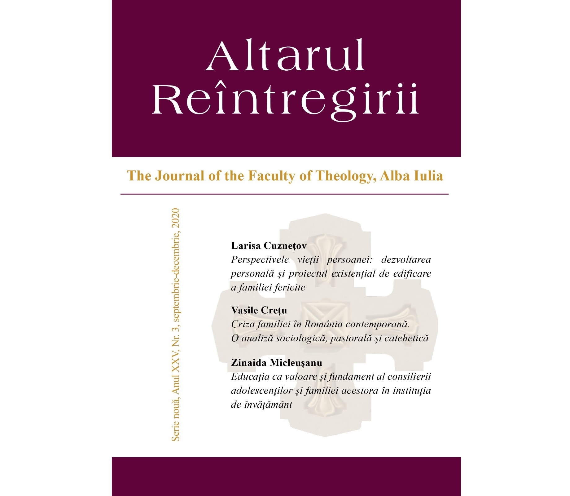Numărul de faţă al revistei „Altarul Reîntregirii” (3/2020) grupează, sub genericul „Familie și educație în societatea postmodernă”, o serie de articole cu caracter puternic interdisciplinar, care includ cercetări prin care este analizată posibilitatea de intervenţie educativă a familiei. Cadre didactice şi tineri cercetători din diferite universităţi din România şi din Republica Moldova caută să identifice, din perspectiva teologiei, a psihologiei şi a ştiinţelor educaţiei, soluţii pentru susţinerea familiei în redescoperirea posibilităţilor sale de intervenţie educaţională.