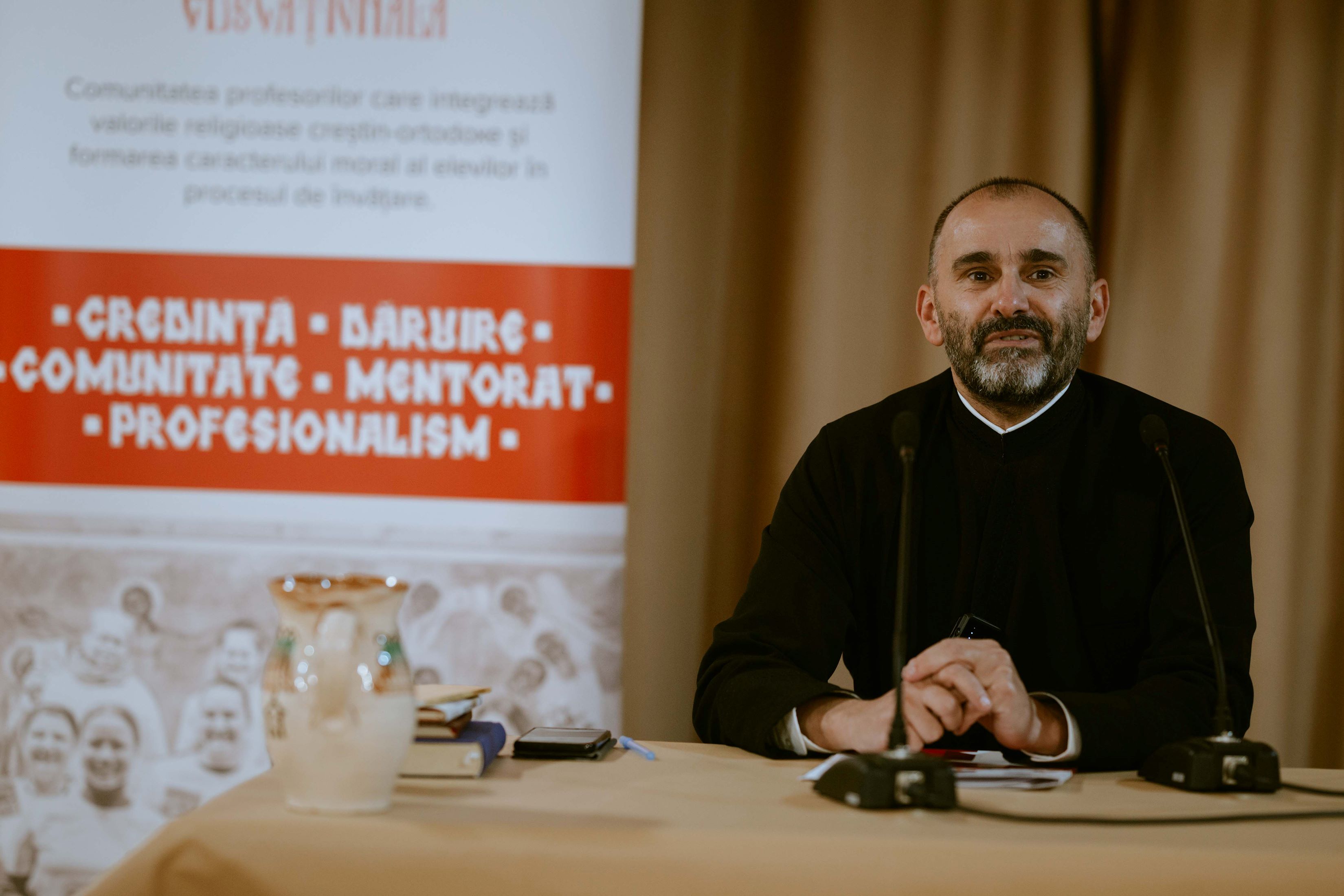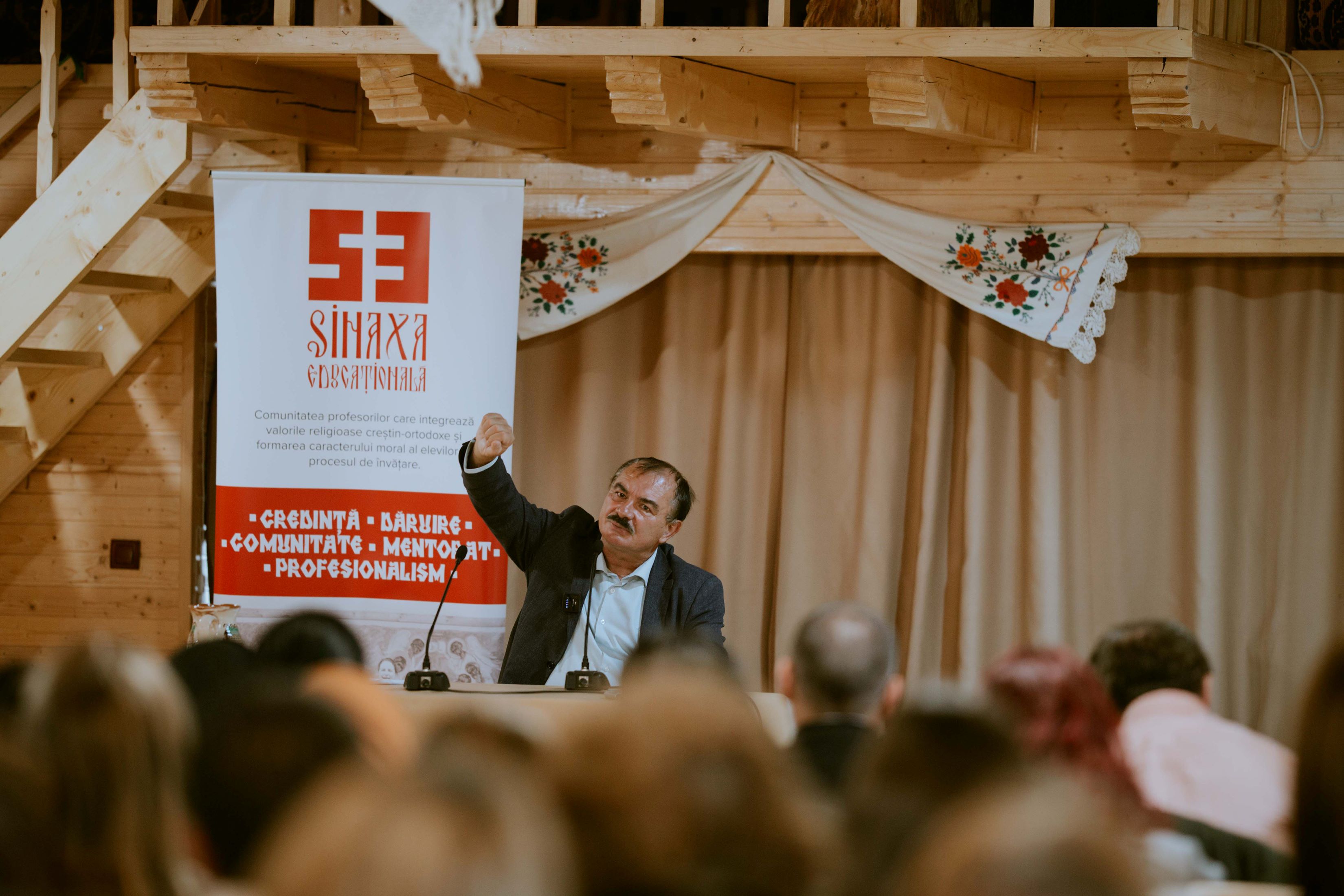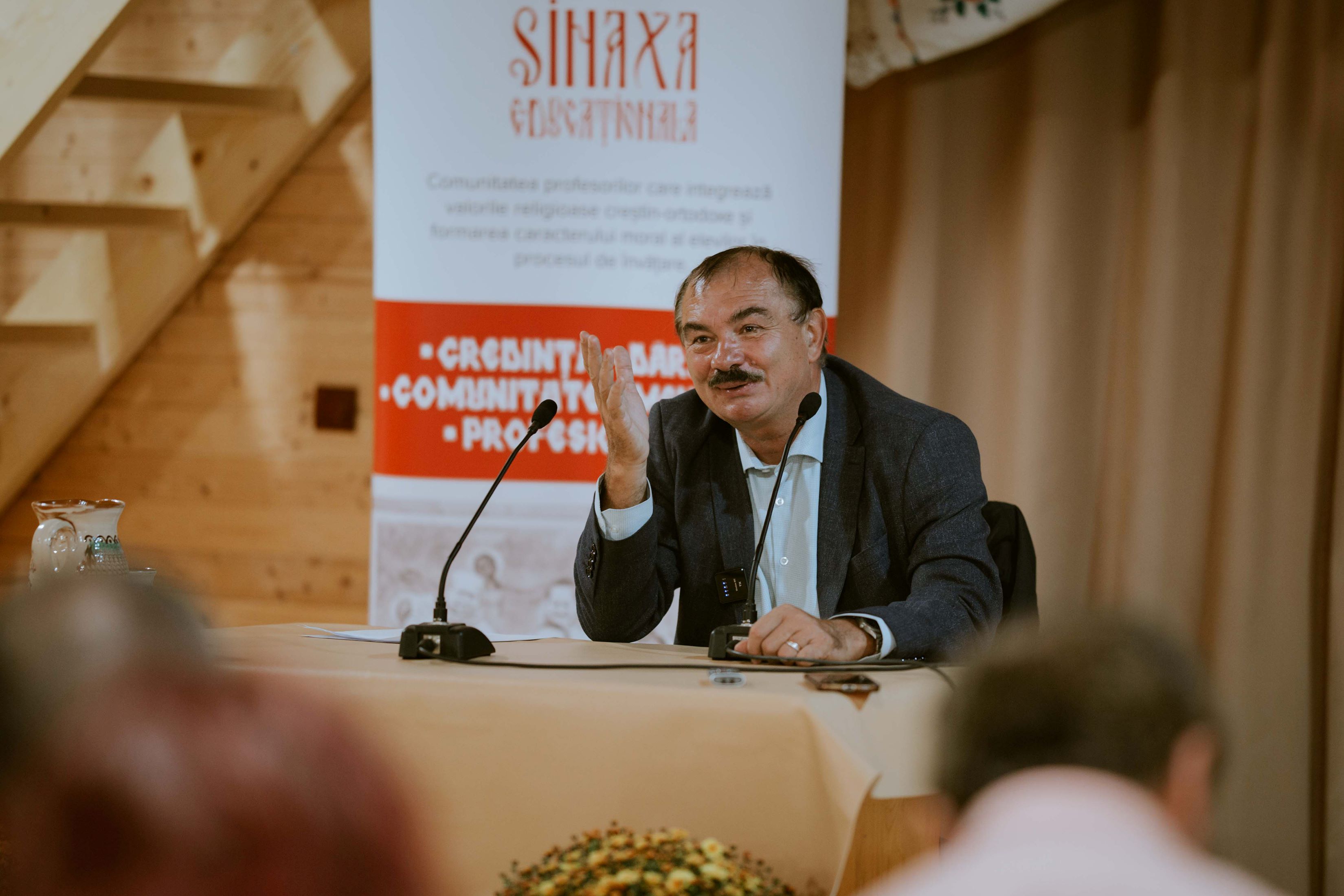 Sâmbătă dimineață, după Sfânta Liturghie, profesorii s-au întâlnit cu domnul prof. univ. dr. Mircea Miclea, cadru didactic la Facultatea de Psihologie și Științe ale Educației a Universității „Babeș-Bolyai” din Cluj-Napoca și fost ministru al Educației. Într-o prelegere memorabilă, domnia sa a vorbit despre entuziasmul ca dimensiune esențială a calității actului didactic, afirmând că „entuziasmul profesorului este una dintre cele mai puternice emoții care influențează învățarea elevilor”. Domnul profesor Mircea Miclea a arătat că reacțiile emoționale pozitive ale cadrului didactic – bucuria, curiozitatea, pasiunea – dau forță lecției și o transformă într-o memorie emoțională care rămâne vie în mintea și inima elevilor. „Schimbăm oamenii prin emoțiile pe care le transmitem. Cine salvează un om, salvează o lume”, a subliniat domnia sa.