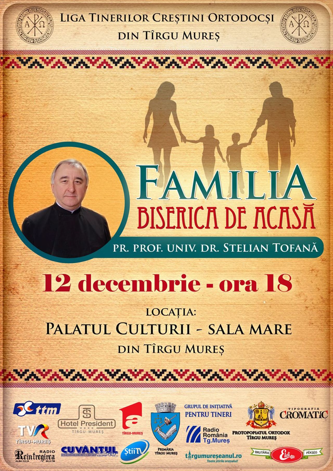 Liga Tinerilor Creștini Ortodocși Români din Târgu Mureș în parteneriat cu Protopopiatul Ortodox Târgu Mureș, Primăria Târgu Mureș și cu mai multe instituții media, vă invită să luați parte la seara duhovnicească cu tema "Familia, biserica de acasă".