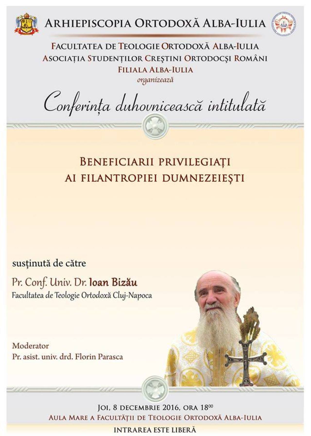 Arhiepiscopia Ortodoxă de Alba Iulia, Facultatea de Teologie Ortodoxă şi Asociaţia Studenţilor Creştini Ortodocşi filiala Alba Iulia organizează astăzi conferinţa duhovnicească intitulată „Beneficiarii privilegiaţi ai filantropiei dumnezeieşti”.