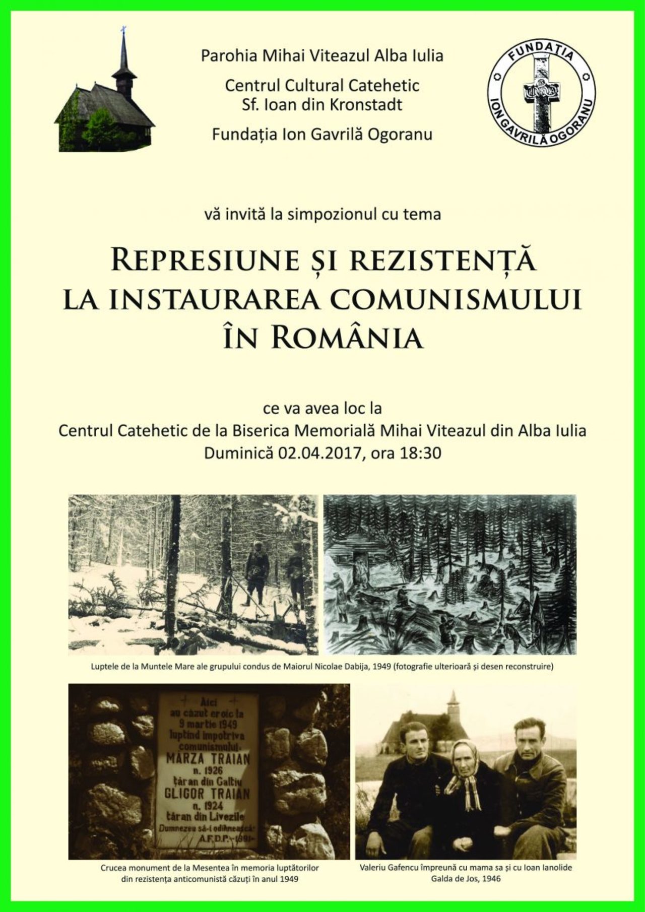 La Centrul Catehetic de la Biserica Memorială „Mihai Viteazul” din Alba Iulia va avea loc duminică, 2 aprilie, începând cu ora 18.30, simpozionul cu tema „Represiune și rezistență la instaurarea comunismului în România”. Evenimentul este organizat de Parohia Mihai Viteazul Alba Iulia, Centrul Cultural Catehetic Sfântul Ioan din Kronstadt și Fundația Ion Gavrilă Ogoranu.