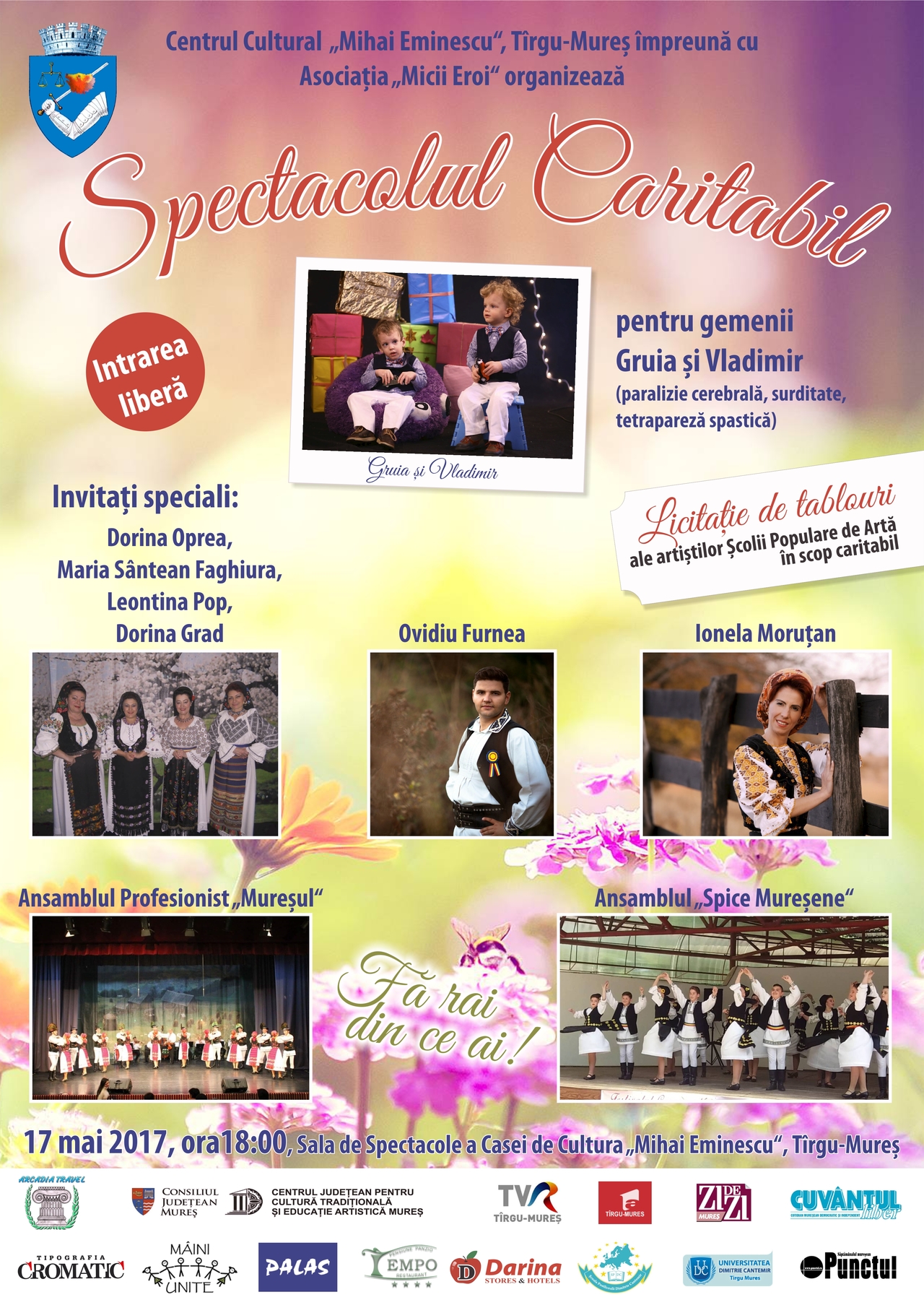 Miercuri, 17 mai 2017, începând cu ora 18:00 la Casa de Cultură "Mihai Eminescu" din Tg. Mureş va avea loc un spectacol caritabil susţinut de artişti de la Ansamblul folcloric “Mureşul”. Vor urca pe scenă soliştii: Dorina Oprea, Maria Sântean Faghiura, Leontina Pop, Dorina Grad, Ionela Moruţan, Ovidiu Furnea şi Ansamblul “Spice mureşene”.