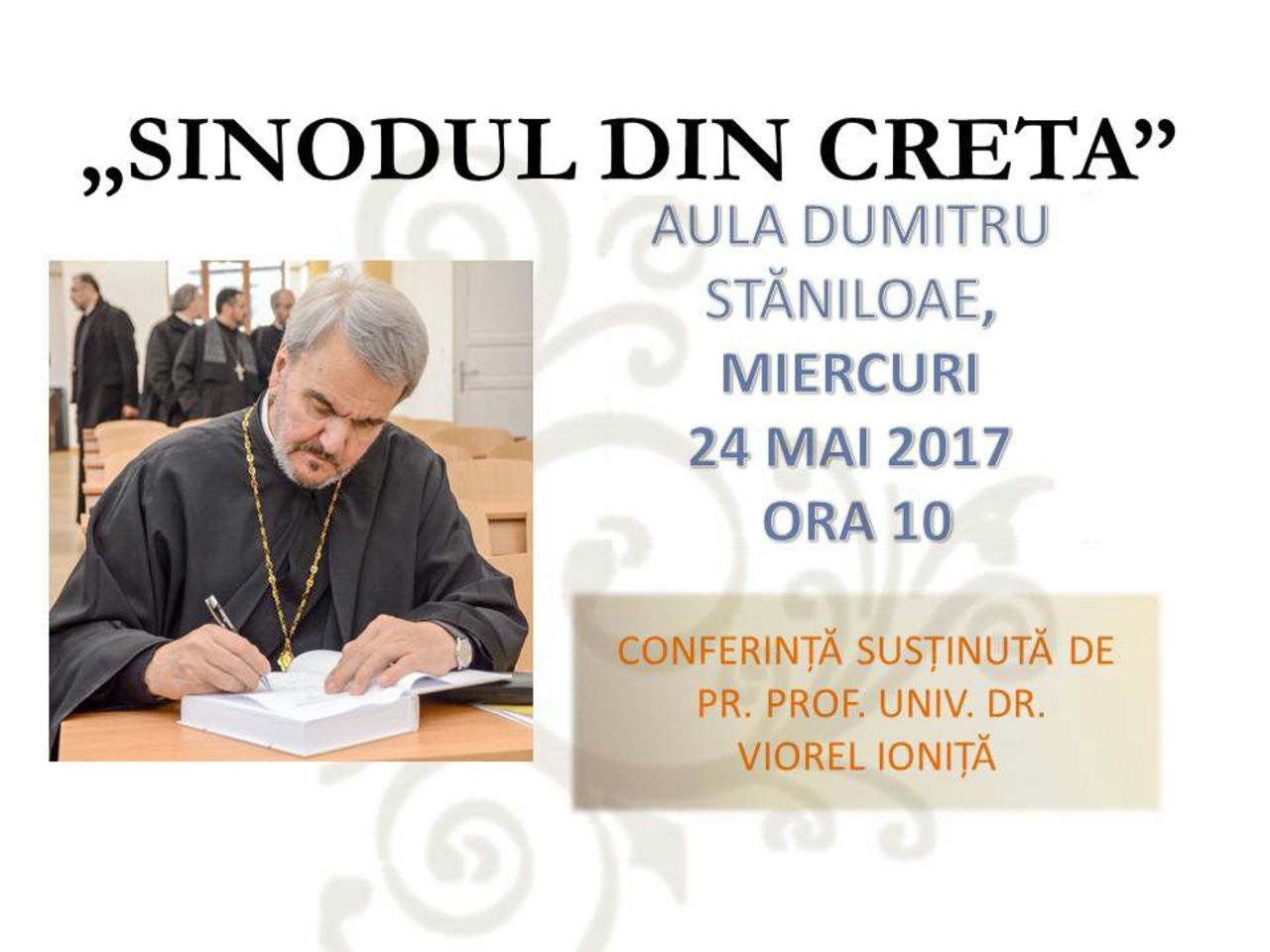 Mâine, 24 mai a.c., începând cu ora 10:00, în Aula „Dumitru Stăniloae” a Facultății de Teologie Ortodoxă din Alba Iulia va avea loc conferința întitulată „Sinodul din Creta”, susținută de către pr. prof. univ. dr. Viorel Ioniță. Distinsul profesor de teologie de la Facultatea de Teologie Ortodoxă „Justinian Patriarhul” din București a fost, pentru o lungă perioadă de timp, reprezetant al Bisericii Ortodoxe Române în Conferința Bisericilor Europene. Preacucernicia sa face parte din numeroase comisii de dialog ecumenic, fiind un teolog ortodox cunoscut atât în țară, cât și în afara granițelor.
