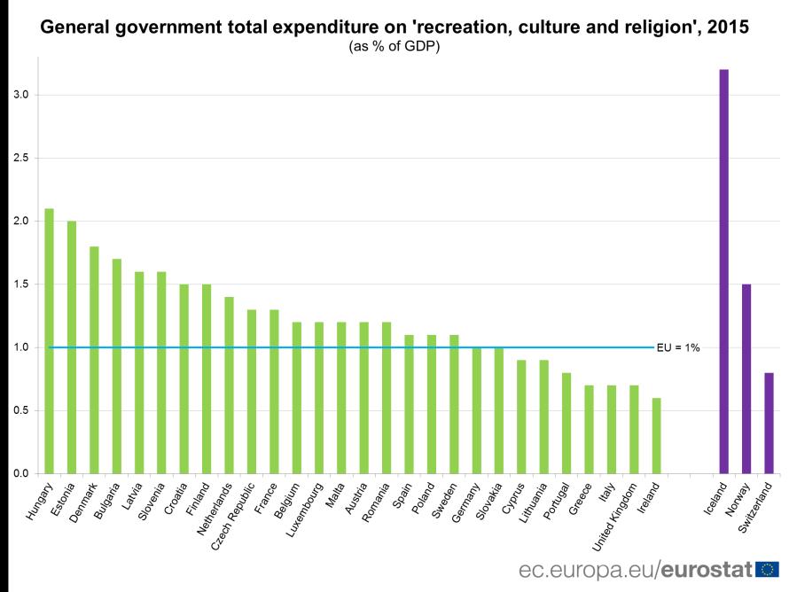 Potrivit unui raport al Oficiului European de Statistică (Eurostat) [http://ec.europa.eu/eurostat/web/products-eurostat-news/-/DDN-20170807-1] , România se încadrează pe ultimul loc printre statele Uniunii Europene în ceea ce priveşte cheltuielile din anul 2015 pentru religie, cultură şi recreaţie.