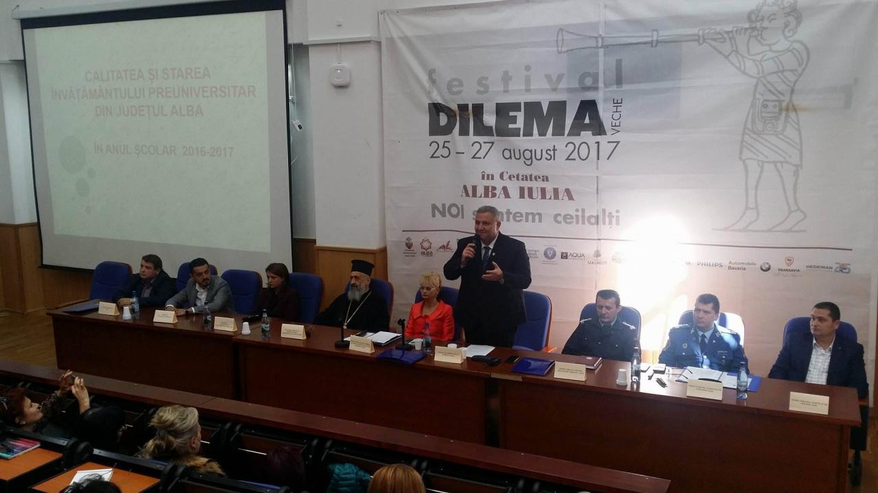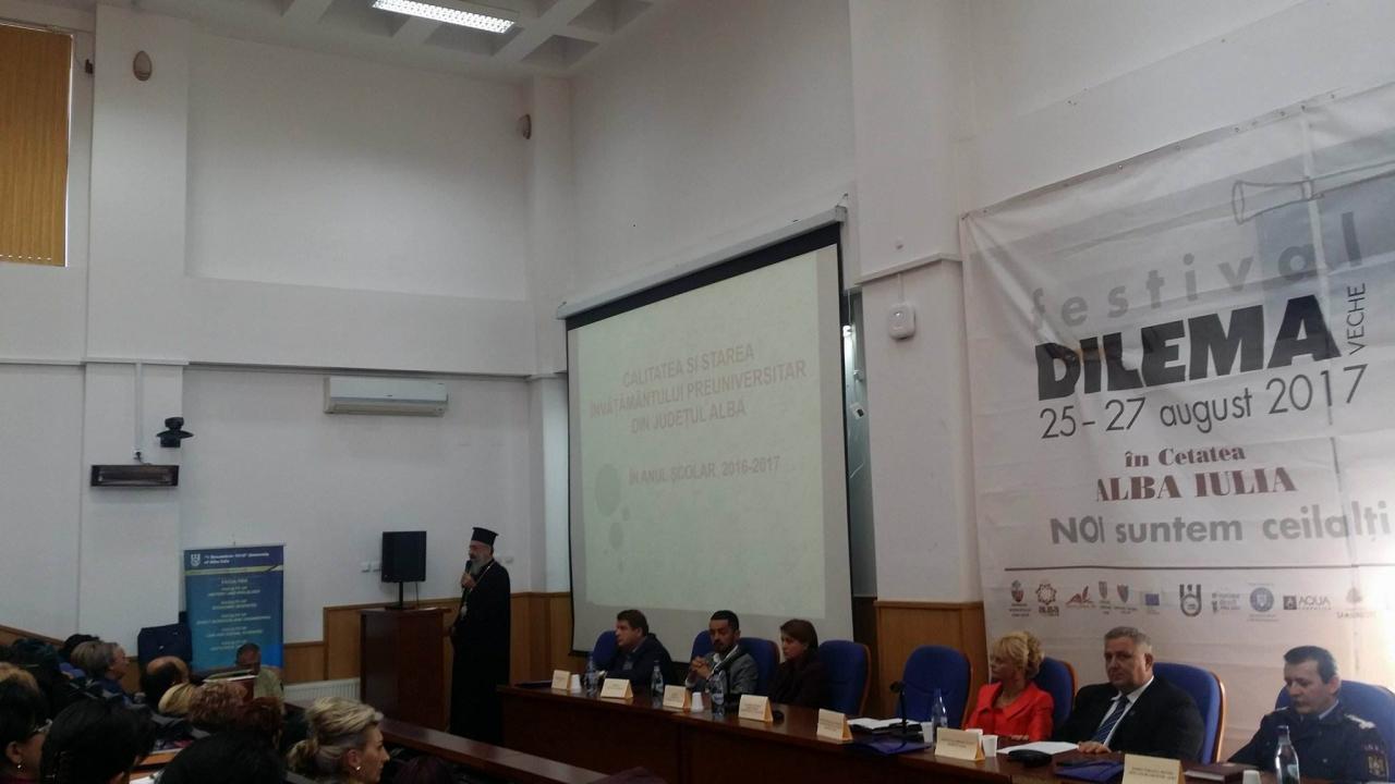 Marți, 3 octombrie a.c., Înaltpreasfințitul Părinte Arhiepiscop Irineu a participat la Ședința anuală de evaluare a sistemului universitar de educație – Starea învățământului din județul Alba, eveniment organizat de către Inspectoratul Școlar Județean Alba. Manifestarea s-a desfășurat începând cu ora 11:00, în Amfiteatrul A9 al Universității „1 Decembrie 1918” din Alba Iulia. În deschidere, doamna prof. Eugenia-Marcela Dărămuș, inspector școlar general al județului, a rostit un cuvânt de bun venit tuturor cadrelor didactice și le-a mulțumit pentru implicarea de care au dat dovadă în anul școlar 2016-2017. Subliniind faptul că orice lucru bun începe cu gândul la Dumnezeu, doamna inspector general a oferit cuvântul de început Părintelui nostru Arhiepiscop Irineu. Ierarhul nostru a adresat celor prezenți un pătrunzător cuvânt despre importanța dascălilor în consolidarea societății românești și a subliniat roadele colaborării dintre Biserică și Școală: În societatea contemporană, marcată de avalanşa falselor valori şi a zeităţilor mincinoase, dascălii sunt chemaţi să se angajeze efectiv în educarea copiilor şi a tinerilor. În acest scop, este bine ca ei să întrebuinţeze, cu iscusinţă, întregul arsenal pedagogic, îmbinând îngăduinţa cu exigenţa şi bunătatea cu asprimea. Aceasta să o facă, fără ezitare, bazându-se pe cuvântul revelat: „Pe cine îl iubeşte Domnul, pe acela îl ceartă şi biciuieşte pe tot fiul pe care îl primeşte” (Evr. 12, 6). Copiii trebuie învăţaţi să se ferească de droguri, de alcool, de fumat şi de viciile care şubrezesc sănătatea biologică şi morală, diminuându-le puterea de muncă. De asemenea, copiii trebuie învăţaţi să iubească virtutea, spre a fi harnici, cinstiţi, buni şi demni. Lăsaţi în voia lor, fără a li se pune nici un frâu, ei nu pot deveni oameni de caracter. De aceea, Asterie al Amasiei ne avertizează: „Când tinereţea este lăsată de capul ei şi nu ştie nici de frică, nici de ruşine, atunci toate se pierd şi se nimicesc”. Precum procedează părinţii în familie, tot aşa şi profesorii au datoria de a-i face pe copii să iubească Şcoala şi Biserica, aceste două instituţii tradiţionale ale neamului românesc. La şcoală mergi spre a te pregăti pentru viaţă, spre a te instrui, spre a cunoaşte lumea. Astfel, mai târziu, societatea poate să aibă în tine un sprijin şi un ajutor, nu un om de nimic pe care să-l poarte în spate şi care să-i creeze greutăţi. Iată de ce este atât de necesară predarea Religiei în şcoală. Scriitorul şi lingvistul Ion Heliade-Rădulescu (†1872) afirma: „Religia este cea dintâi piatră de temelie pe care se poate ridica zidirea unei societăţi”. Fără educaţie religioasă, nu este o artă de a trăi frumos, nu este şansă de fericire, care vine din credinţa în Dumnezeu. În continuare, au luat cuvântul și reprezentanții celorlalte instituții care sprijină activitatea Inspectoratului Școlar Județean. La eveniment au luat parte Dănuț-Emil Hălălai – prefect al județului Alba, Alin Cucui – vicepreședinte al Consiliului Județean Alba, Alexandru Sinea – director al Direcției de Sănătate Publică Alba, conf. univ. dr. Andreea Muntean – prorector al Universității „1 Decembrie 1918” din Alba Iulia, colonel Cornel Oprișa – inspector-șef al Inspectoratului pentru Situații de Urgență Alba, Sorin Cioancă – comisar-șef în cadrul Inspectoratului de Poliția Alba, colonel Marius-Claudiu Giurea – inspector-șef al Inspectoratului de Jandarmi Județean Alba.