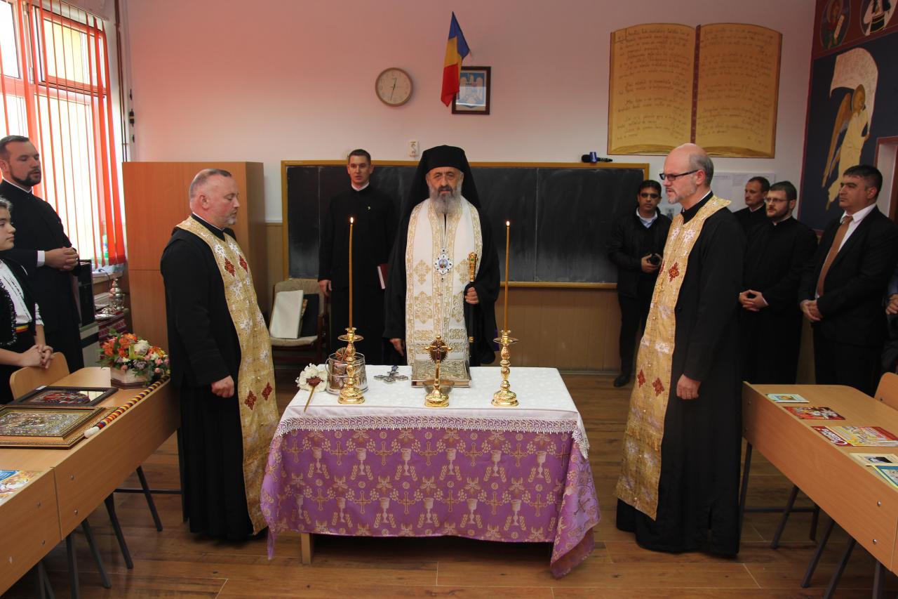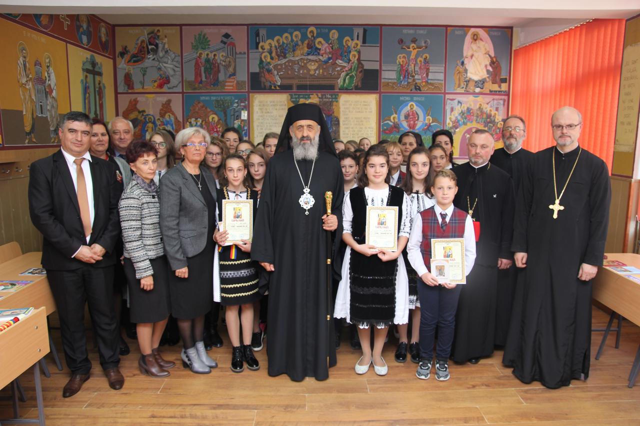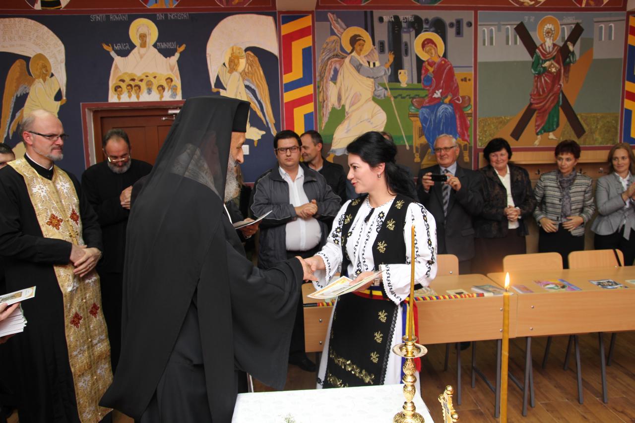 Marți, 17 octombrie a.c., de la ora 12:00, Înaltpreasfințitul Părinte Irineu, Arhiepiscop al Alba Iuliei, a fost prezent în mijlocul profesorilor și al elevilor Școlii Gimnaziale „Ioan Vlăduțiu” din Luduș. Cu acest prilej, Ierarhul nostru a oficiat o slujbă de binecuvântare a cabinetului de religie al unității de învățământ, în urma realizării unor lucrări de renovare și înfrumusețare a acestui spațiu în care elevii se roagă și învață lucruri frumoase despre Dumnezeu. În prezența părintelui Claudiu Chiorean – inspector școlar pentru disciplina Religie, a părintelui Lucian Voșloban – protopop al protopopiatului Luduș, a prof. Adrian Banea – directorul școlii, a corpului didactic și a elevilor, Părintele Arhiepiscop Irineu a rostit un cuvânt prin care i-a îndemnat pe cei de față să inhaleze ozonul rugăciunii, să se hrănească cu cuvântul biblic și cu Sfânta Euharistie și să își înmulțească talanți printr-un activism social pus în slujba binelui moral și printr-o empatizare evanghelică cu semenii noștri, aflați în diferite nevoi. Cabinetul de religie, coordonat de către prof. Marioara Dăian, a fost înfrumusețat cu icoane pictate de către elevi și profesori, în cadrul proiectului Icoana – fereastră spre cer, desfășurat printr-un parteneriat între Școala Gimnazială „Ioan Vlăduțiu” și Parohia Ortodoxă Luduș III, păstorită de părintele Ilie Dăian, proiect care se înscrie în activitățile Anului omagial al sfintelor icoane, al iconarilor şi pictorilor bisericeşti, așa cum a fost declarat anul 2017 la nivelul Patriarhiei Române. La final, Ierarhul nostru a oferit Diplome de aleasă cinstire directorului unității școlare ludușene, prof. Adrian Banea, și doamnei prof. Marioara Dăian, pentru implicarea în derularea acestui proiect. De asemenea, au fost răsplătiți de către conducerea școlii elevii, profesorii coordonatori și toți cei care au contribuit la realizarea acestei activități.