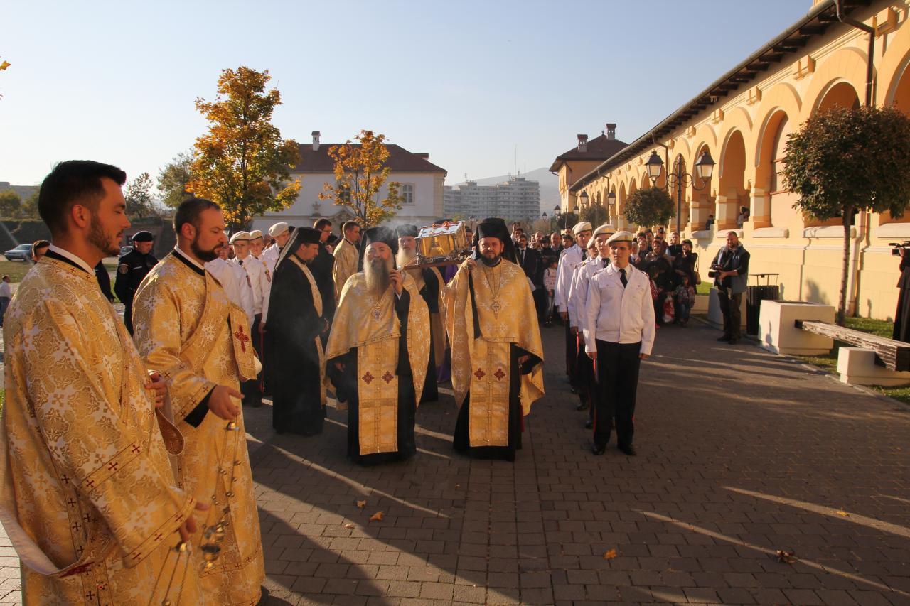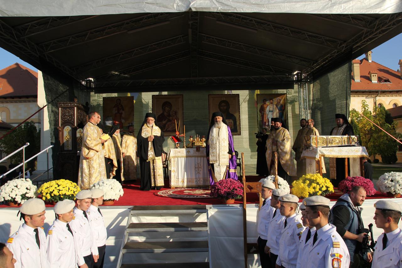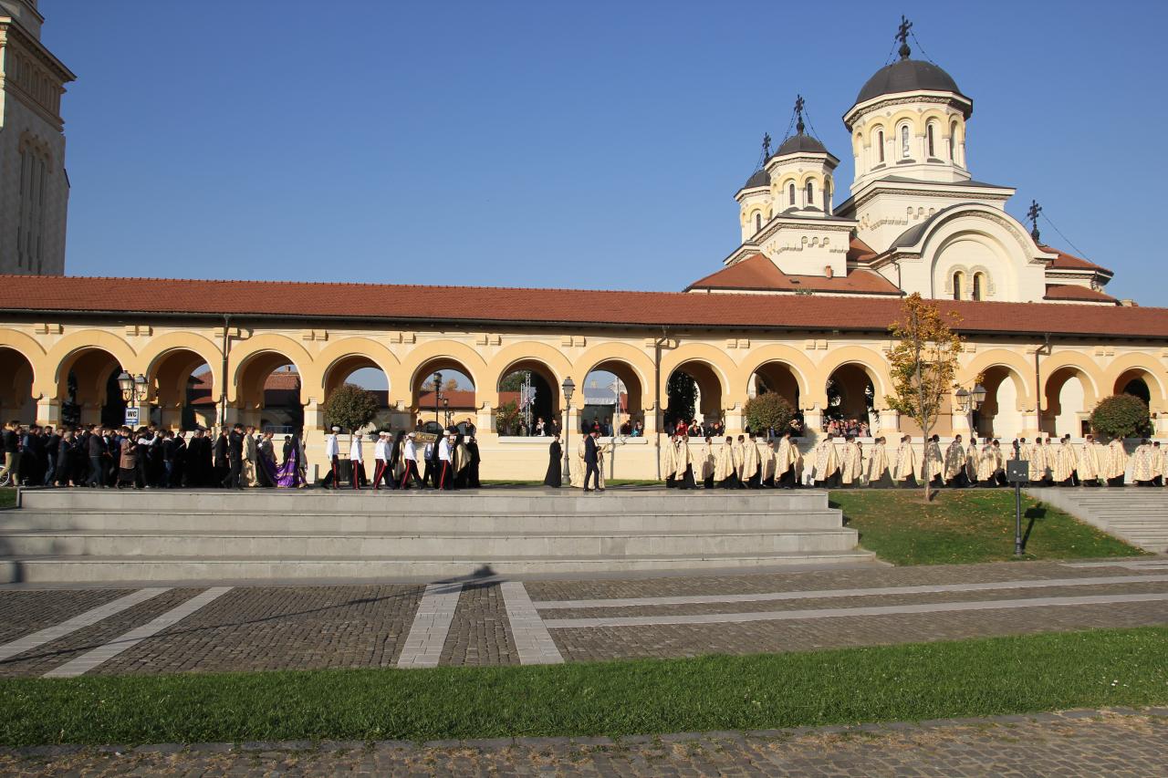 În după-amiaza zilei de vineri, 20 octombrie a.c, Înaltpreasfinţitul Părinte Irineu, Arhiepiscop al Alba Iuliei, înconjurat de clerul şi credincioşii din municipiul Alba Iulia, a întâmpinat delegaţia ce a însoţit racla cu sfintele moaşte ale Sfintei Muceniţe Filofteia de la Curtea de Argeş. Sfintele moaşte au fost aduse spre închinare în Cetatea Marii Uniri, cu binecuvântarea Preafericitului Părinte Daniel, Patriarhul Bisericii Ortodoxe Române, de o delegaţie condusă de Înaltpreasfinţitul Părinte Calinic, Arhiepiscop al Argeşului şi Muscelului. După întâmpinarea sfintelor moaşte, cei doi ierarhi, împreună cu sfinţiţi slujitori şi cu credincioşii prezenţi, au înconjurat Catedrala Arhiepiscopală, cântând troparul Sfintei Muceniţe Filofteia şi al Sfinţilor Mărturisitori Ardeleni. În cuvântul rostit cu acest prilej, Înaltpreasfinţitul Părinte Irineu a subliniat istoria zbuciumată a Transilvaniei, marcată de mari tensiuni confesionale, viaţa mucenicească a sfinţilor pomeniţi, precum şi datoria de a ne aminti de înaintaşii noştri, urmându-le credinţa şi faptele. De asemenea, Înaltpreasfinţitul Calinic a adresat celor prezenţi un cuvânt de învăţătură despre intensa viaţă duhovnicească din zonei Transilvaniei, subliniind în acelaşi timp unitatea, de credinţă şi de neam, a românilor din ambele părţi ale Munţilor Carpaţi. În continuare, a fost oficiată slujba Vecerniei cu Litia, urmată de Utrenie, Ceasul I şi Acatistul Sfintei Mucenițe Filofteia. Răspunsurile au fost oferite de corul Facultăţii de Teologie Ortodoxă din Alba Iulia, dirijat de părintele Domin Adam. Până luni dimineaţa, credincioșii se vor putea închina cinstitelor moaște.