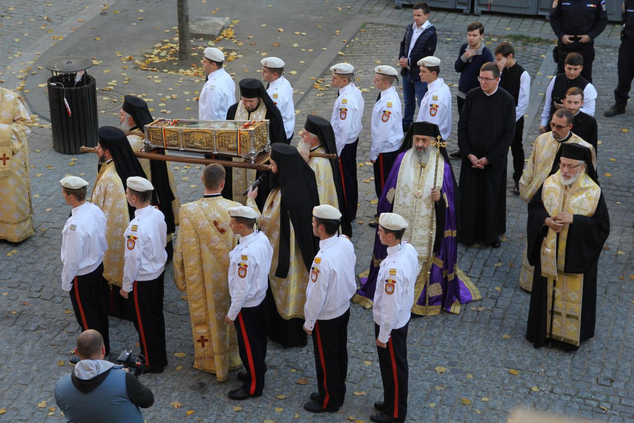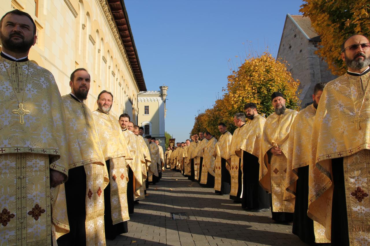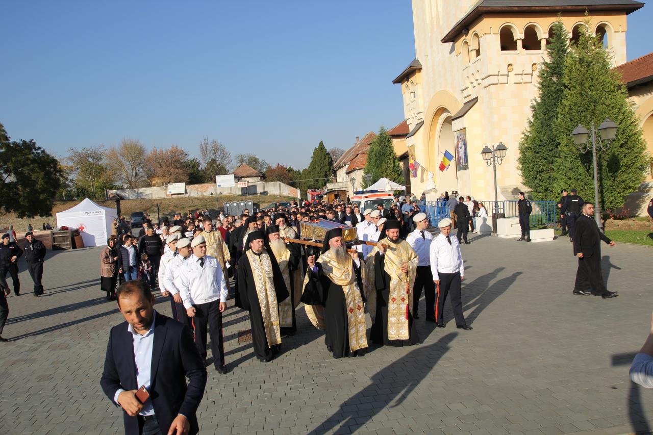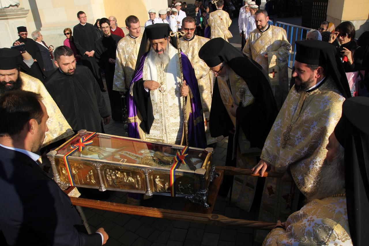 În după-amiaza zilei de vineri, 20 octombrie a.c, Înaltpreasfinţitul Părinte Irineu, Arhiepiscop al Alba Iuliei, înconjurat de clerul şi credincioşii din municipiul Alba Iulia, a întâmpinat delegaţia ce a însoţit racla cu sfintele moaşte ale Sfintei Muceniţe Filofteia de la Curtea de Argeş. Sfintele moaşte au fost aduse spre închinare în Cetatea Marii Uniri, cu binecuvântarea Preafericitului Părinte Daniel, Patriarhul Bisericii Ortodoxe Române, de o delegaţie condusă de Înaltpreasfinţitul Părinte Calinic, Arhiepiscop al Argeşului şi Muscelului. După întâmpinarea sfintelor moaşte, cei doi ierarhi, împreună cu sfinţiţi slujitori şi cu credincioşii prezenţi, au înconjurat Catedrala Arhiepiscopală, cântând troparul Sfintei Muceniţe Filofteia şi al Sfinţilor Mărturisitori Ardeleni. În cuvântul rostit cu acest prilej, Înaltpreasfinţitul Părinte Irineu a subliniat istoria zbuciumată a Transilvaniei, marcată de mari tensiuni confesionale, viaţa mucenicească a sfinţilor pomeniţi, precum şi datoria de a ne aminti de înaintaşii noştri, urmându-le credinţa şi faptele. De asemenea, Înaltpreasfinţitul Calinic a adresat celor prezenţi un cuvânt de învăţătură despre intensa viaţă duhovnicească din zonei Transilvaniei, subliniind în acelaşi timp unitatea, de credinţă şi de neam, a românilor din ambele părţi ale Munţilor Carpaţi. În continuare, a fost oficiată slujba Vecerniei cu Litia, urmată de Utrenie, Ceasul I şi Acatistul Sfintei Mucenițe Filofteia. Răspunsurile au fost oferite de corul Facultăţii de Teologie Ortodoxă din Alba Iulia, dirijat de părintele Domin Adam. Până luni dimineaţa, credincioșii se vor putea închina cinstitelor moaște.