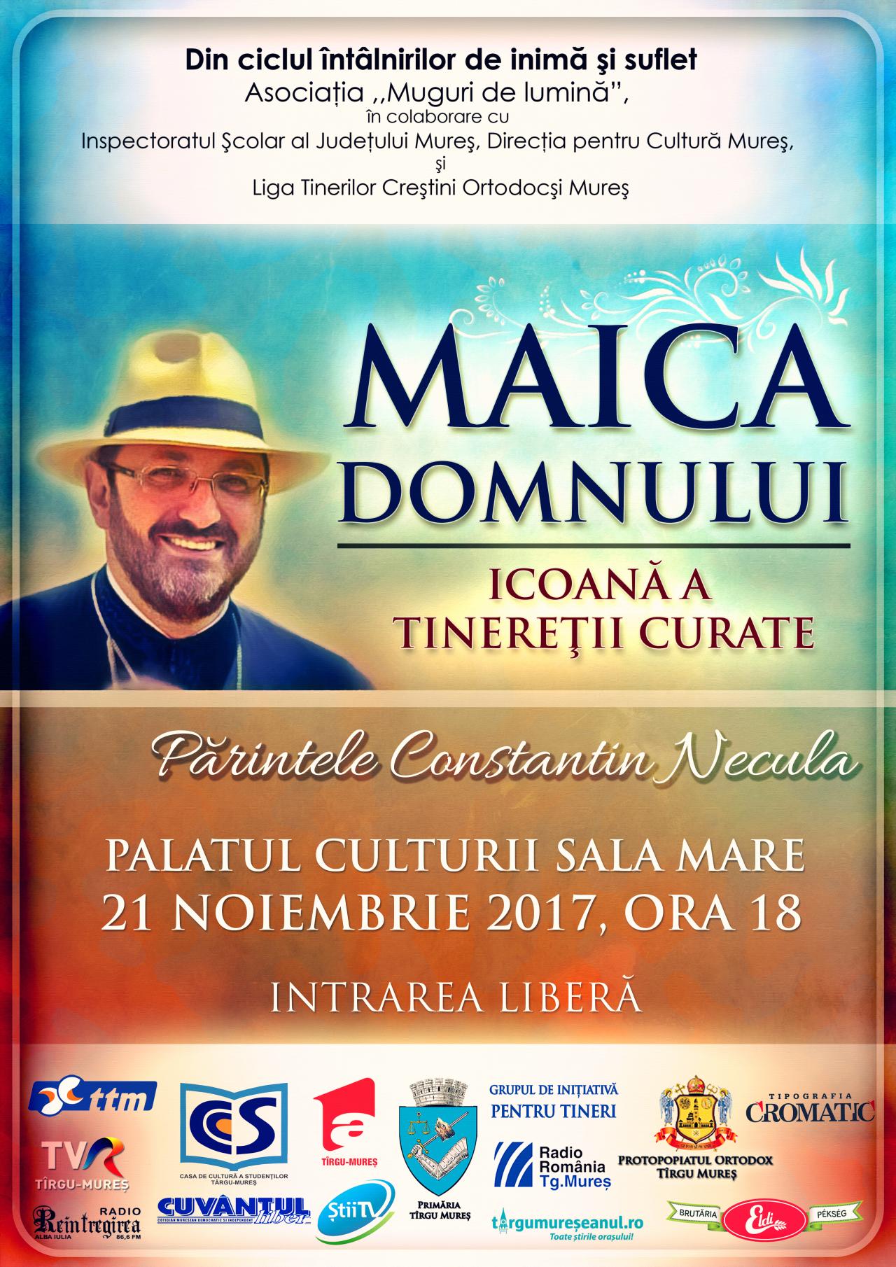 Marți, 21 noiembrie 2017, de la ora 18:00, cu binecuvântarea Înaltpreasfințitului Părinte Irineu, Arhiepiscop al Alba Iuliei, va avea loc conferința duhovnicească „Maica Domnului, Icoană a Tinereții Curate”. Conferința se va desfășura la Palatul Culturii din Târgu Mureș, Sala Mare, avându-l în calitate de invitat special pe Părintele Constantin Necula. Intarea este liberă.