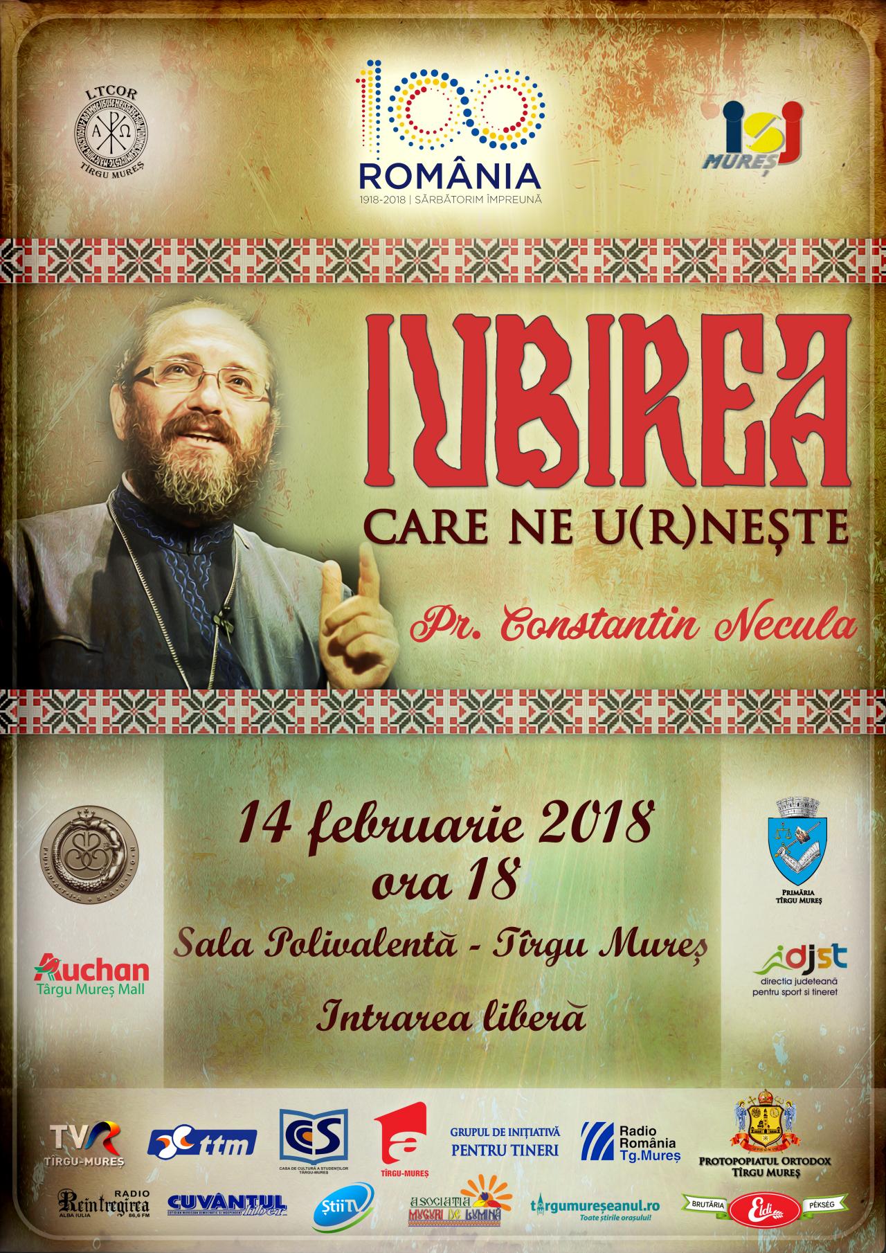 Miercuri, 14 februarie 2018, de la ora 18:00, la Sala Polivalentă din Târgu Mureș va avea loc o conferința duhovnicească. Titlul conferinței este „Iubirea care ne u(r)nește” și îl va avea în calitatea de invitat special pe Părintele Conf. Univ. Dr. Constantin Necula, de la Facultatea de Teologie Ortodoxă din Sibiu. Evenimentul are binecuvântarea Înaltpreasfințitului Părinte Irineu, Arhiepiscop al Alba Iuliei, și este organizat de Liga Tinerilor Creștini Ortodocși Români din Târgu Mureș în parteneriat cu Asociația Culturală „Muguri de Lumină”, Primăria Municipiului Tîrgu-Mureș, Inspectoratul Școlar Județean Mureș, Direcția Județeană pentru Tineret și Sport, Protopopiatul Ortodox Român Târgu Mureș și instituții media din localitate. Conferința se înscrie în șirul manifestărilor culturale dedicate Anului Omagial al Unității de Credință și de Neam și Anului Comemorativ al Făuritorilor Marii Uniri din 1918 [http://basilica.ro/2018-anul-omagial-al-unitatii-de-credinta-si-de-neam-si-anul-comemorativ-al-fauritorilor-marii-uniri-din-1918/] .