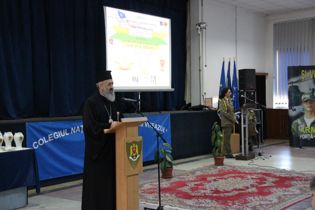 Marţi, 20 februarie a.c., în sala de festivităţi a Colegiului Naţional Militar „Mihai Viteazul” din municipiul Alba Iulia, a avut loc ceremonia dedicată aniversării celor 50 de ani de activitate ai Centrului Militar Judeţean Alba. Acest important eveniment s-a bucurat de prezenţa Înaltpreasfinţitului Părinte Irineu, Arhiepiscop al Alba Iuliei, alături de reprezentanţi ai autorităţilor locale, centrale şi judeţene, precum şi comandanţi ai unităţilor din sistemul naţional de apărare şi ordine publică. La această zi de sărbătoare au participat personalul Centrului Militar Judeţean Alba, dar şi foşti angajaţi, camarazi şi colaboratori. În cadrul ceremonialului au fost acordate diplome de onoare şi au fost premiaţi învingătorii competiţiei sportive desfăşurate cu acest prilej. Adresându-se celor prezenţi, Înaltpreasfinţia Sa a spus: „Mă bucur să fiu prezent, astăzi, la acest jubileu al Centrului Militar Judeţean Alba şi e firesc să fiu aici, pentru că slujitorii Bisericii au fost întotdeauna alături de slujitorii Armatei, convinşi fiind că Biserica şi Armata sunt pietre de hotar şi factori de echilibru ai vieţii sociale. Precum spunea vrednicul de pomenire Nicolae Colan, Mitropolitul Ardealului, „Biserica şi Armata sunt chemate să stea jertfelnic în slujba neamului, în tot chipul străduindu-se pentru neatârnarea lui”. Eu aş adăuga, cu smerenie, că Biserica şi Armata trebuie să se străduiască din răsputeri să lucreze spre folosul, bunul nume, prosperitatea şi demnitatea acestui neam aşezat de Dumnezeu în sânul carpatic şi la fereastra mării, Grădina Învierii sau Grădina Maicii Domnului. Când eram copil acasă de câte ori vedeam un ostaş sau un militar eram emoţionat şi priveam la el ca la un arhanghel şi cred că e firesc, pentru că Armata are o sacralitate şi nu pot concepe Armata fără drapelul ţării şi fără Sfânta Cruce, precum inspirat scria Andrei Mureşanu: „Preoţi cu crucea-n frunte / Că oastea e creştină”. Aşa am izbutit noi să străbatem veacuri vitrege şi să ajungem la minunate izbânzi. Acum este Anul centenar, 100 de ani de la marele eveniment al unirii Transilvaniei cu ţara-mamă. Suntem privilegiaţi că trăim acum, noi toţi, şi nu putem să nu ne gândim la ostaşii care s-au jertfit pentru libertate şi demnitate, căzând pe câmpul de luptă în Primul Război Mondial. Oasele lor stau la temelia României întregite. Vieţile lor, cum spunea cărturarul Onisifor Ghibu, sunt „pietre de temelie pe care se înalţă falnic clădirea României noastre de astăzi”. Amintindu-ne de toţi care s-au sacrificat pentru împlinirea visului de aur, Marea Unire, noi, care trăim astăzi, avem chemarea să apărăm identitatea naţională, tezaurul nostru etnic şi integritatea ţării, suveranitatea României, spre înaintarea progresivă şi întărirea unităţii noastre sufleteşti a întregului neam românesc. Se cer din partea noastră credinţă tare în Dumnezeu şi iubire jertfelnică pentru glia străbună. Cu ocazia acestui eveniment festiv, felicit pe domnul comandant şi urez domniei sale şi tuturor ostenitorilor acestei nobile instituţii, sănătate, spor în cele bune şi împliniri binecuvântate. Fie ca harul, pacea şi îndurarea Dumnezeului Savaot să ne adumbrească pe toţi”.