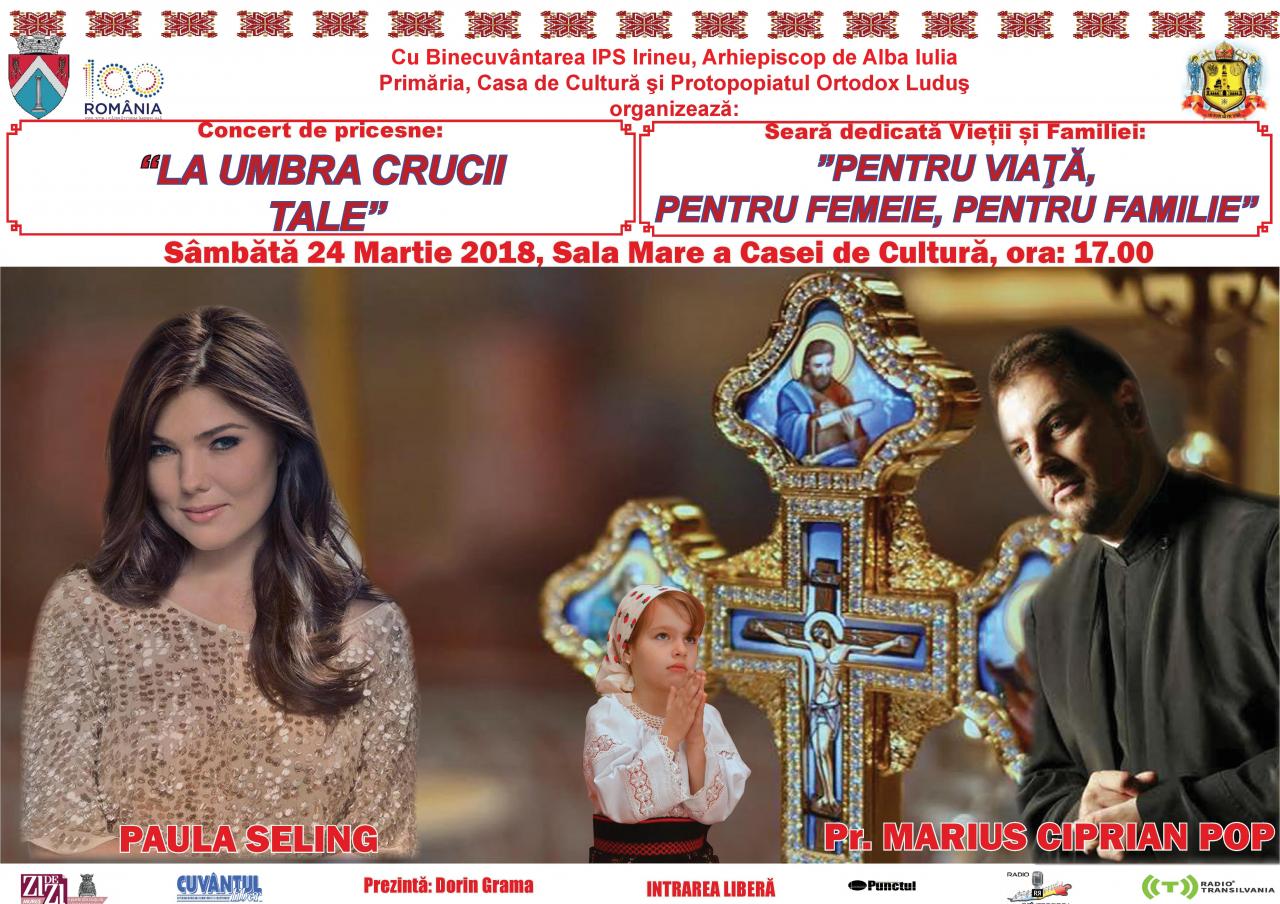 Evenimentul va avea loc la Casa de Cultură „Pompeiu Hărășteanu” din orașul Luduș, unde se va desfășura un recital de pricesne intitulat „La umbra Crucii Tale”, în interpretarea solistei Paula Seling și a pr. Marius Ciprian Pop. Părintele va susține și o prelegere despre importanţa familiei tradiţionale, a naşterii de prunci şi a vieţii umanee. Întreaga activitate, aflată la cea de a III-a ediţie, este organizată de Primăria Luduș, Casa de Cultură „Pompeiu Hărăşteanu” și Protopopiatul Ortodox Român Luduş. Dorin Grama