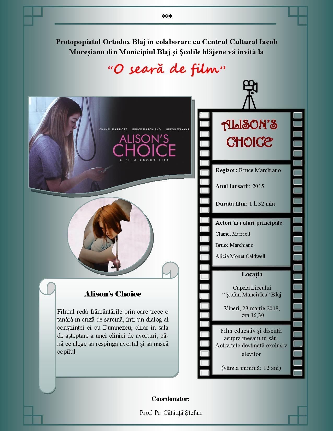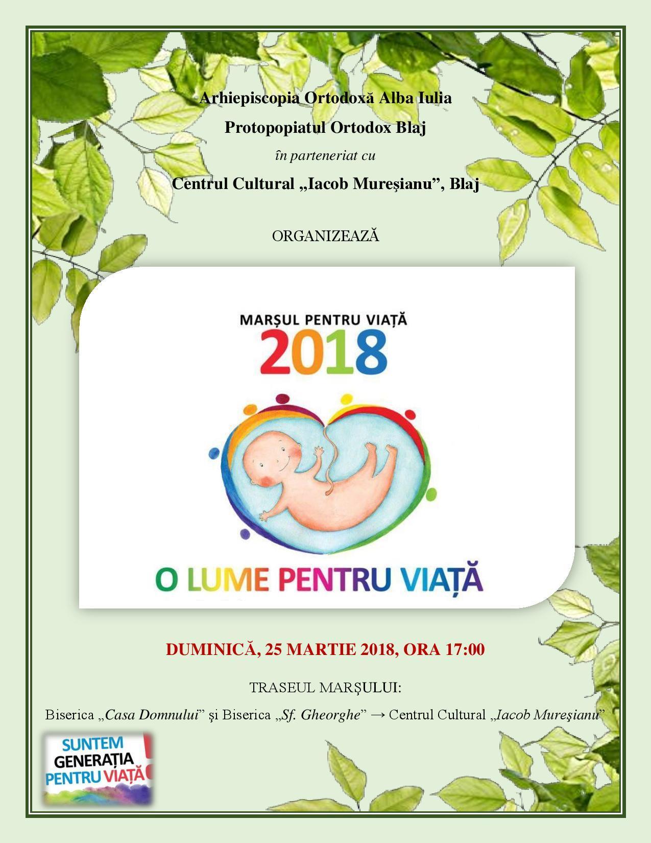 Cu binecuvântarea Înalpreasfințitului Părinte Irineu, Arhiepiscop al Alba Iuliei, Protopopiatul Blaj, organizează o serie de activăți ce se înscriu în tematica lunii martie, de promovare a vieții și sprijinirea mamei însărcinate. Vineri este programat un seminar "Provita" în cadrul căruia vor participa elevii din cadrul Liceului Tehnologic Jidvei, iar ulterior, la ora 13.30, în capela unităţii de învăţământ, va avea loc proiecţia filmului "Alegerea lui Alison". Filmul redă framântârile prin care trece o tânără aflată în criză de sarcină, într-un dialog al conştiinţei ei cu Dumnezeu, chiar în sala de aşteptare a unei clinici de avorturi, până ce alege să respingă avortul şi să dea naştere copilului. Duminică, de la ora 17, în Municipiul Blaj, va avea loc "Marșul pentru Viață".Acesta va avea ca punct de plecare a participanților Biserica cu hramul "Adormirea Maicii Domnului", respectiv Biserica cu hramul "Sfântul Gheorghe". După slujba Acatistului Buneivestiri, desfășurat în intervalul orar 17 - 17,30, participanții vor porni spre Centrul Cultural "Iacob Mureșianu". Între orele 18 - 19, în interiorul Centrului Cultural, se va desfăsura un program "pentru viață" care va cuprinde mesajul Înaltpreasfințitului Irineu, intervenții ale unor invitați speciali, proiectarea unui film de scurt metraj și altele. Acest eveniment va încununa acțiunile desfășurate în această săptămână la Blaj.