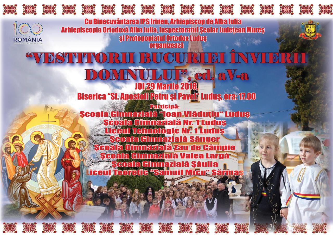 Joi, 29 martie a.c., de la ora 17:00, la biserica „Sf. Apostoli Petru şi Pavel” din orașul Luduş, cu binecuvântarea Înaltpreasfințitului Părinte Irineu, Arhiepiscop al Alba Iuliei, va avea loc cea de a V-a ediţie a festivalului-concurs „Vestitorii bucuriei Învierii Domnului”, organizat de Protopopiatul Ortodox Român Luduş, în colaborare cu Inspectoratului Şcolar Judeţean Mureş, reprezentat de părintele Dorin Chiorean, Inspector de Religie, şi Casa de Cultură „Pompeiu Hărăşteanu” Luduş.