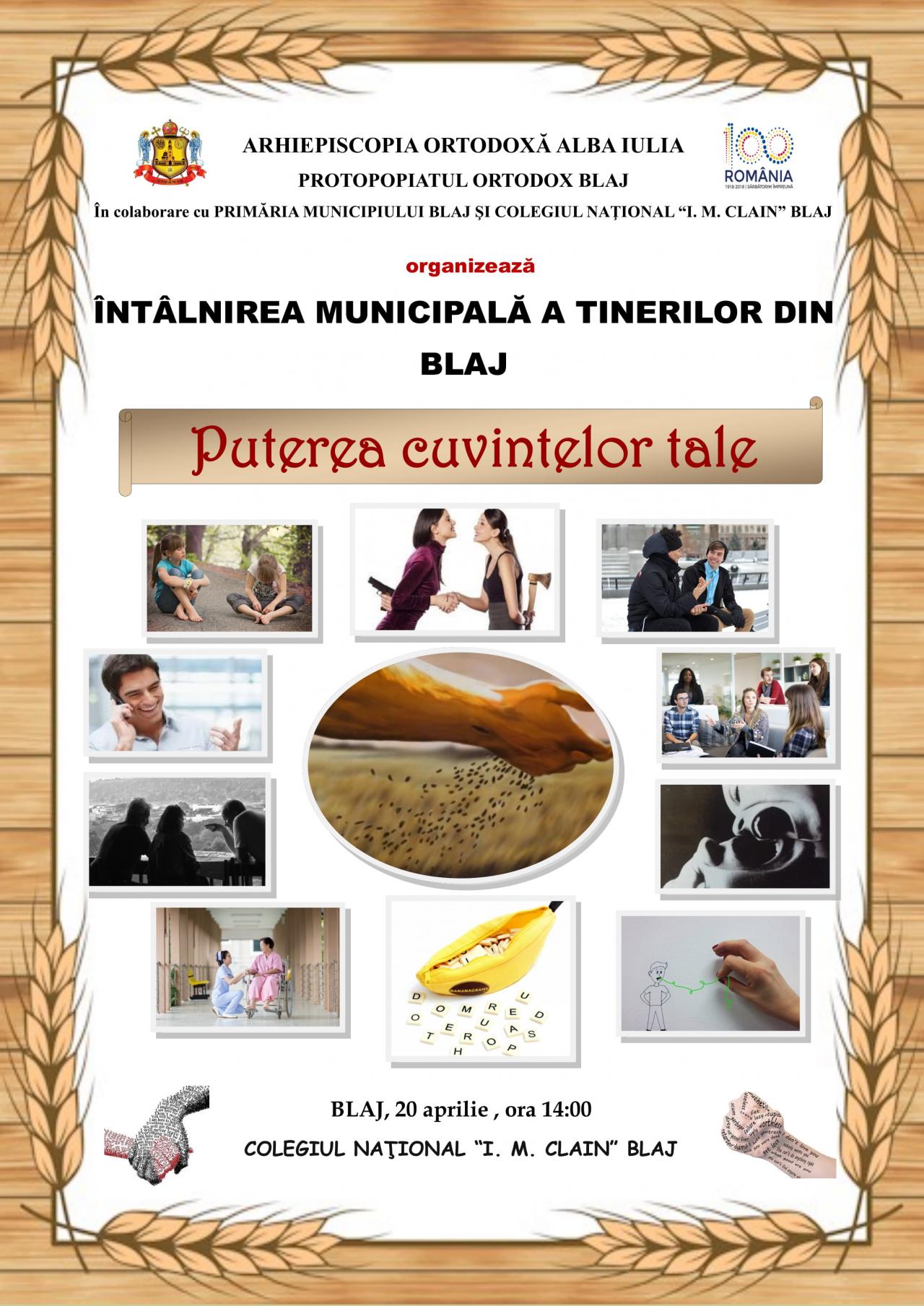 Cu binecuvântarea Înaltpreasfințitului Părinte Irineu, Arhiepiscop al Alba Iuliei, grupul de iniţiativă al Protopopiatului Ortodox Blaj organizează vineri, 20 aprilie 2018, a cincea ediție a Întâlnirii Municipale a Tinerilor din Blaj. Acest eveniment anual dedicat tinerilor se va desfășura în parteneriat cu Primăria Muncipiului Blaj și cu Colegiul Național I. M. Clain din Blaj. Tema întâlnirii din anul acesta va fi Puterea cuvintelor tale. Astfel, toate activitățile ce vor alcătui programul întâlnirii vor gravita în jurul acestei teme centrale. Cuvântul este puterea prin care noi creem sau distrugem. Cuvântul este darul care vine direct de la Dumnezeu: La început a fost cuvântul şi cuvântul era la Dumnezeu şi Dumnezeu era cuvântul (Ioan 1, 1). Cuvântul e puterea pe care o avem de a ne exprima şi de a comunica, de a gândi şi de a crea evenimentele din viaţa noastră. Cuvântul e cea mai puternică unealtă pe care o are omul. Cuvântul reprezintă manifestarea fiinţei noastre spirituale, scânteia divină din interiorul nostru. Cuvântul nostru poate crea cel mai frumos vis şi realitate, dar poate şi să distrugă tot ce există în jurul nostru. În debutul evenimentului, părintele Lucian Borșan, preot la Paraclisul Sf. Cuv. Paraschiva al Spitalului Municipal Blaj se va adresa tinerilor, iar mai apoi activitățile vor continua pe grupe, în sălile de clasă. Tinerii vor interacționa cu animatorii: preoți, profesori și alți voluntari implicați în acest proiect. Ca feed-back din partea tinerilor va fi organizat un concurs de aforisme, proverbe și ziceri asupra temei propuse și vor fi diseminate imformațiile. Gazda evenimentului va fi și în acest an Colegiul National I. M. Clain unde sunt așteptați aproximativ 150 de tineri din municipiul Blaj și împrejurimi, cărora intenționăm să le prezentăm alternativa sănătoasă asupra modului de gândire și de exprimare într-o societate internautică predispusă dialogului virtual, în dauna dialogului comuniunii prin viu grai.