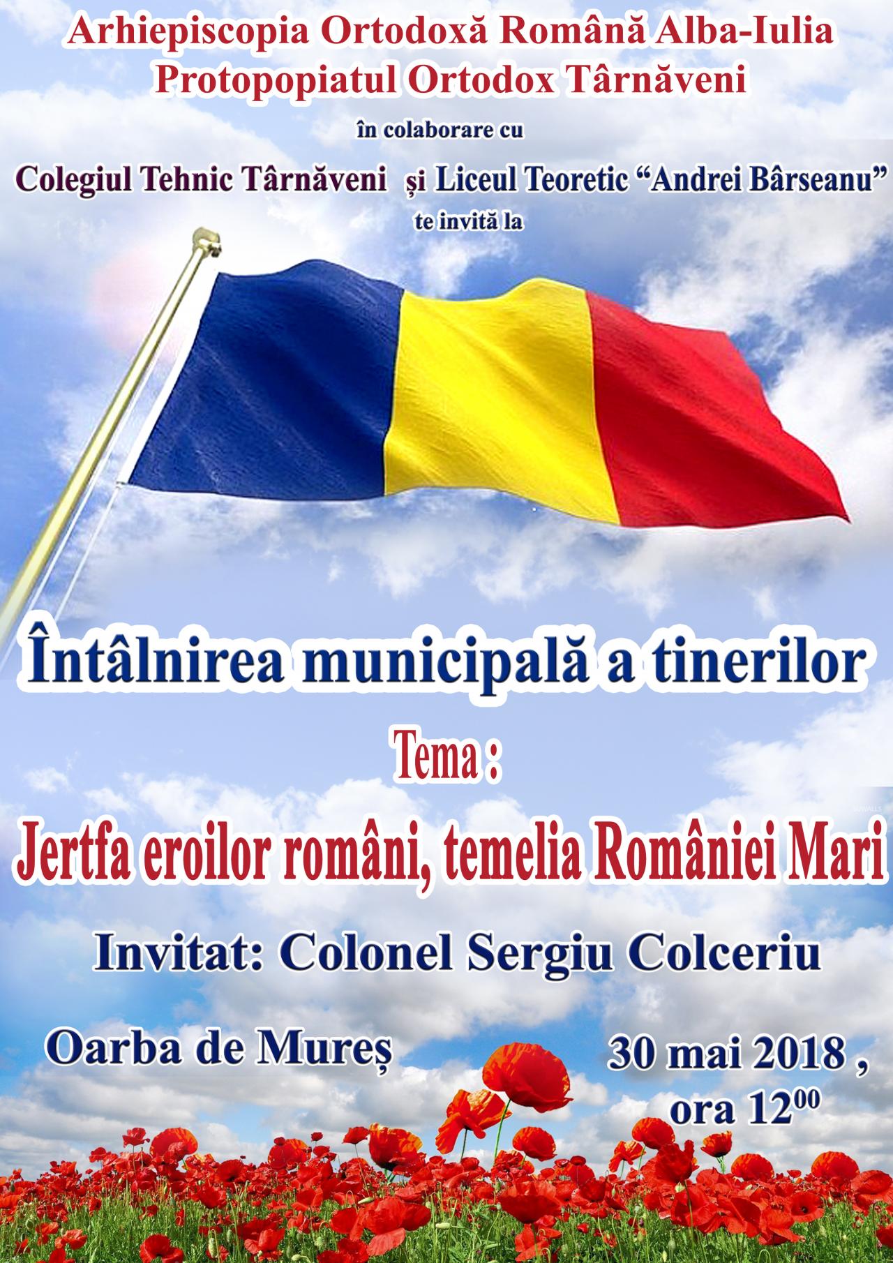 Cu binecuvântarea Înaltpreasfințitului Părinte Irineu, Arhiepiscop al Alba Iuliei, miercuri, 30 mai a.c., a avut loc Întâlnirea municipală a tinerilor din Târnăveni, ediția a VII-a. Evenimentul, organizat de Protopopiatul Târnăveni prin Grupul de inițiativă pentru misiune și tineret, în colaborare cu Colegiul Tehnic și Liceul Teoretic „Andrei Bârseanu” din Târnăveni, s-a desfășurat anul acesta la Monumentul Eroilor de la Oarba de Mureș, tematica întâlnirii Jertfa eroilor români- temelia României Mari, gravitând în jurul temei centrale a Anului Centenar 2018, proclamat de Sfântul Sinod al Bisericii Ortodoxe Române ca Anul omagial al unității de credință și de neam și Anul comemorativ al făuritorilor Marii Uniri din 1918.