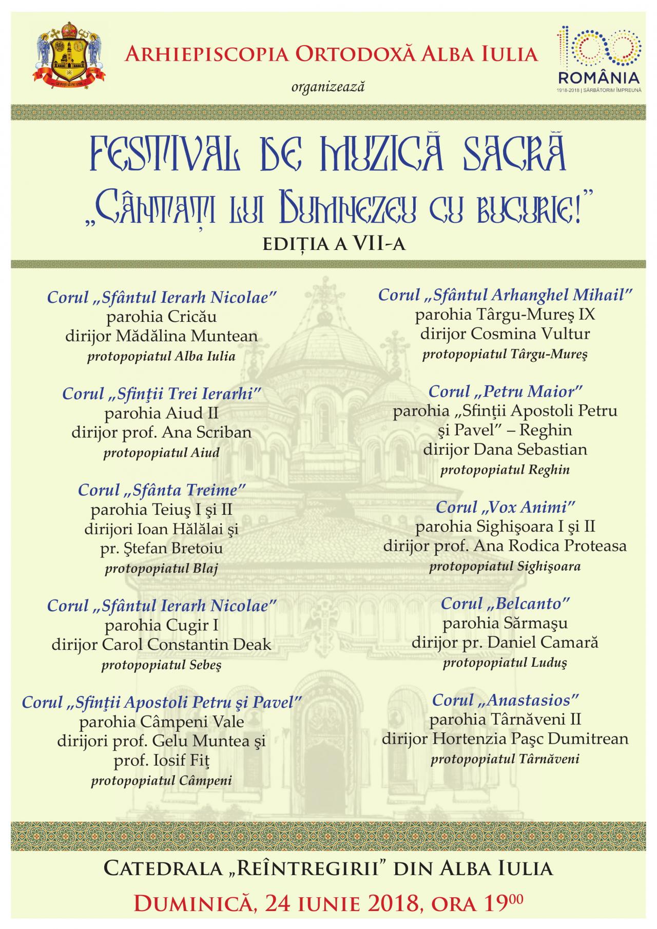 În contextul serbării Anului Centenar al Marii Uniri din 1918, cea de-a a VII-a ediție a Festivalului de Muzică Sacră „Cântați lui Dumnezeu cu bucurie!” va aduce înaintea publicului iubitor de muzică religioasă zece formații corale din întreg cuprinsul Eparhiei Alba Iuliei. Cu binecuvântarea și prin purtarea de grijă a Părintelui Arhiepiscop Irineu, duminică, 24 iunie 2018, începând cu ora 19:00, în Catedrala Reîntregirii din Cetatea Marii Uniri, vor răsuna armonios glasurile membrilor corurilor parohiale din fiecare protopopiat din județele Alba și Mureș.
