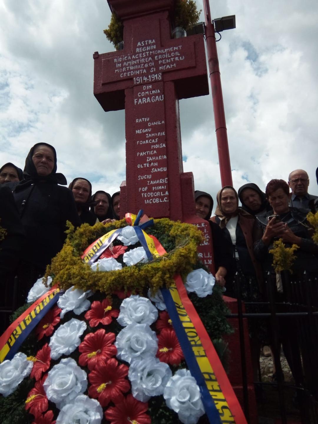 Pentru a înlesni această reflecție, după încheierea Sfintei Liturghii, poporul dreptcredincios s-a deplasat la intrarea dinspre Reghin în localitate, unde veghează un monument din piatră, ridicat în anul 1935 din îndemnul doctorului Eugen Nicoară, cu sprijinul ASTRA Reghin – o cruce pe care se află consemnate numele eroilor români din Fărăgău căzuți în Primul Război Mondial. Acest monument a fost restaurat și înfrumusețat prin arborarea unui falnic drapel. Aici a fost oficiată o slujbă de pomenire a eroilor de către preotul paroh Hadrian-Horațiu Mălinaș, împreună cu preoți din parohiile învecinate, Pr. Silviu Florea din parohia Milășel și Pr. Cristian-Vasile Moldovan din parohia Ercea.
