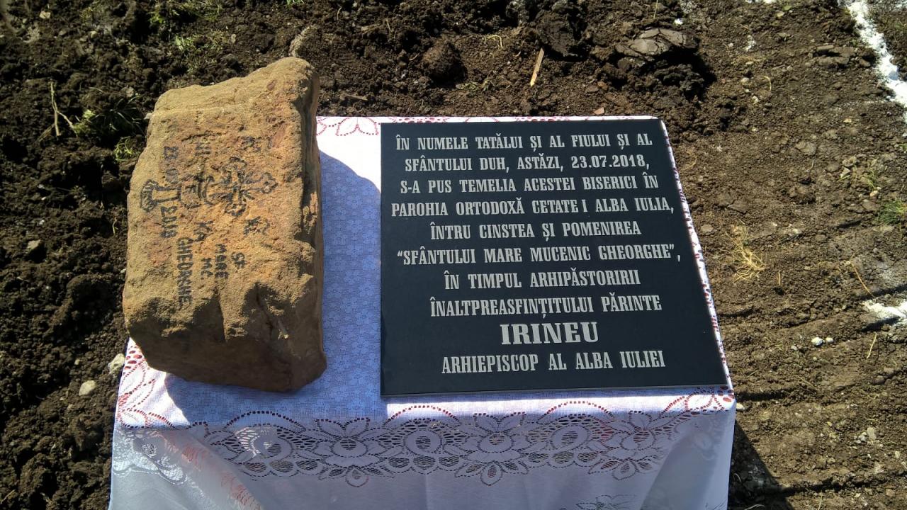 Luni, 23 iulie a.c., Înaltpreasfințitul Părinte Irineu, Arhiepiscop al Alba Iuliei, a oficiat slujba punerii pietrei de temelie pentru noua biserică ce va purta hramul „Sfântul Mare Mucenic Gheorghe, Purtătorul de biruință” din parohia Cetate I - Alba Iulia. La acest eveniment deosebit, alături de preoții slujitori, părintele Ilarie Moldovan și părintele Alexandru Moldovan, au luat parte un frumos sobor de preoți și numeroși credincioși care s-au bucurat de binecuvântarea Arhipăstorului Alba Iuliei și au adus laudă lui Dumnezeu la începututul acestei lucrări prin care zidesc un nou locaș de închinare ce reprezintă un act de statornicie în dreapta credință, de dragoste față de Dumnezeu, față de neam și  față de patrie. În cuvântul de învățătură pe care l-a rostit, Arhipăstorul nostru a subliniat importanța locașului de cult pentru nevoile spirituale ale credincioșilor, oferindu-li-se privilegiul de a se putea întâlni cu Dumnezeul Cel viu și de a se putea bucura de darurile și splendorile Împărăției veșnice.