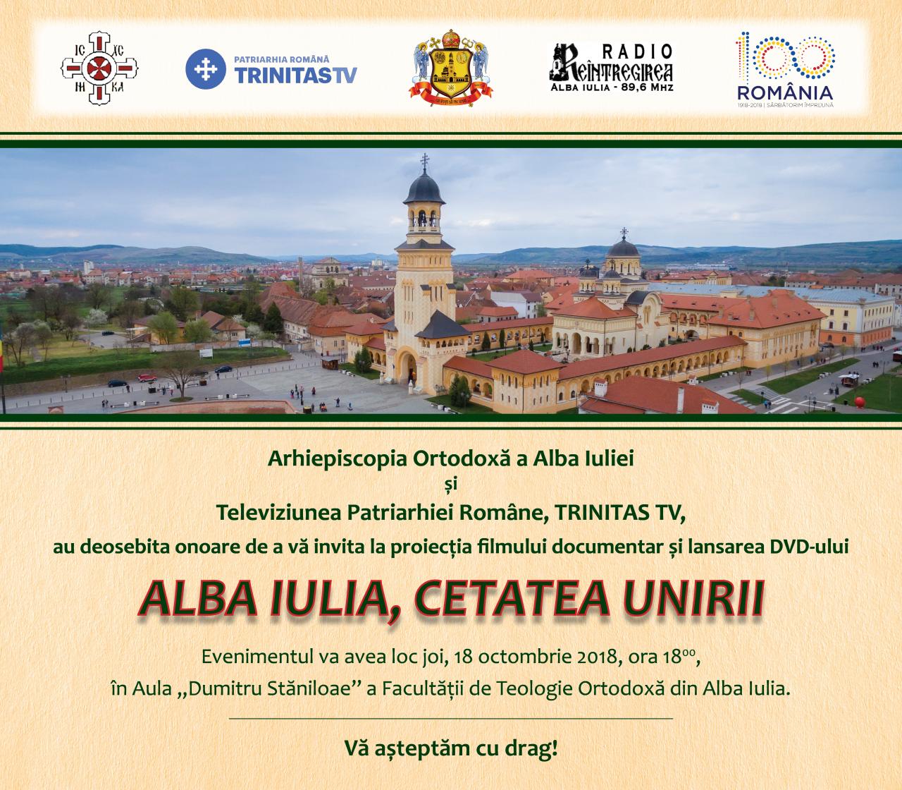 Arhiepiscopia Ortodoxă de Alba Iulia și Televiziunea Patriarhiei Române, TRINITAS TV, vă invită, joi, 18 octombrie 2018, la proiecția filmului documentar „Alba Iulia, Cetatea Unirii”, prilej cu care va avea loc și lansarea DVD-ului. Evenimentul va avea loc în Aula „Dumitru Stăniloae” a Facultății de Teologie Ortodoxă din Alba Iulia, începând cu ora 18.00, intrarea fiind liberă. Premiera filmului a avut loc în data de 16 septembrie a.c., la București, în cadrul Festivalului „Strada de C’Arte” și al Festivalului Capitalelor Națiunilor Centenare, organizat de Biblioteca Centrală Universitară „Carol I” și Muzeul Național al Literaturii Române.