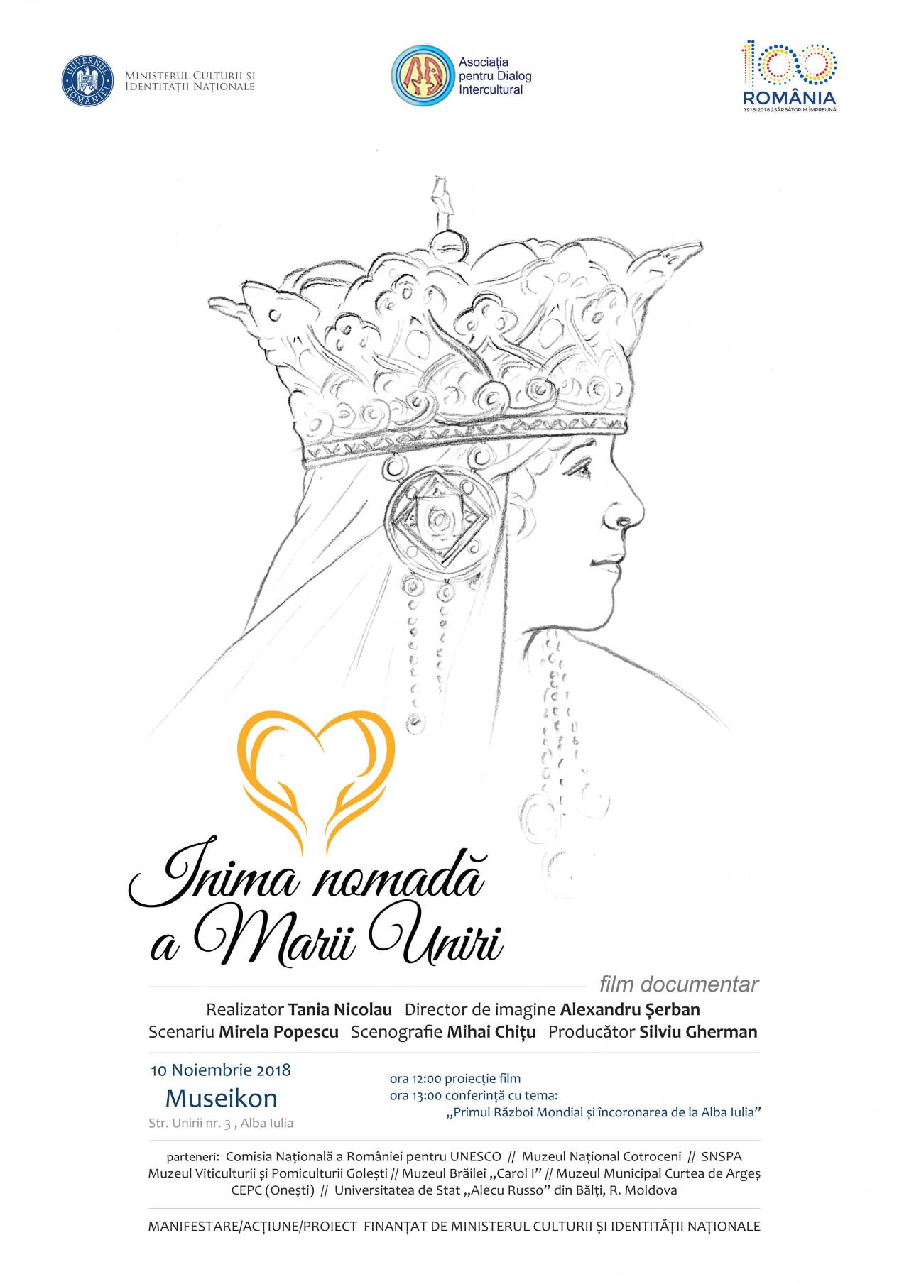 Sâmbătă, 10 noiembrie a.c., va avea loc, începând cu ora 12.00, la Muzeul icoanei și al cărții vechi din Alba Iulia, Museikon, proiecția filmului documentar „Regina Maria – inima nomadă a Marii Uniri”. Pelicula reprezintă o producție a proiectului intitulat „Inima Nomadă a Marii Uniri”, finanțat de Ministerul Culturii și Identității Naționale cu prilejul aniversării Centenarului Marii Uniri.