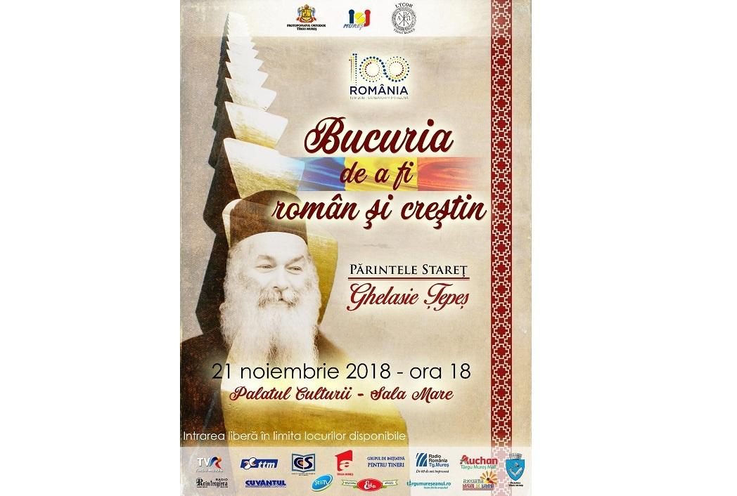 Cu binecuvântarea Înaltpreasfințitului Părinte Irineu, Arhiepiscop al Alba Iuliei, va avea loc, miercuri, 21 noiembrie a.c., începând cu ora 18.00, conferința duhovnicească intitulată „Bucuria de a fi român și creștin”. Evenimentul se va desfășura în Sala Mare a Palatului Culturii din municipiul Târgu-Mureș și îl va avea ca invitat special pe părintele arhimandrit Ghelasie Țepeș, starețul Mănăstirii „Sfântul Mare Mucenic Dimitrie” din Sighișoara.