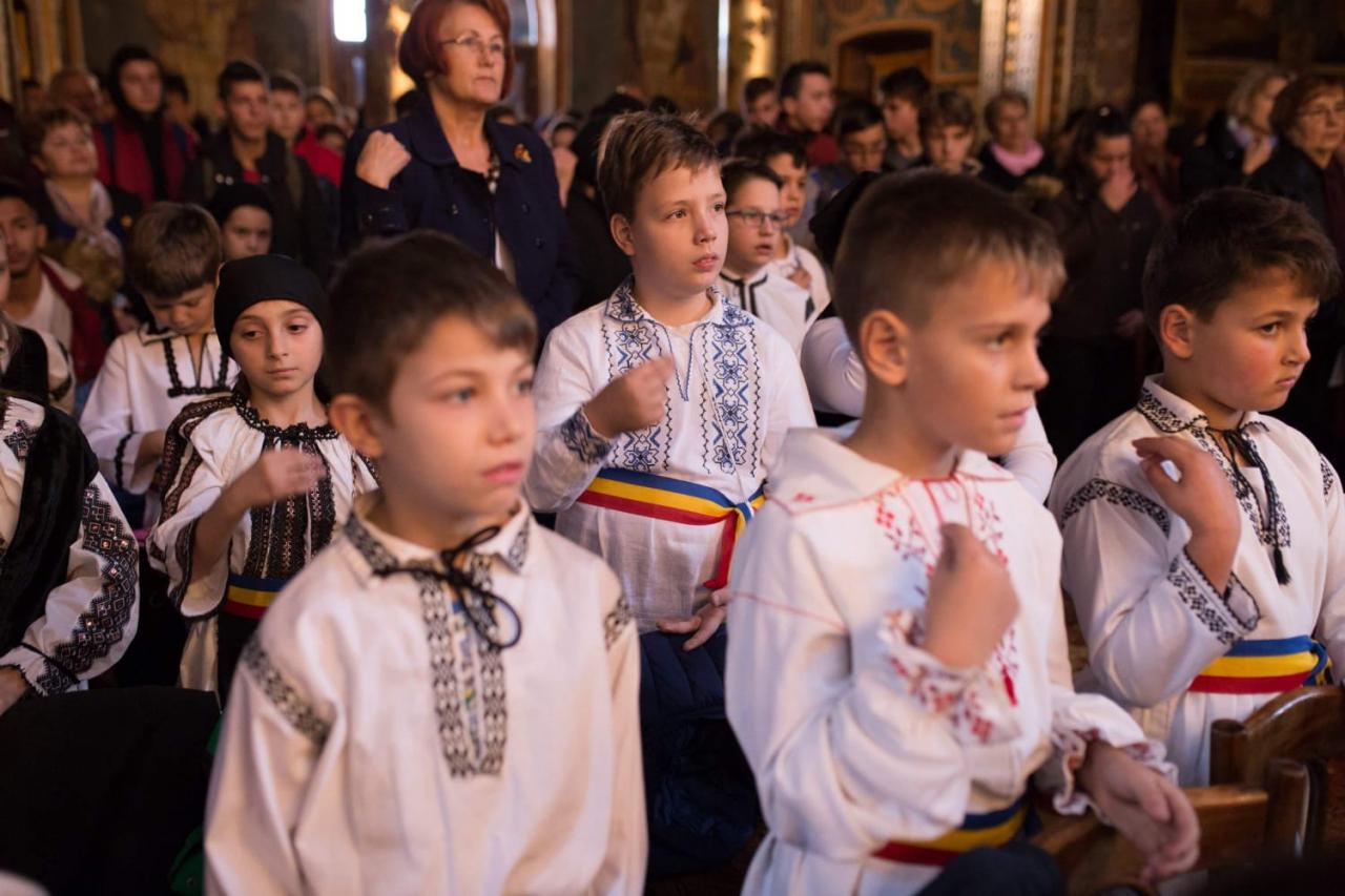 Primiţi tradiţional, cu pâine şi sare, de către elevii clasei a II-a A din cadrul Școlii Gimnaziale „Lucian Blaga” din localitate, îmbrăcaţi în costume populare româneşti, toţi cei ce au trecut pragul bisericii au primit pliante şi fundiţe tricolore. Acţiunea culturală a debutat prin săvârşirea unei slujbe de Te-Deum de către părintele Ioan Bogdan, protopop al Aiudului, însoţit de un frumos sobor de preoţi din oraş şi din împrejurimi. Profunde rugăciuni s-au înălţat cu solemnitate spre ceruri, rugăciuni de mulţumire pentru făuritorii Marii Uniri și pentru înaintaşii care au luptat şi au reuşit să întregească România. S-a remarcat prezenţa celor trei piloni importanţi ai societăţii: Biserica, Şcoala şi Comunitatea. Alături de credincioşii prezenţi, copiii de clasele primare şi elevii de liceu au fost cei care au adus bucurie în biserica noastră.