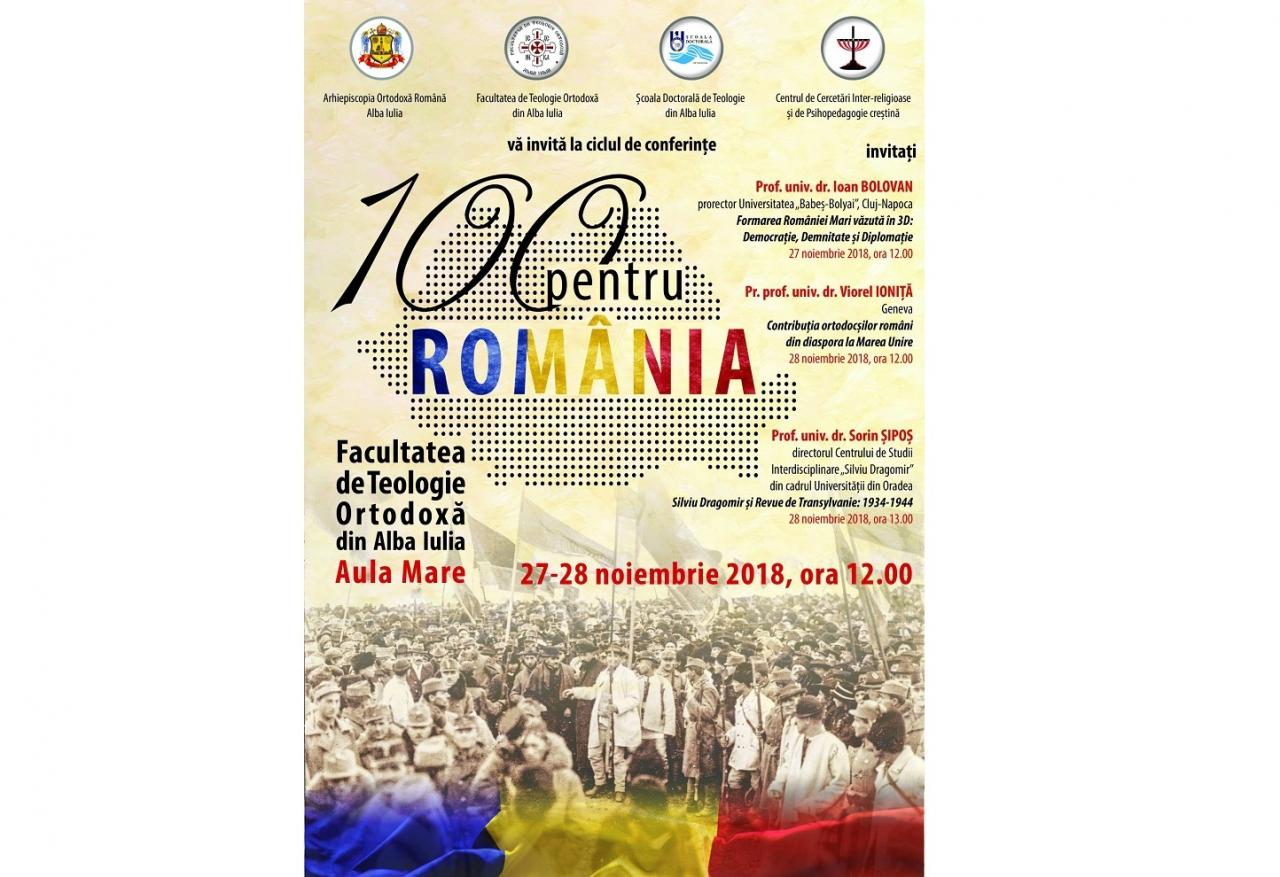Cu binecuvântarea Înaltpreasfințitului Părinte Irineu, Arhiepiscop al Alba Iuliei, va avea loc, în zilele de 27 și 28 noiembrie a.c., o serie de conferințe dedicate Centenarului Marii Uniri, aflate sub genericul „100 pentru România”. Manifestarea de față este organizată de către Arhiepiscopia Ortodoxă a Alba Iuliei și Facultatea de Teologie Ortodoxă din Alba Iulia, în colaborare cu Școala Doctorală de Teologie din Alba Iulia și Centrul de Cercetări Inter-religioase și de Psihopedagogie Creștină. Conferințele se vor desfășura în Aula „Dumitru Stăniloae” a Facultății de Teologie Ortodoxă din Alba Iulia, începând cu ora 12.00.