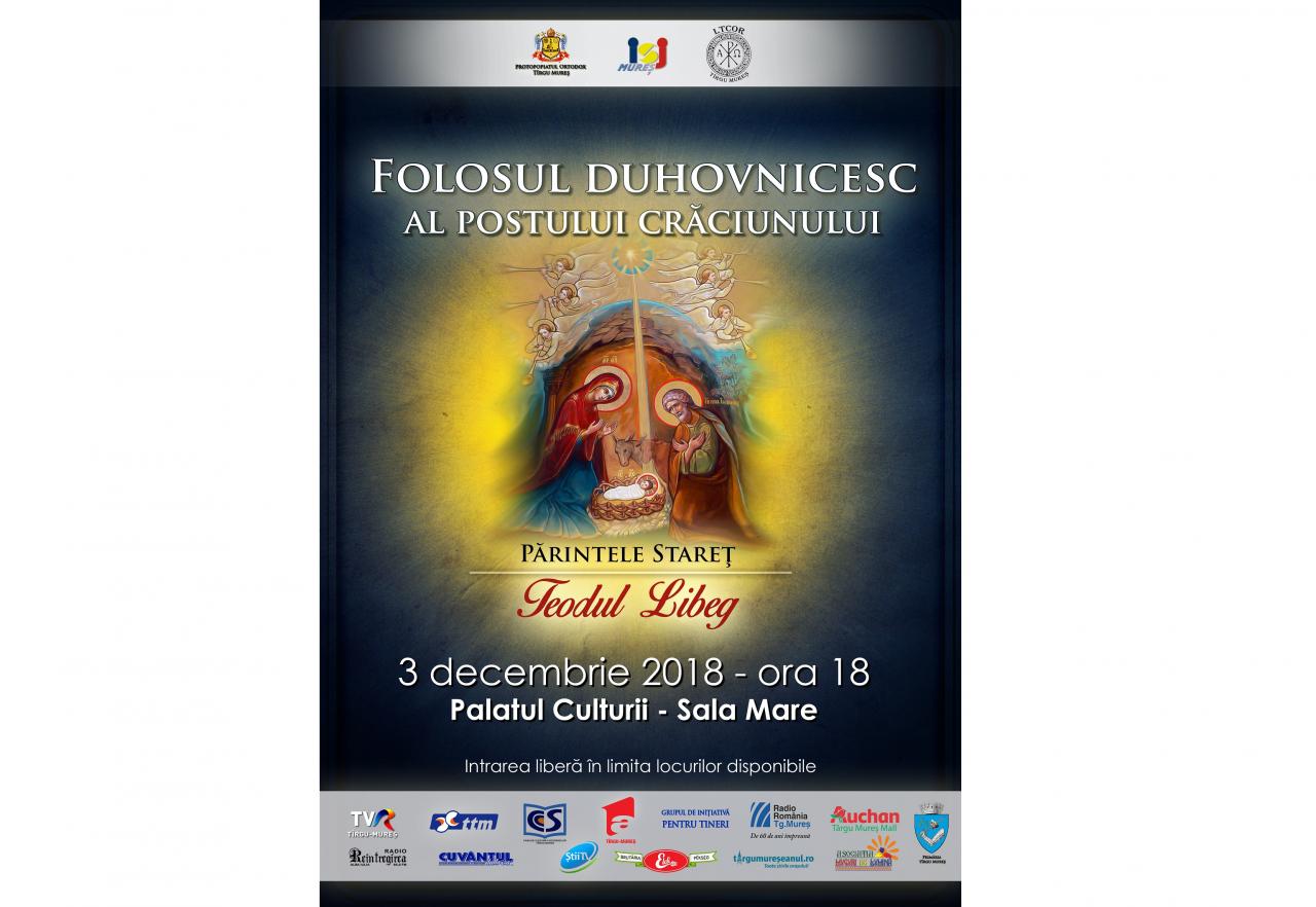 Cu binecuvântarea Înaltpreasfințitului Părinte Irineu, Arhiepiscop al Alba Iuliei, va avea loc, luni, 3 decembrie a.c., începând cu ora 18.00, conferința duhovnicească intitulată „Folosul duhovnicesc al Postului Crăciunului”. Evenimentul se va desfășura în Sala Mare a Palatului Culturii din municipiul Târgu-Mureș, avându-l ca invitat special pe părintele protosinghel Teodul Libeg, starețul Mănăstirii „Adormirea Maicii Domnului” de la Sânmărtinul de Câmpie.