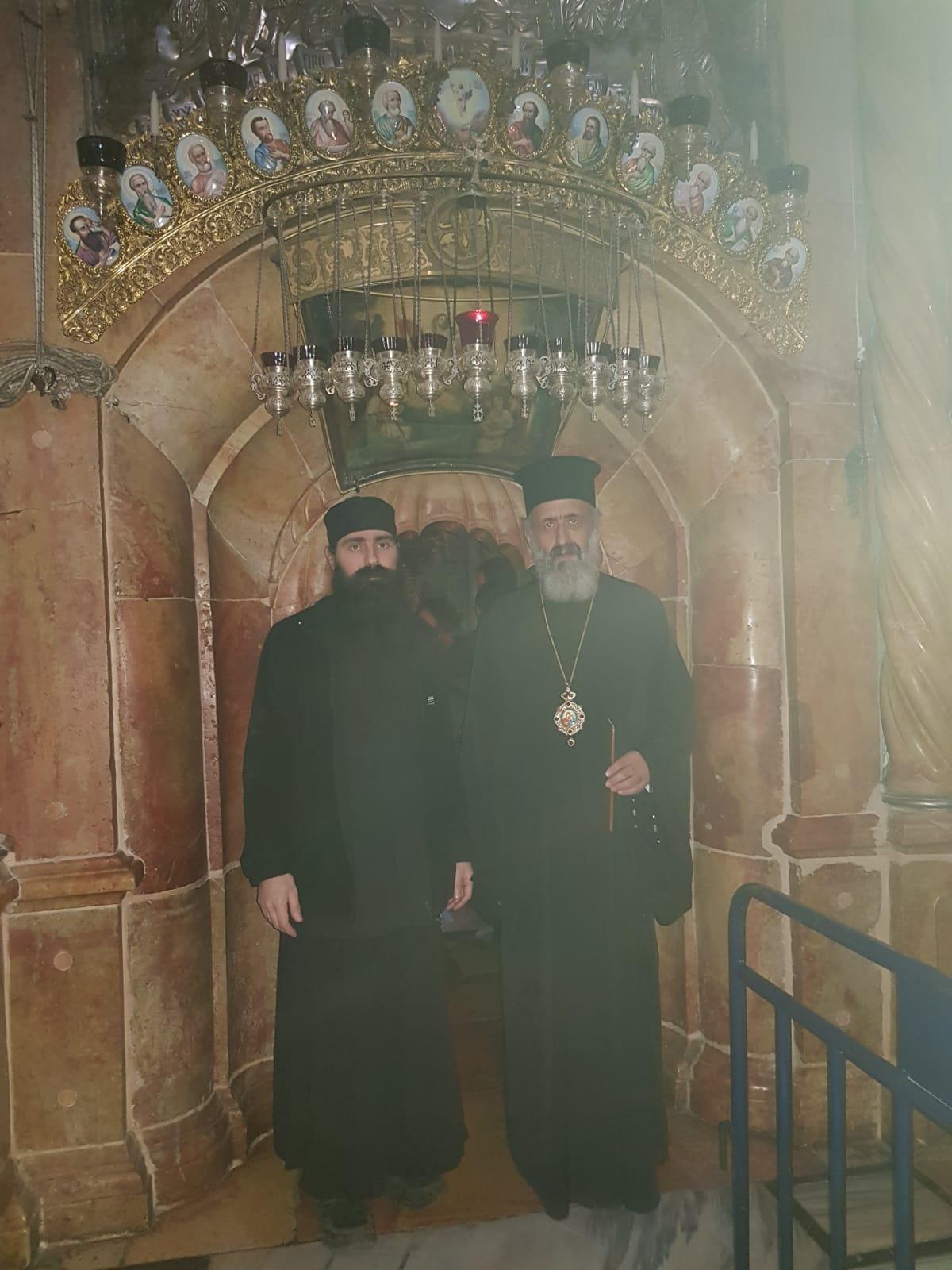 Vizitând locul unde, timp de trei zile, a zăcut trupul lui Iisus, credincioșii pelerini au putut observa inscripțiile imprimate deasupra Mormântului Sfânt, cuvinte care constituie veritabile concentrări ale energiilor dumnezeiești în Mormântul de viață dătător. Aceste însemnări conțin următoarele mesaje, atât de cunoscute în istoria mântuirii: „Ce căutați? Pe Iisus Nazarineanul Cel răstignit? A înviat. Nu este aici! Iată locul unde L-au pus!”; „Învierea Ta, Hristoase, Mântuitorule, îngerii o laudă în ceruri, și pe noi, pe pământ, ne învrednicește, cu inimă curată, să Te slăvim”; „Ca un purtător de viață și mai înfrumusețat decât raiul, cu adevărat, și decât toată cămara împărătească mai luminat s-a arătat, Hristoase, Mormântul Tău, izvorul învierii noastre”. De asemenea, deasupra intrării se regăsește inscripția: „Pomenește, Doamne, pe robul Tău, meșterul împărătesc H. Comnenos din Mitylene. 1810”. În curtea Basilicii Sfântului Mormânt se află și un paraclis închinat Sfântului Apostol Iacob, primul episcop al Ierusalimului. Cu acest prilej, Ierarhul nostru, însoțit de credincioșii pelerini, s-a închinat în acest sfânt locaș de rugăciune.