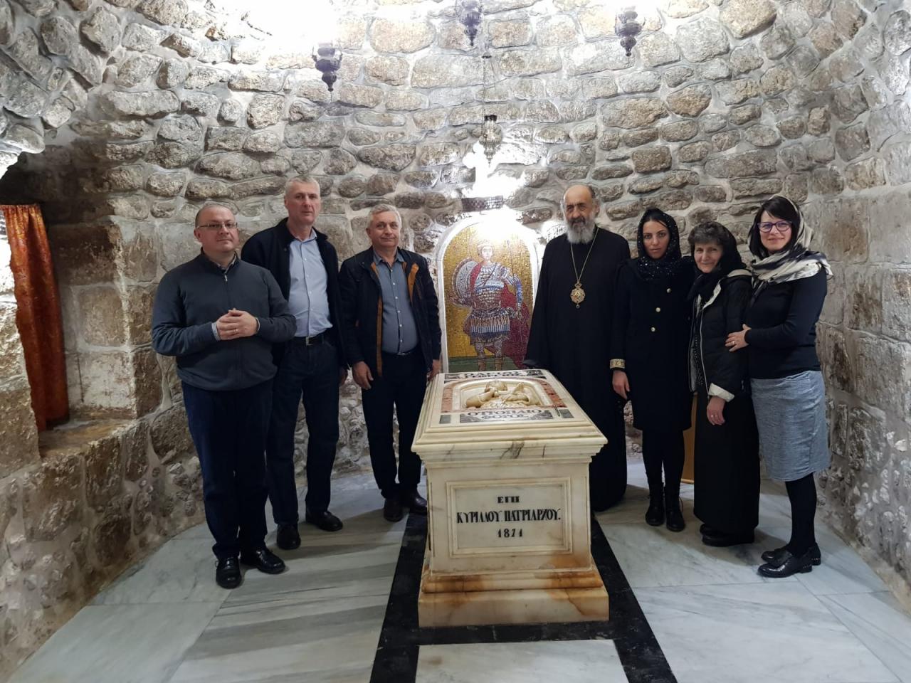 Continuând pelerinajul, Părintele Arhiepiscop Irineu, dimpreună cu grupul de clerici și credincioși din Eparhia noastră, a vizitat Biserica „Sfântul Mare Mucenic Gheorghe” din Lydda. Conform tradiției, primul locaș de închinare ridicat aici a fost distrus de către cruciați. Rămășițele acelei biserici au fost dobândite de către greci în anul 1873, pe acele ruine având să fie ridicat, în anul 1893, actualul locaș de cult. Aflați în vizită în acest loc binecuvântat, credincioșii s-au putut închina la mormântul celui supranumit „purtătorul de biruință”, venerând cu multă evlavie cinstitele sale moaște. În cuvântul rostit celor prezenți, Arhipăstorul nostru a îndemnat la imitarea credinței și a faptelor Sfântului Mare Mucenic Gheorghe, prin intermediul cărora putem dobândi biruința asupra vieții și cununa slavei pe arena de luptă a acestei lumi.