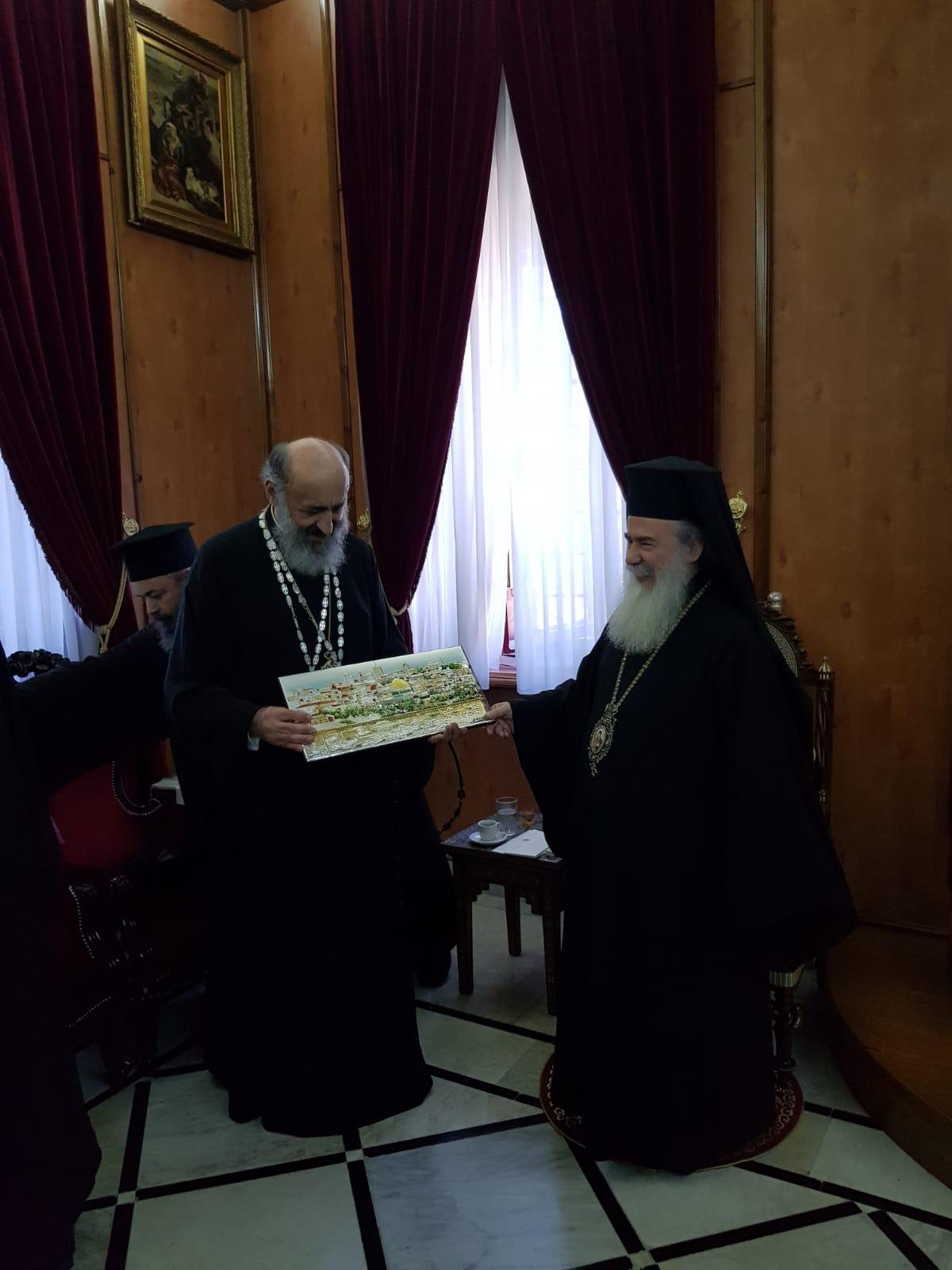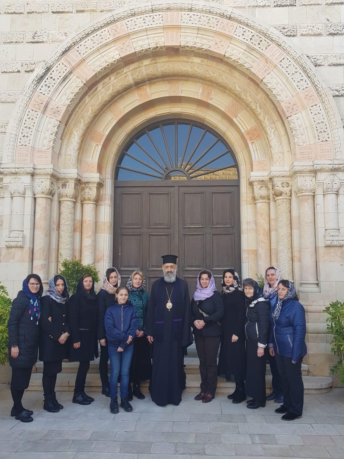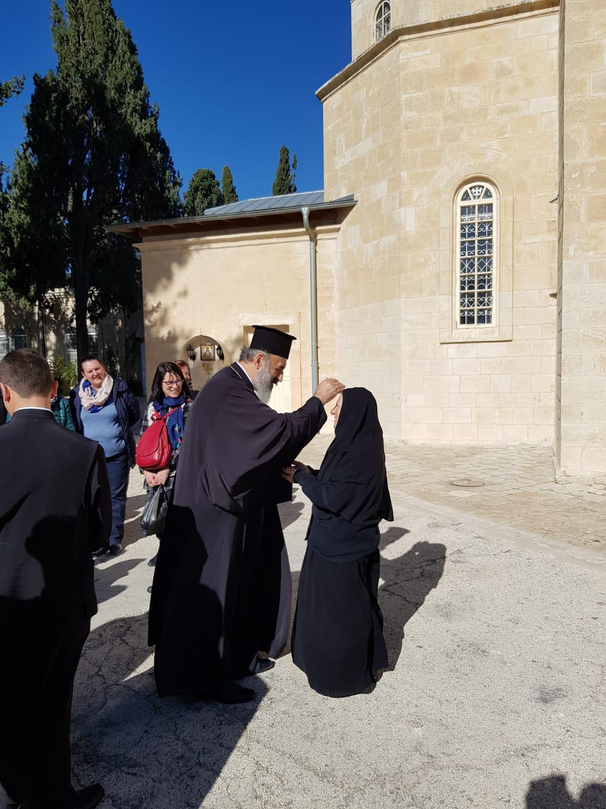 Continuând pelerinajul, Părintele Arhiepiscop Irineu, însoțit de grupul de pelerini, a vizitat Reședința Patriarhală de la Ierusalim, unde a fost întâmpinat cu multă bucurie și dragoste frățească în Hristos-Domnul de către Preafericitul Părinte Teofil al III-lea, Patriarhul Ierusalimului și a toată Palestina. Cu acest prilej, Întâistătătorul Bisericii Ortodoxe din Țara Sfântă le-a adresat credincioșilor pelerini un bogat cuvânt de învățătură în care a subliniat importanța pelerinajului efectuat, pe parcursul acestor zile, la Locurile Sfinte. În continuare, credincioșii pelerini, alături de Arhipăstorul nostru, au urcat pe Muntele Eleonului (Măslinilor), unde au poposit la Mănăstirea rusească „Înălțarea Domnului”, edificată pe locul unde Maica Domnului, dimpreună cu Sfinții Apostoli, L-a privit pe Mântuitorul Hristos înălțându-Se la cer.