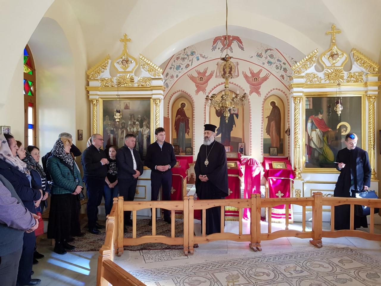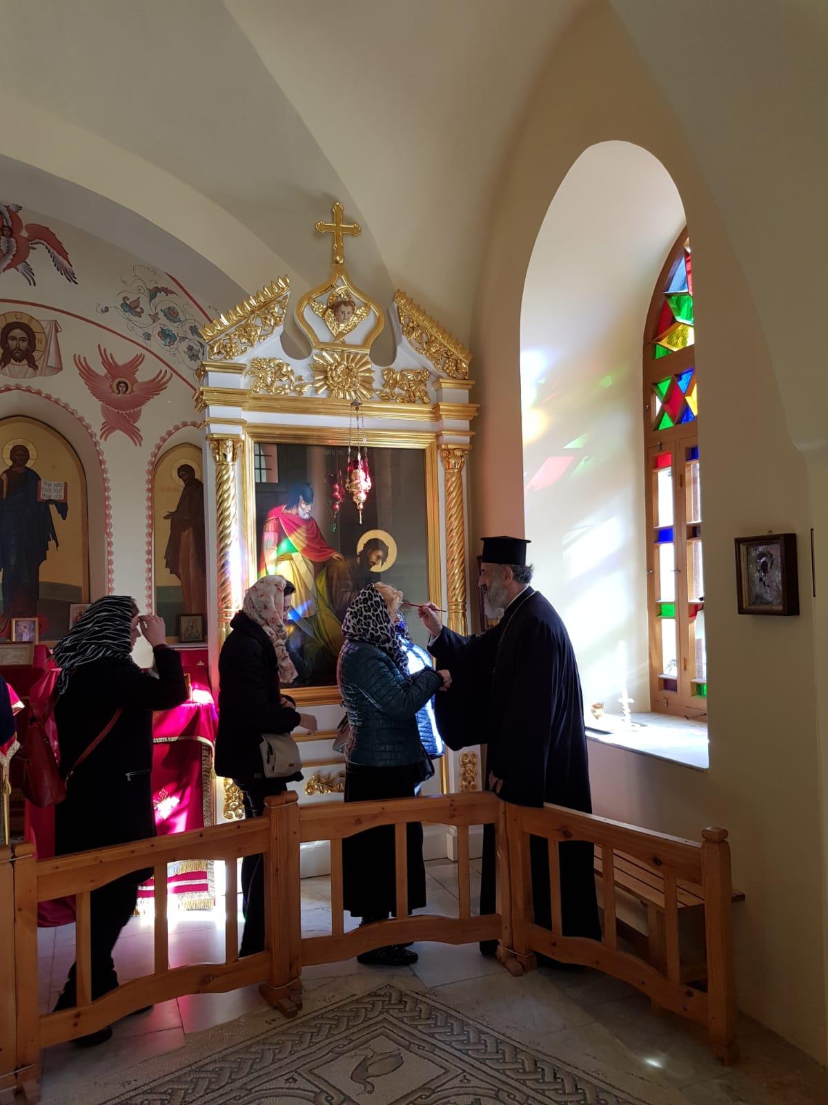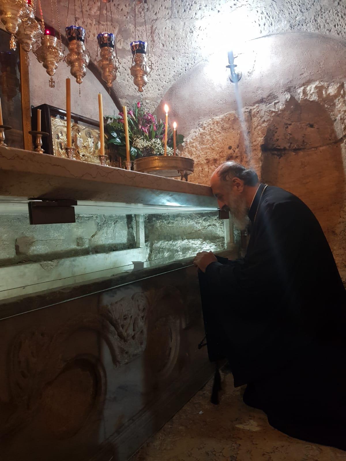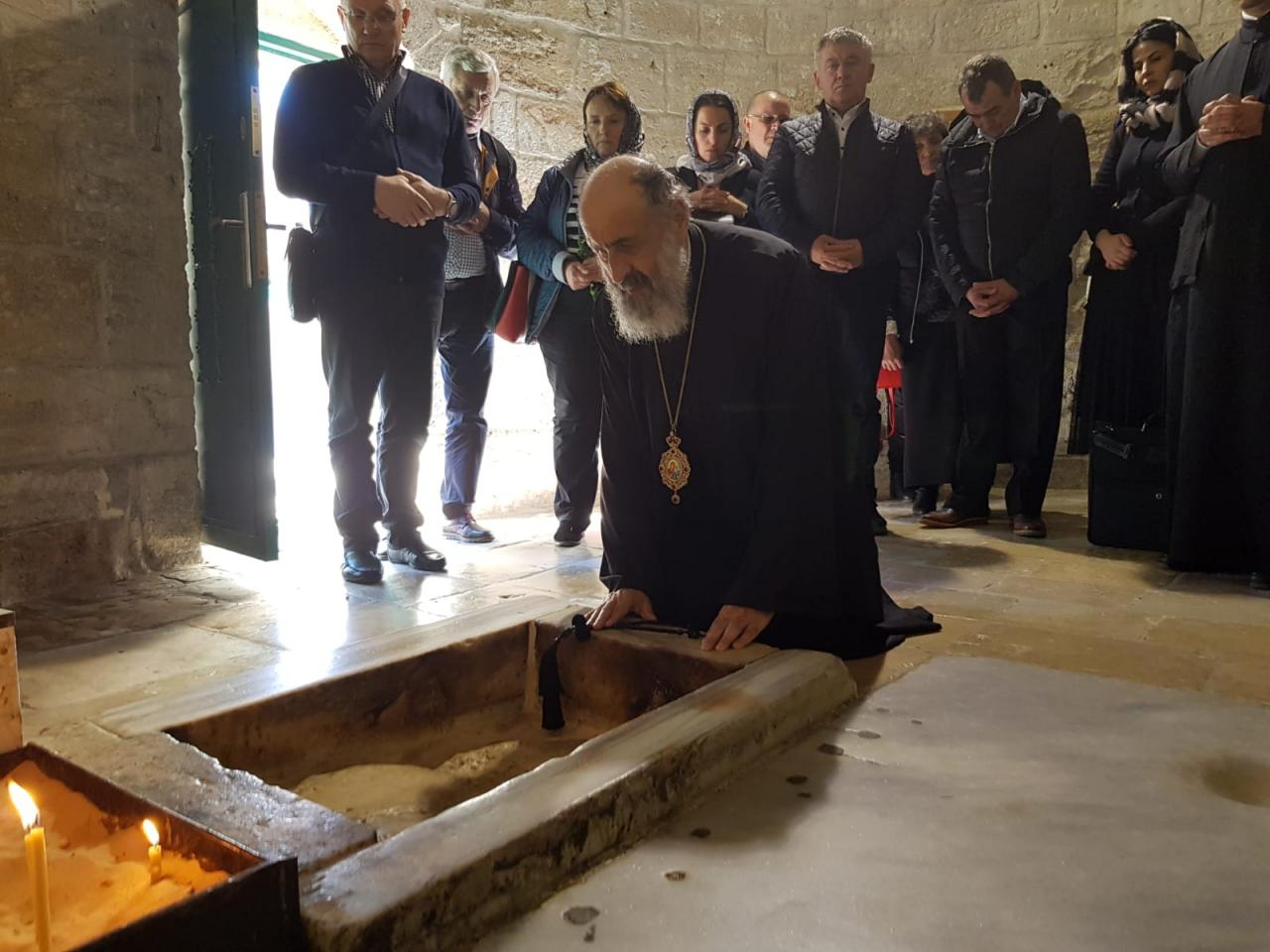 În continuare, grupul de credincioși, în frunte cu Întâistătătorul Eparhiei noastre, a poposit la Biserica centrală a Mănăstirii „Înălțarea Domnului”, reconstruită de către cruciați, în decursul secolului al XII-lea, în formă de octagon, pe structura bizantină existentă înainte de distrugerea locașului de către perși. Aici, creștinii au putut atinge piatra de pe care Mântuitorul S-a înălțat la cer, pe suprafața căreia au rămas imprimate urmele picioarelor Sale. Adresându-se celor de față, Ierarhul nostru a subliniat faptul că Hristos Cel înălțat întru slavă nu a părăsit istoria, ci a rămas solidar cu lumea răscumpărată, veghind asupra destinelor noastre. De asemenea Înaltpreasfinția Sa, făcând referire la momentul celei de-a Doua Veniri a Mântuitorului, a evidențiat faptul că Fiul lui Dumnezeu, în acele clipe, îi va lua împreună cu Dânsul pe toți cei drepți și îi va așeza în casa Tatălui, cea cu multe locașuri (cf. In. 14, 2).
