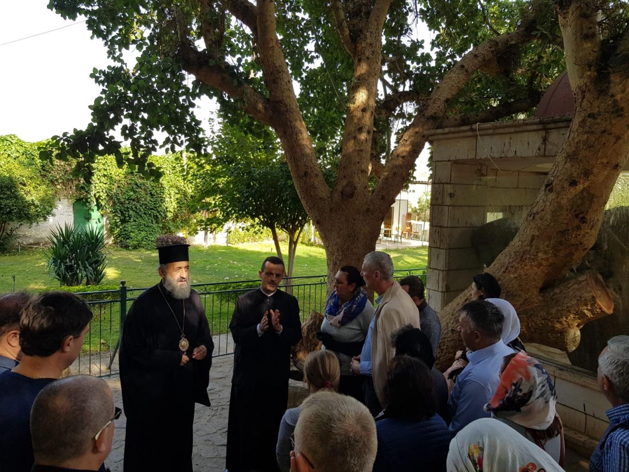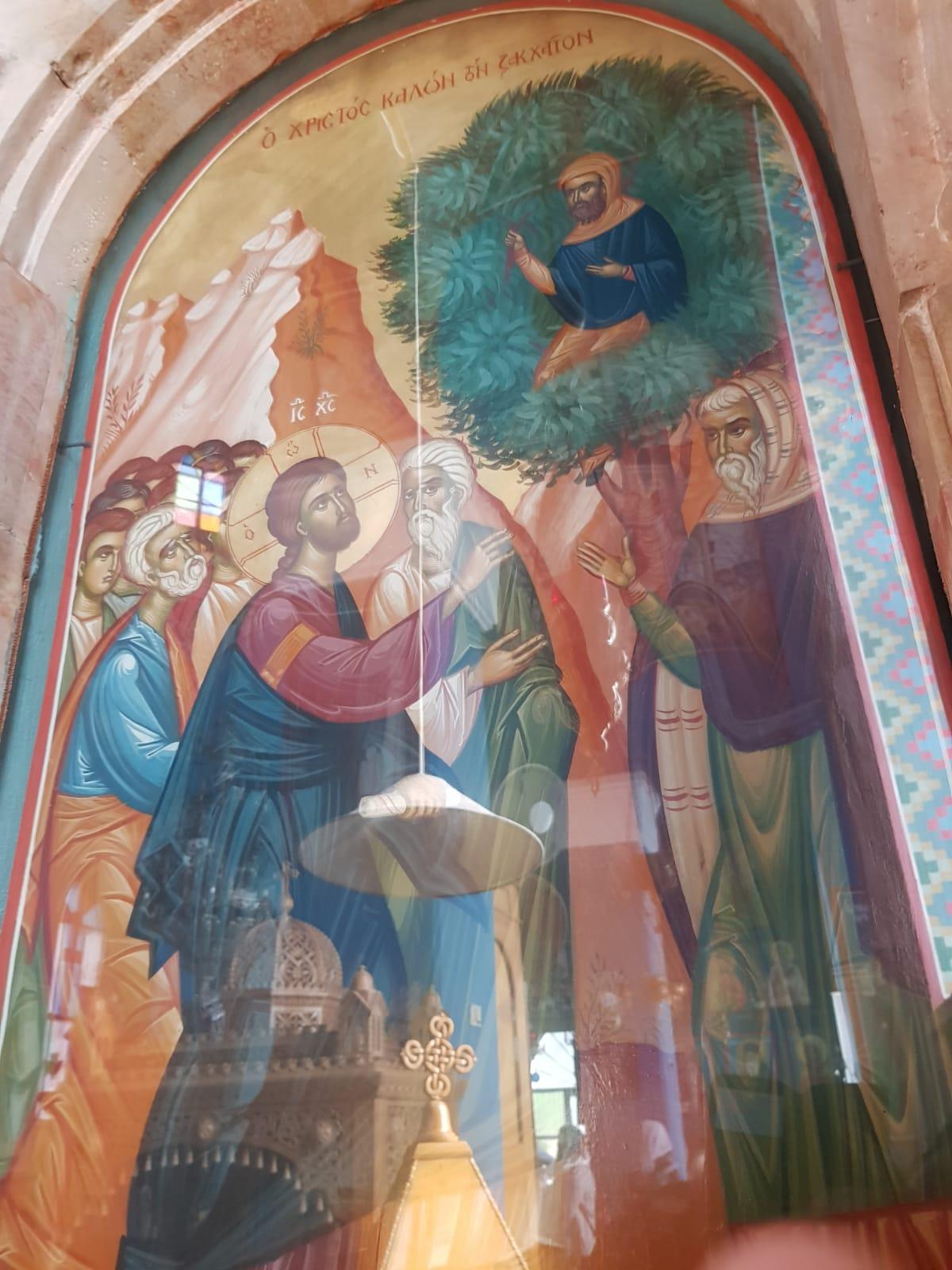 Cu inimi voioase, fortificați de harul divin și de belșugul binecuvântărilor cerești primite în lavra Hozevei, pelerinii români s-au îndreptat spre Ierihon, cea mai veche cetate din lume, cu o vechime de peste 10.000 de ani. În această cetate celebră a intrat, după trecerea Iordanului, poporul evreu, condus de către Iosua, în anul 1200 î.Hr. Primul obiectiv vizitat în Ierihon, numit și cetatea palmierilor, a fost dudul lui Zaheu. Aici, credincioșii și-au adus aminte de acel staroste al vameșilor care a dorit cu orice preț să Îl vadă pe Hristos, aflat în trecere pe strada lui. Pentru aceasta, Zaheu s-a urcat în acest sicomor și a reușit să Îl vadă, iar Hristos, apreciind dorința lui de mântuire, a poposit în casa lui și le-a oferit tuturor bucuria binecuvântării Sale. Din acest episod evanghelic se înțelege cât de importantă este dorința de mântuire pe care, dacă nu o avem în inima noastră, nici Dumnezeu nu ne poate ajuta.