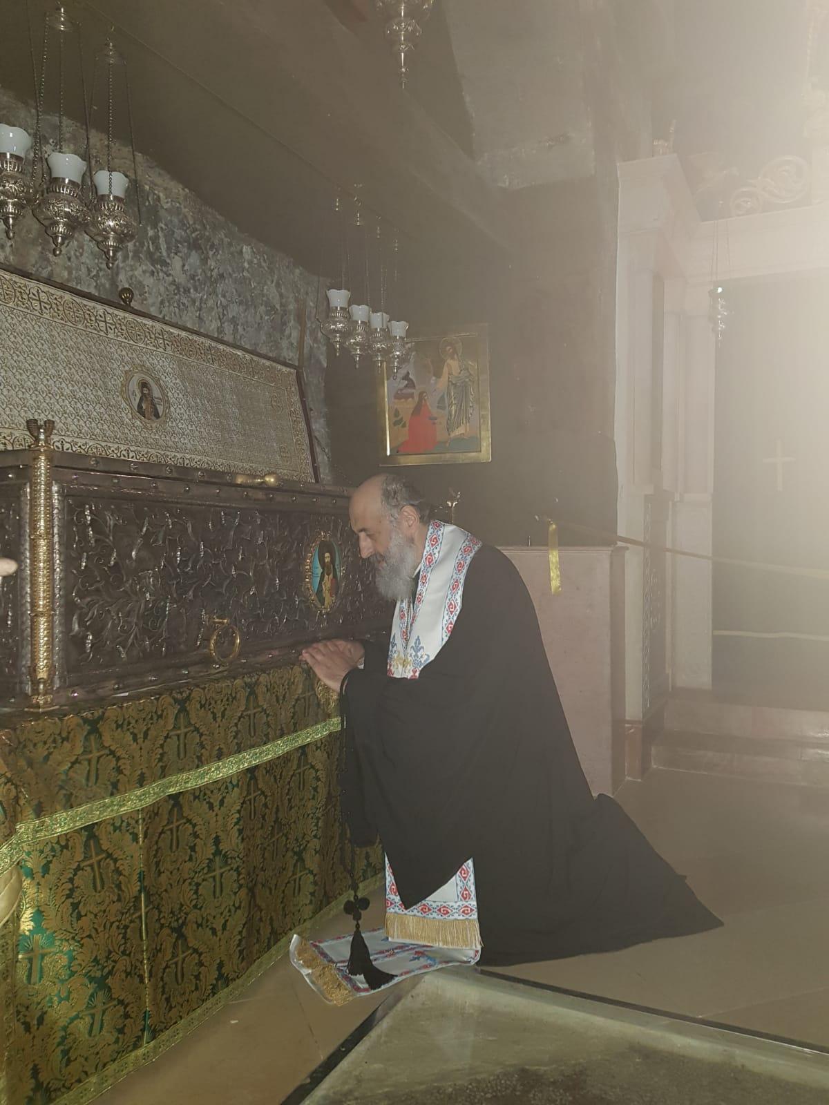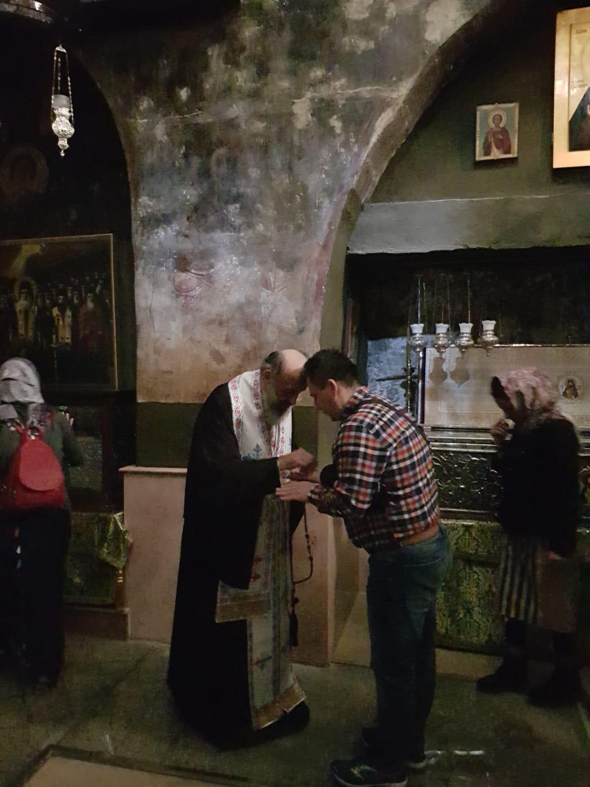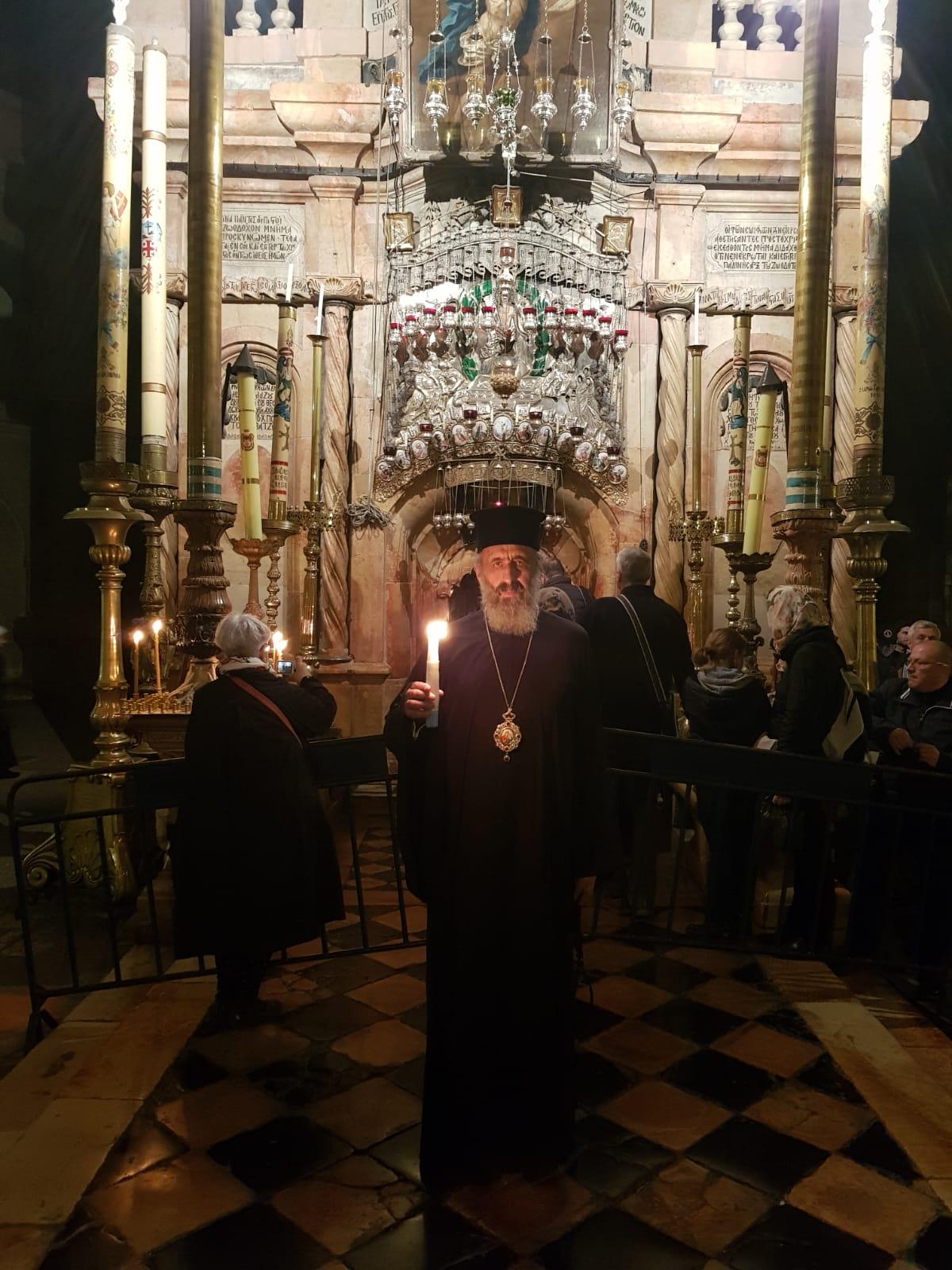 În ultima parte a zilei, odată cu venirea serii, grupul de clerici și credincioși din Eparhia noastră s-a îndreptat cu multă evlavie spre Biserica Sfintei Învieri. Ajunși aici, credincioșii pelerini au urcat, mai întâi, pe Colina Golgotei, unde, în urmă cu 20 de veacuri, s-a jucat drama iubirii și a milei, Hristos aducându-Se Jertfă de ispășire pentru păcatele noastre, oferind lumii întregi răscumpărare veșnică. Cuprinși de bucuria Sfintei Învieri care penetra toate resorturile intime ale ființei lor, pelerinii au intrat în Mormântul Sfânt și de viață dătător al lui Hristos, unde moartea a fost biruită și diavolul înfrânt. Acolo, cu frunțile și mâinile atinse de lespedea de marmură, credincioșii pelerini au înălțat cântare de mulțumire lui Hristos pentru splendoarea pelerinajului din cele șapte zile petrecute la Locurile Sfinte. Apoi, adunându-se cu toții lângă Ediculul (Mausoleul) Sfântului Mormânt, au intonat de trei ori imnul pascal „Hristos a înviat”, și, simțindu-se inundați de razele luminoase ale harului, păcii și bucuriei cerești, au părăsit curtea pavată a Bisericii Sfintei Învieri a Mântuitorului, exclamând, cu o gură și cu o inimă, într-un cor simfonic: „Doamne, Cel Ce ai înviat din morți, înviază și sufletele noastre!”.
