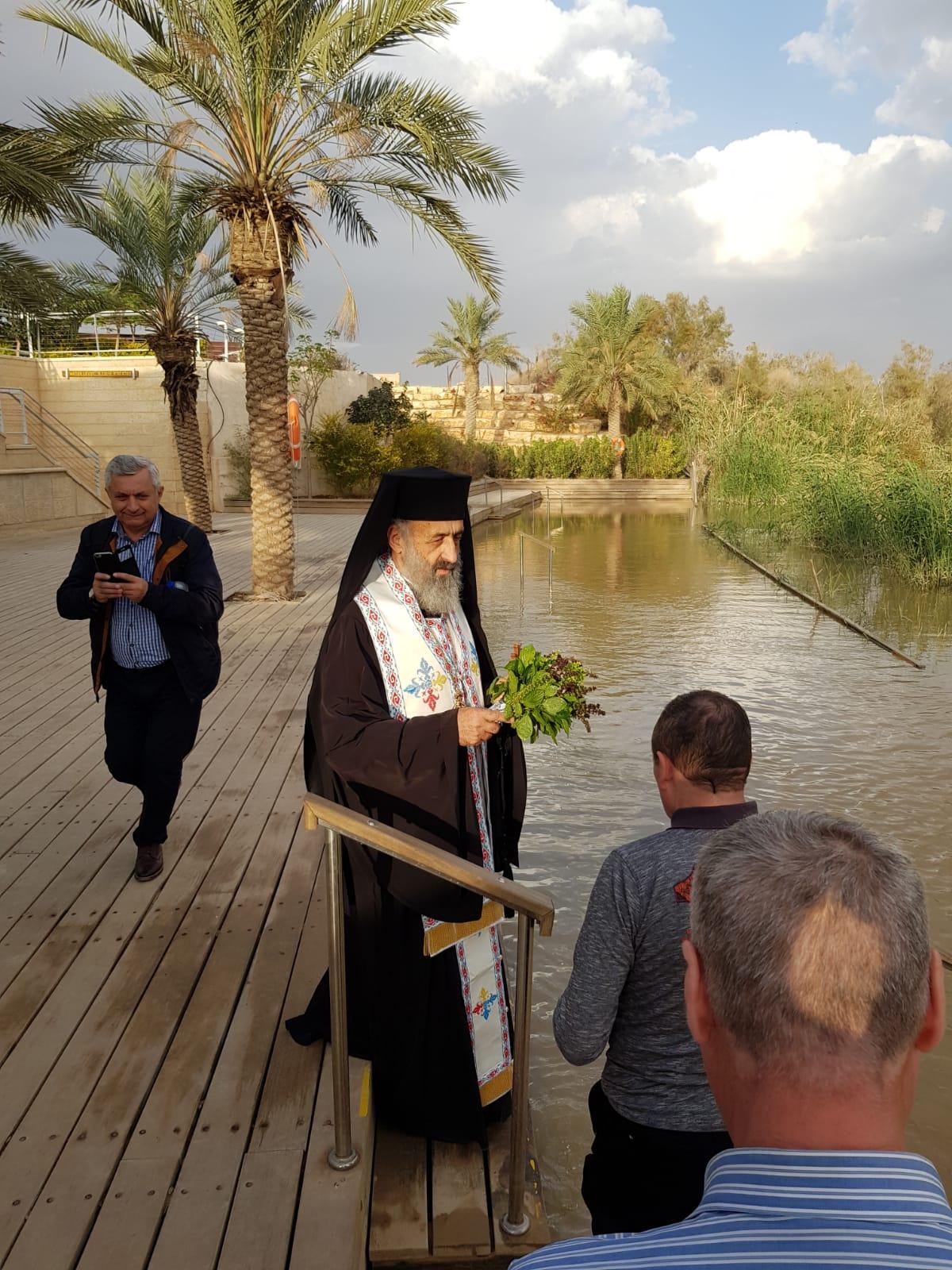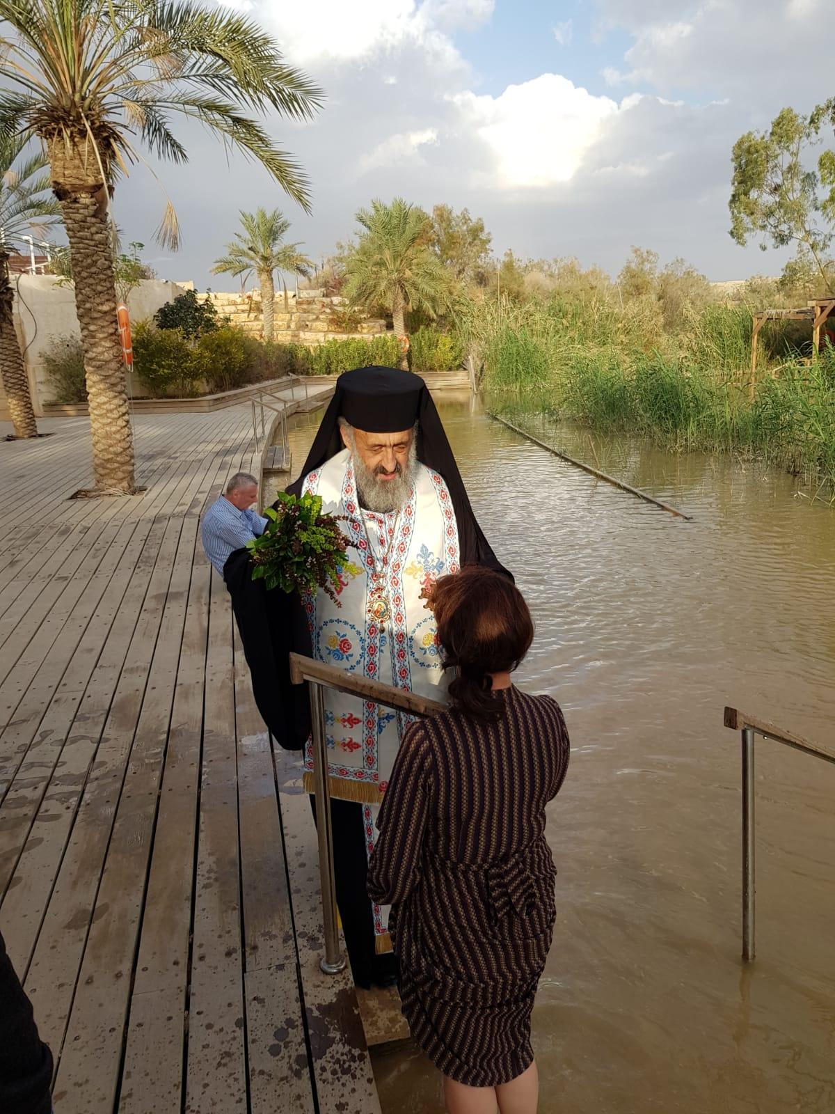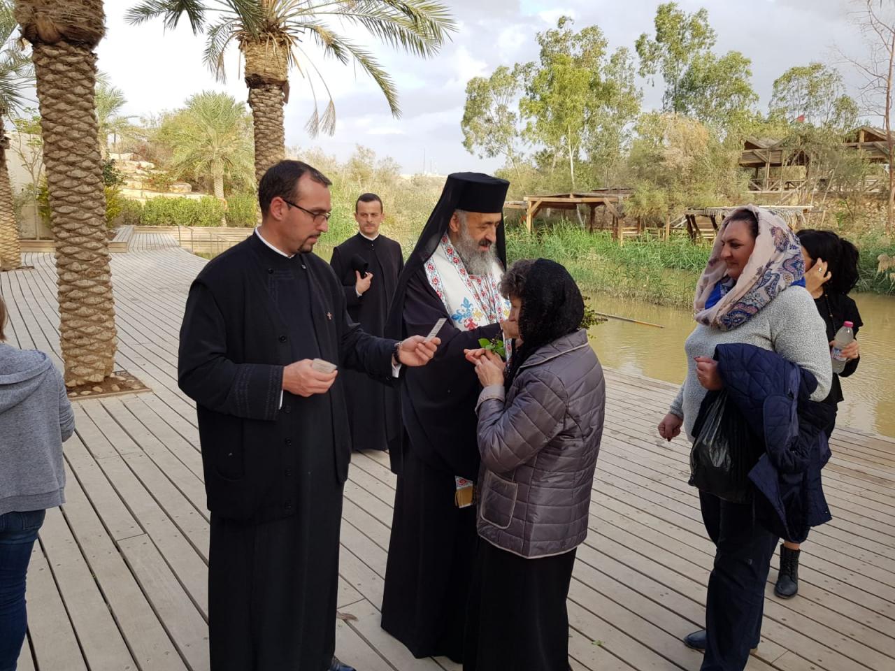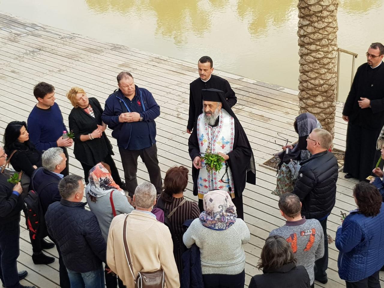 Cu multă bucurie și emoție, grupul de pelerini s-a îndreptat spre Râul sfânt al Iordanului, „Cristelnița” lui Hristos, Cel Care a primit Botezul din partea Sfântului Ioan, Înaintemergătorul Său. Despre acest loc binecuvântat, marcat în primele veacuri creștine de prezența unui stâlp de marmură, ne vorbesc numeroși Părinți ai Bisericii precum Origen, Eusebiu de Cezareea sau Fericitul Ieronim, dar și pelerina Egeria. Lângă apele Iordanului, credincioșii pelerini au intonat cu multă evlavie Troparul Botezului Domnului, după care Arhipăstorul nostru a citit pericopa evanghelică a Praznicului și a rostit marea rugăciune de dezlegare. Finalul acesteia a fost secondat de fâlfâitul grațios al aripilor unui porumbel alb care s-a apropiat de credincioși. În continuare, pelerinii au intrat cu picioarele în apă, pe marginea Râului, străbătând o distanță de 10 m spre puntea unde îi aștepta Părintele Arhiepiscop Irineu. Aici, credincioșii au sărutat Sfânta Cruce, după care au fost stropiți de către Chiriarhul nostru cu apă sfântă și sfințitoare din râul Iordanului, cu un busuioc verde și înmiresmat, primit de la maica Evghenia, stareța Așezământului românesc de la Ierihon.