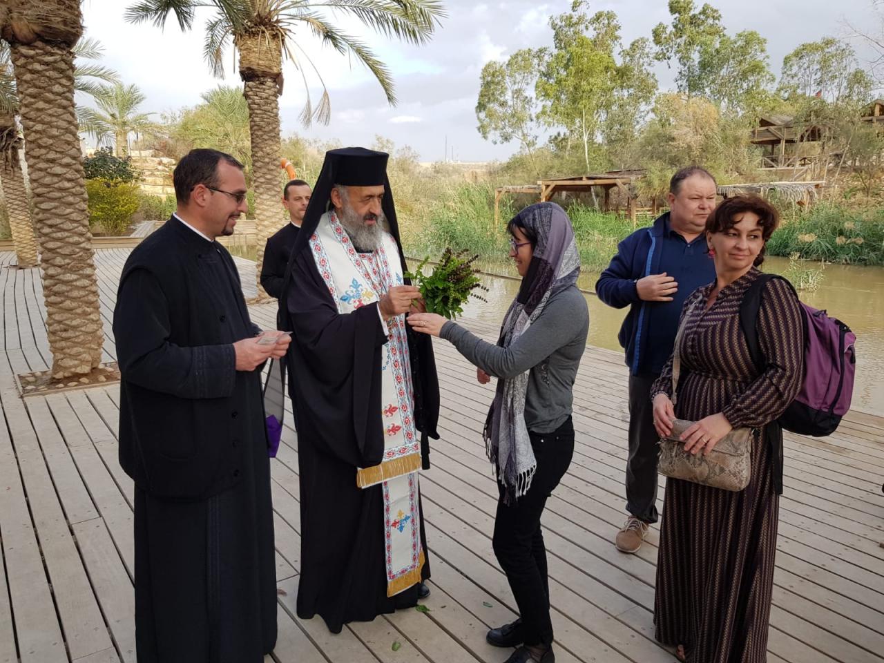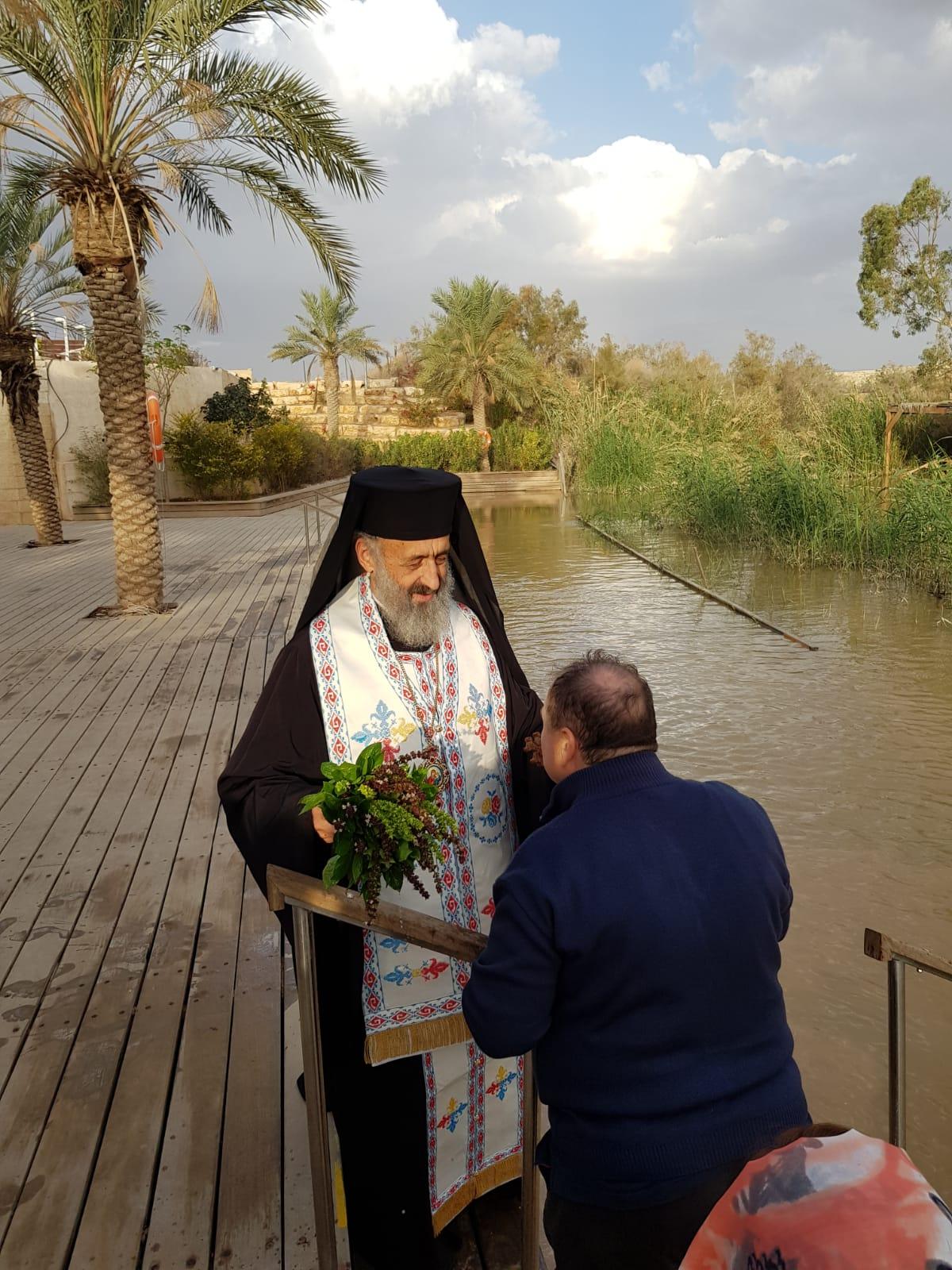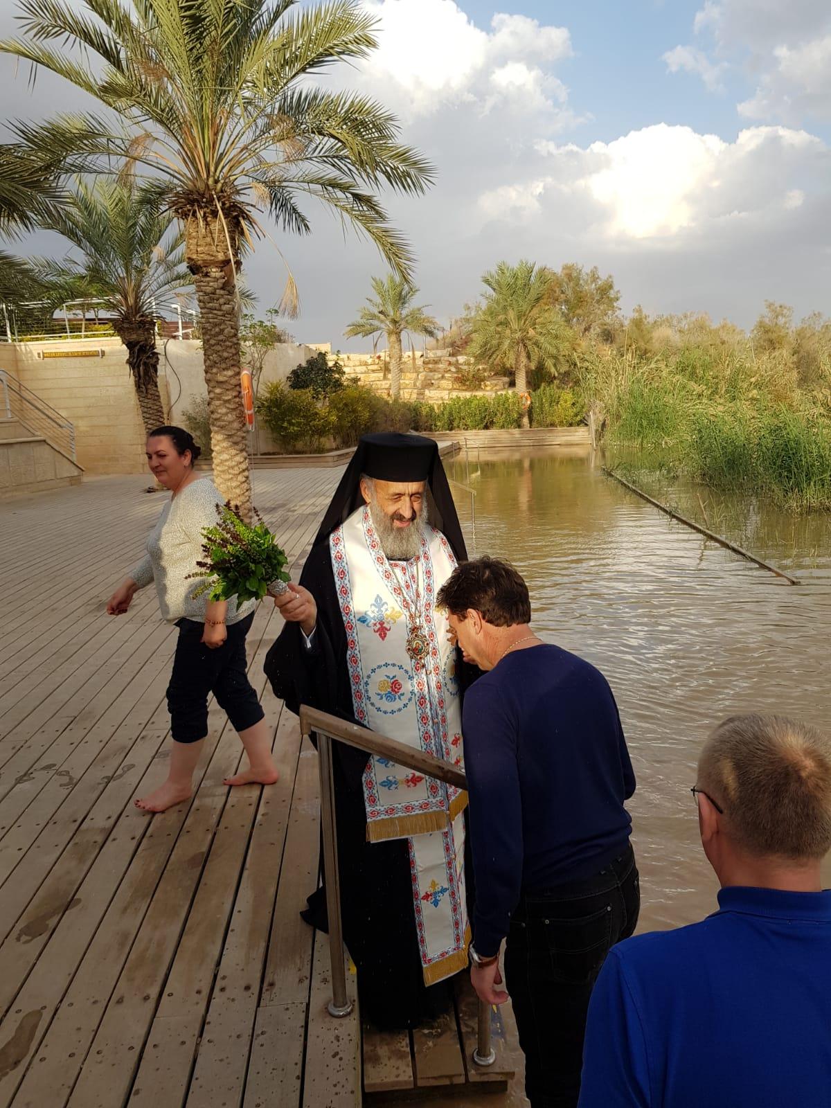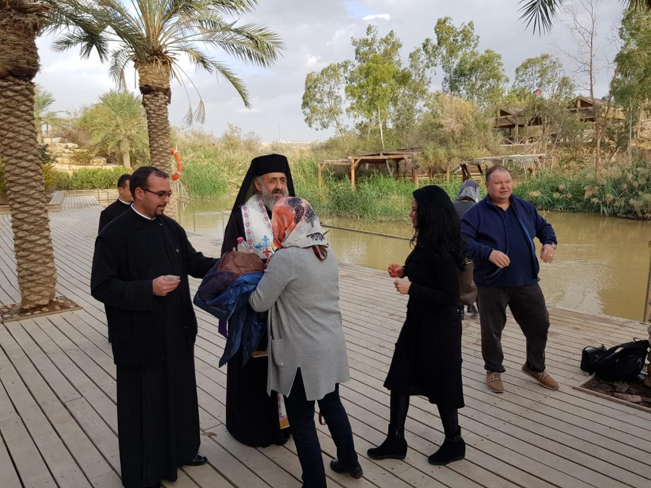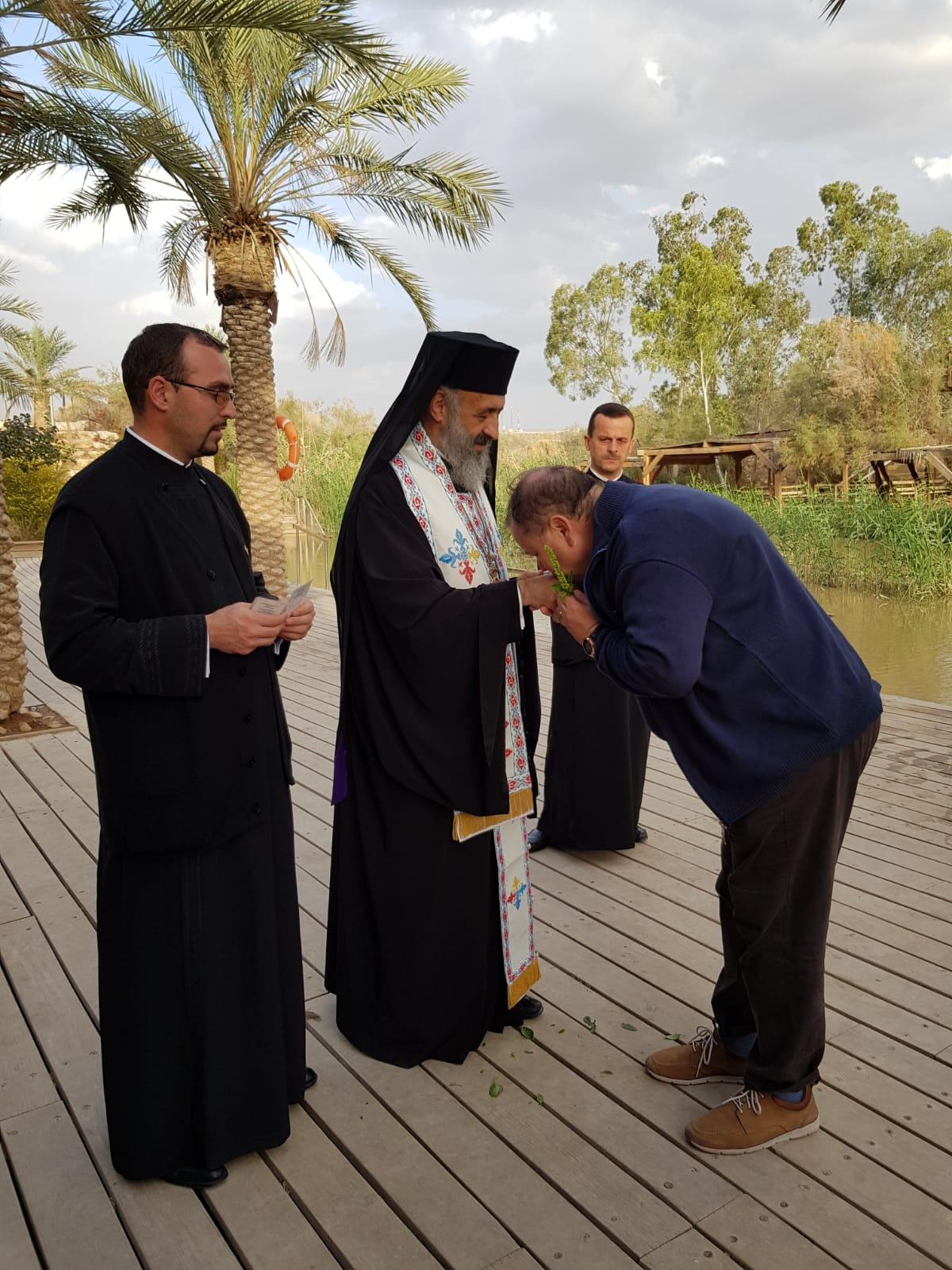Cu multă bucurie și emoție, grupul de pelerini s-a îndreptat spre Râul sfânt al Iordanului, „Cristelnița” lui Hristos, Cel Care a primit Botezul din partea Sfântului Ioan, Înaintemergătorul Său. Despre acest loc binecuvântat, marcat în primele veacuri creștine de prezența unui stâlp de marmură, ne vorbesc numeroși Părinți ai Bisericii precum Origen, Eusebiu de Cezareea sau Fericitul Ieronim, dar și pelerina Egeria. Lângă apele Iordanului, credincioșii pelerini au intonat cu multă evlavie Troparul Botezului Domnului, după care Arhipăstorul nostru a citit pericopa evanghelică a Praznicului și a rostit marea rugăciune de dezlegare. Finalul acesteia a fost secondat de fâlfâitul grațios al aripilor unui porumbel alb care s-a apropiat de credincioși. În continuare, pelerinii au intrat cu picioarele în apă, pe marginea Râului, străbătând o distanță de 10 m spre puntea unde îi aștepta Părintele Arhiepiscop Irineu. Aici, credincioșii au sărutat Sfânta Cruce, după care au fost stropiți de către Chiriarhul nostru cu apă sfântă și sfințitoare din râul Iordanului, cu un busuioc verde și înmiresmat, primit de la maica Evghenia, stareța Așezământului românesc de la Ierihon.