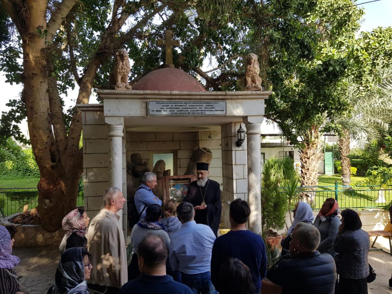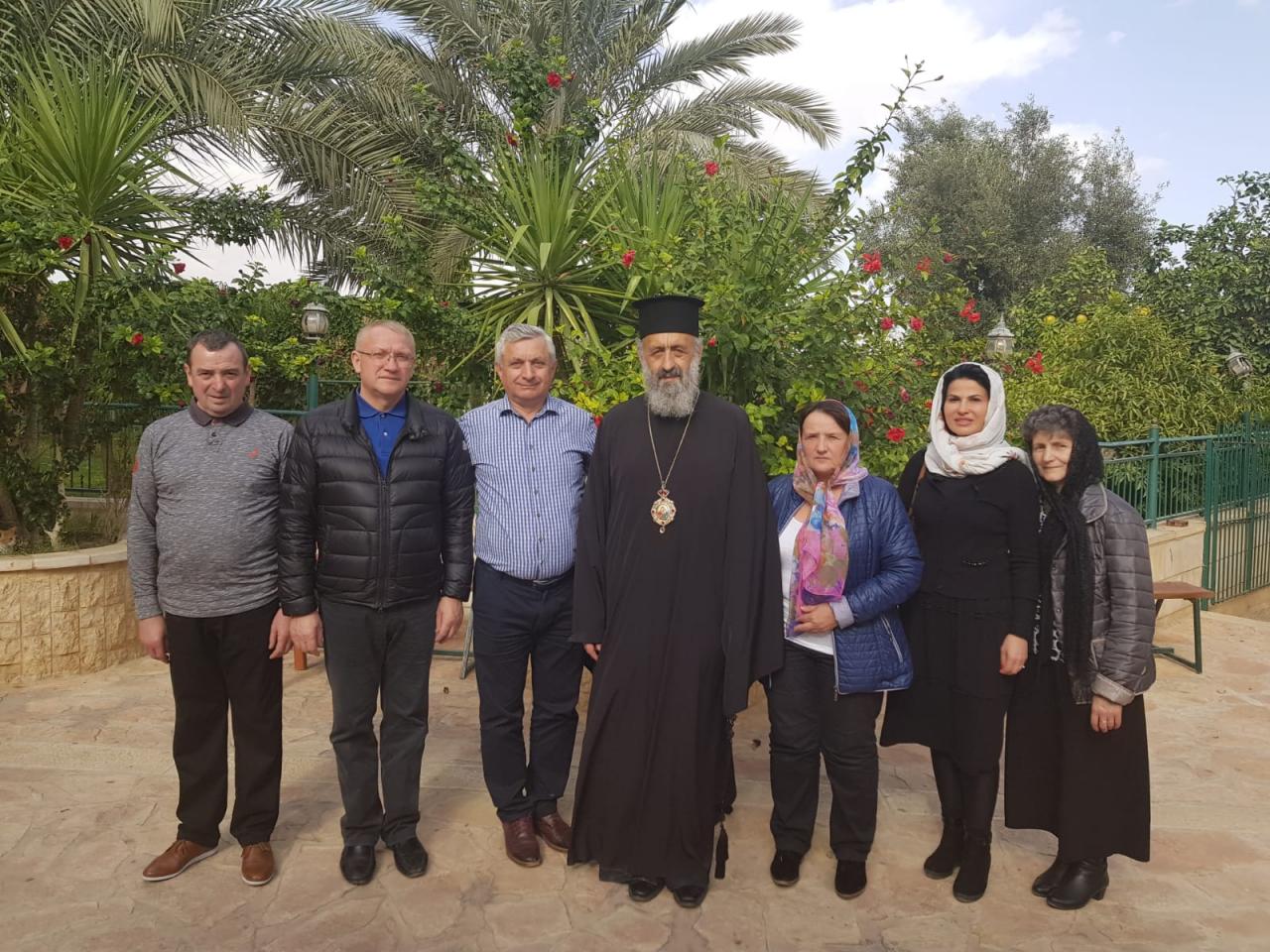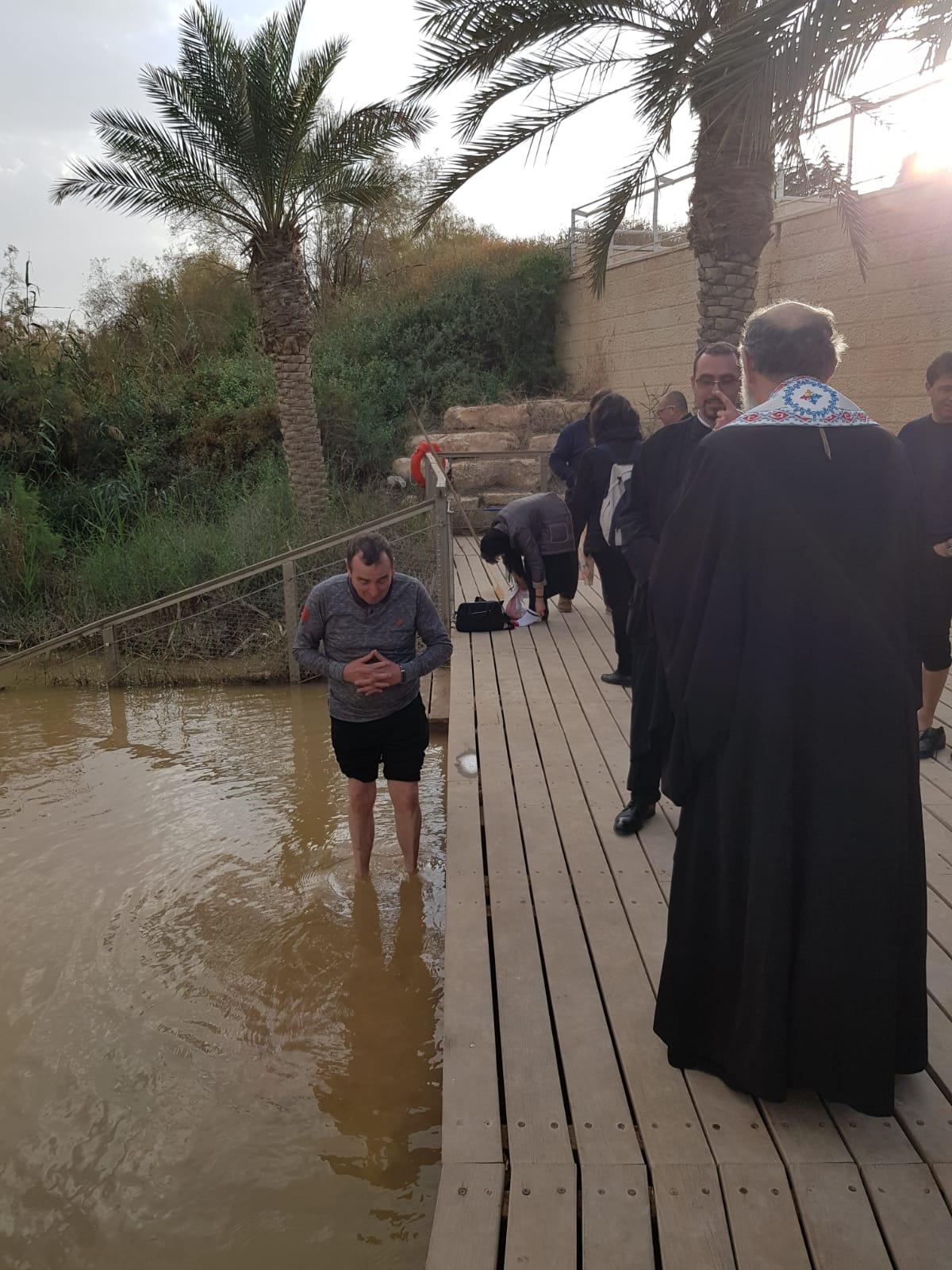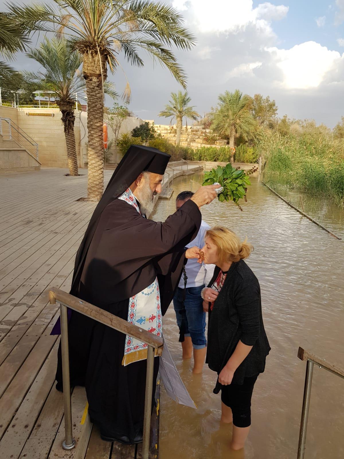 Cu multă bucurie și emoție, grupul de pelerini s-a îndreptat spre Râul sfânt al Iordanului, „Cristelnița” lui Hristos, Cel Care a primit Botezul din partea Sfântului Ioan, Înaintemergătorul Său. Despre acest loc binecuvântat, marcat în primele veacuri creștine de prezența unui stâlp de marmură, ne vorbesc numeroși Părinți ai Bisericii precum Origen, Eusebiu de Cezareea sau Fericitul Ieronim, dar și pelerina Egeria. Lângă apele Iordanului, credincioșii pelerini au intonat cu multă evlavie Troparul Botezului Domnului, după care Arhipăstorul nostru a citit pericopa evanghelică a Praznicului și a rostit marea rugăciune de dezlegare. Finalul acesteia a fost secondat de fâlfâitul grațios al aripilor unui porumbel alb care s-a apropiat de credincioși. În continuare, pelerinii au intrat cu picioarele în apă, pe marginea Râului, străbătând o distanță de 10 m spre puntea unde îi aștepta Părintele Arhiepiscop Irineu. Aici, credincioșii au sărutat Sfânta Cruce, după care au fost stropiți de către Chiriarhul nostru cu apă sfântă și sfințitoare din râul Iordanului, cu un busuioc verde și înmiresmat, primit de la maica Evghenia, stareța Așezământului românesc de la Ierihon.