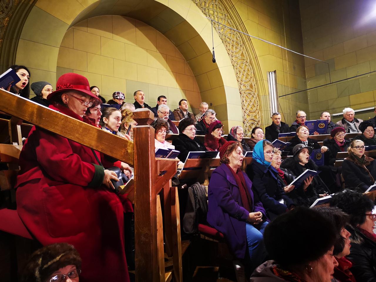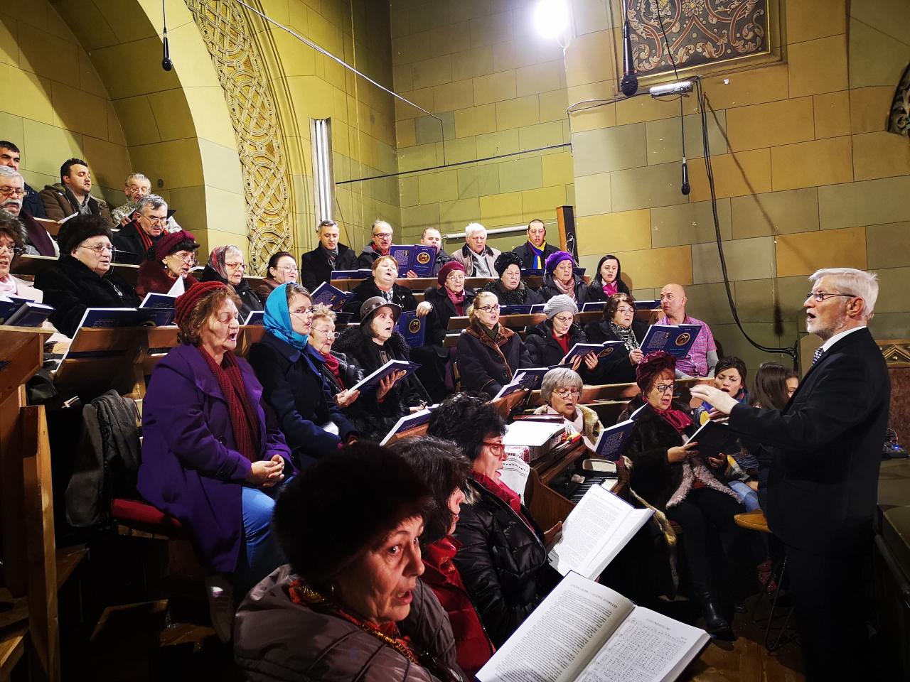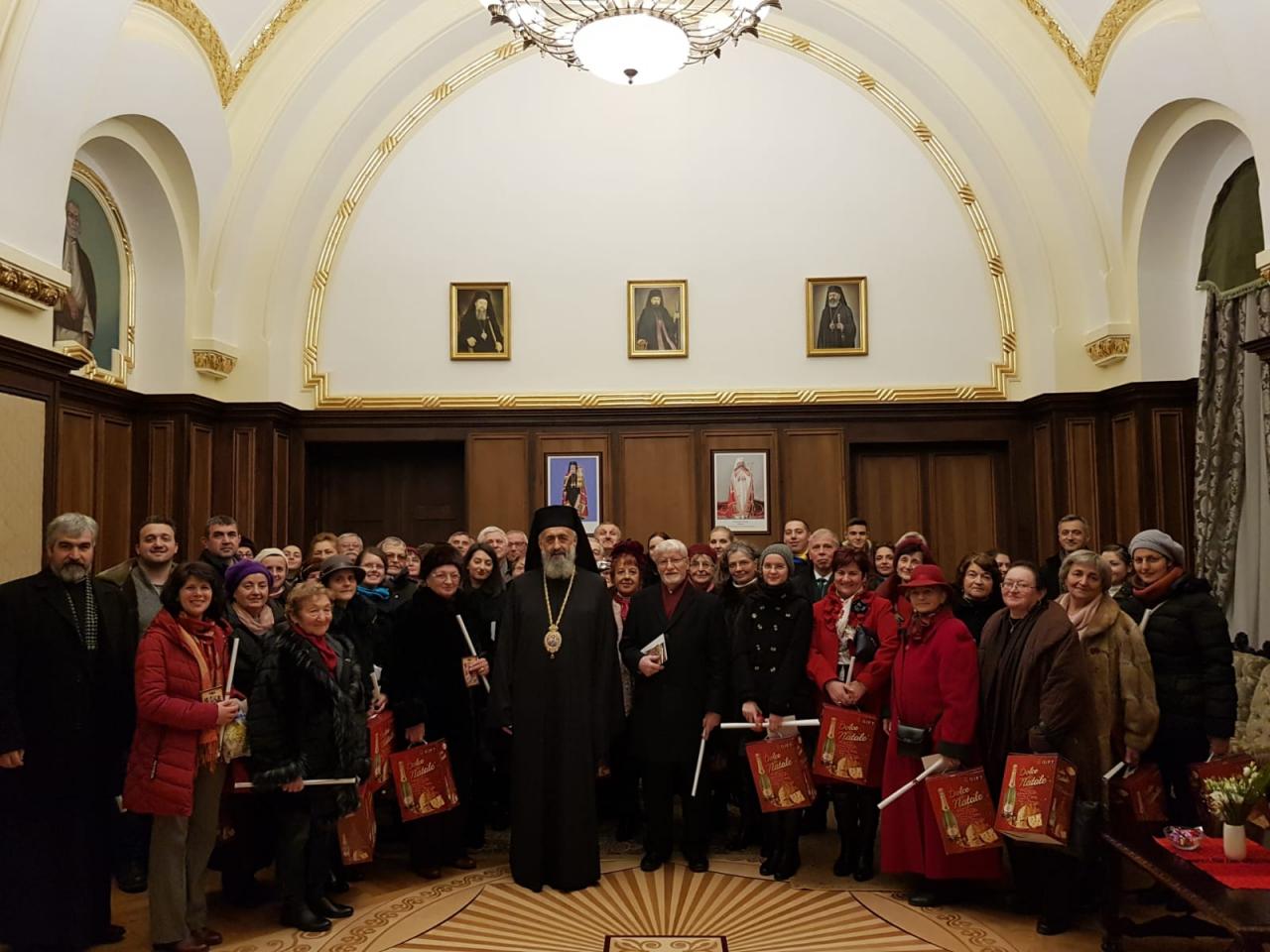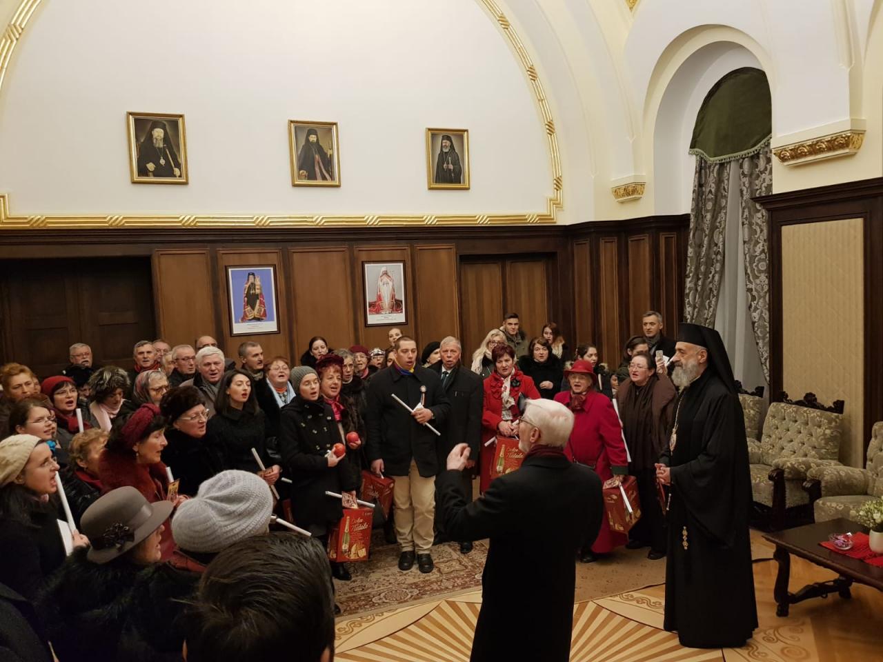 În continuare, Corala „Sfânta Treime” a Catedralei arhiepiscopale, dirijată de domnul prof. Iosif Fiț, a susținut un recital de colinde cu totul deosebit, oferind celor prezenți clipe de emoție și de bucurie duhovnicească. La finalul concertului, Întâistătătorul Eparhiei noastre a adresat cuvenitele mulțumiri domnului dirijor Iosif Fiț, precum și membrilor Coralei, și i-a felicitat pentru rafinamentul artistic de care au dat dovadă. De asemenea, în continuare, membrii Coralei Catedralei Reîntregirii au transmis vestea cea bună a Nașterii Mântuitorului, în prezența Părintelui Arhiepiscop Irineu, în Salonul oficial al Centrului eparhial. În semn de prețuire și binecuvântare, Ierarhul nostru le-a oferit tuturor câte un mic dar și i-a felicitat pentru râvna și osteneala dovedite pe parcursul anilor.