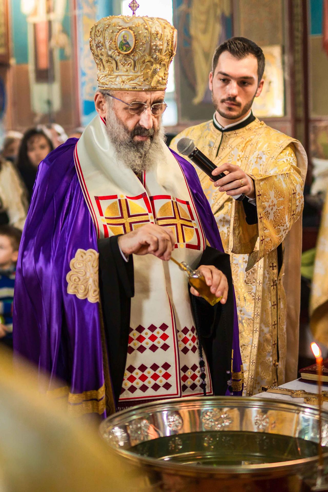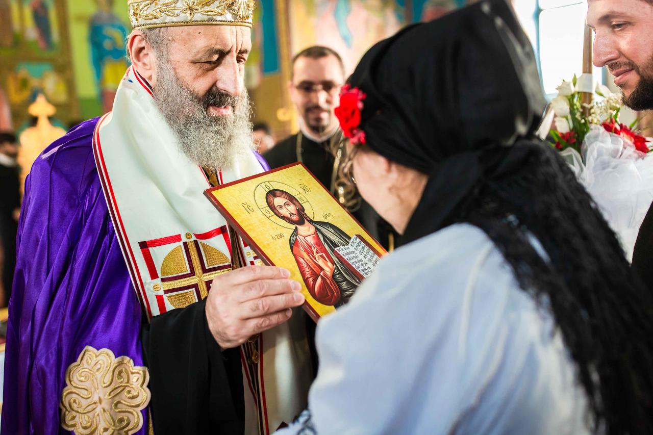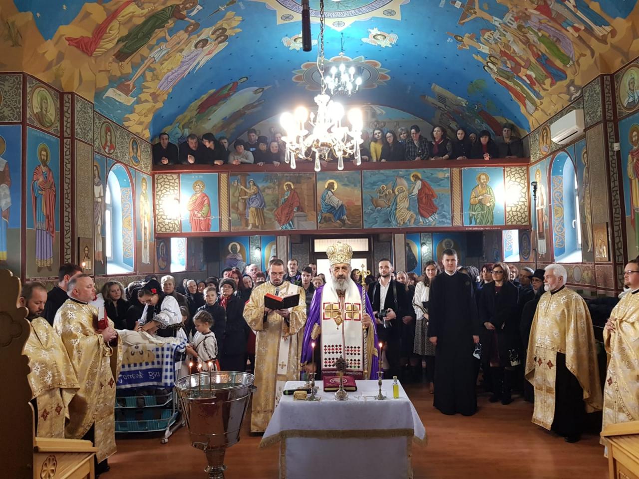 După celebrarea Sfintei Liturghii, Părintele Arhiepiscop Irineu a oficiat Taina Sfântului Botez pentru pruncul Antim-Nicolae, fiul părintelui paroh Alin Boncea. La final, Chiriarhul nostru a rostit un cuvânt de învățătură în care a reliefat importanța acestei Taine în vederea inițierii în viața duhovnicească. De asemenea, Întâistătătorul Eparhiei noastre i-a oferit pruncului nou-botezat o icoană cu Mântuitorul Iisus Hristos.