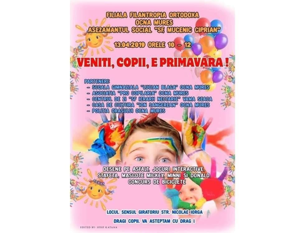 Asociația Filantropia Ortodoxă Alba Iulia – Filiala Ocna Mureș, prin Așezământul social „Sfântul Mucenic Ciprian”, organizează sâmbătă, 13 aprilie, o activitate recreativă dedicată copiilor. Acțiunea, intitulată „Veniți, copii, e primăvară”, se va desfășura în centrul orașului Ocna Mureș, în intervalul orar 10.00-12.00, când vor avea loc jocuri interactive, desene pe asfalt, ștafetă și un concurs de biciclete. De la acest eveniment nu vor lipsi mascotele Mickey, Minnie și Donald.