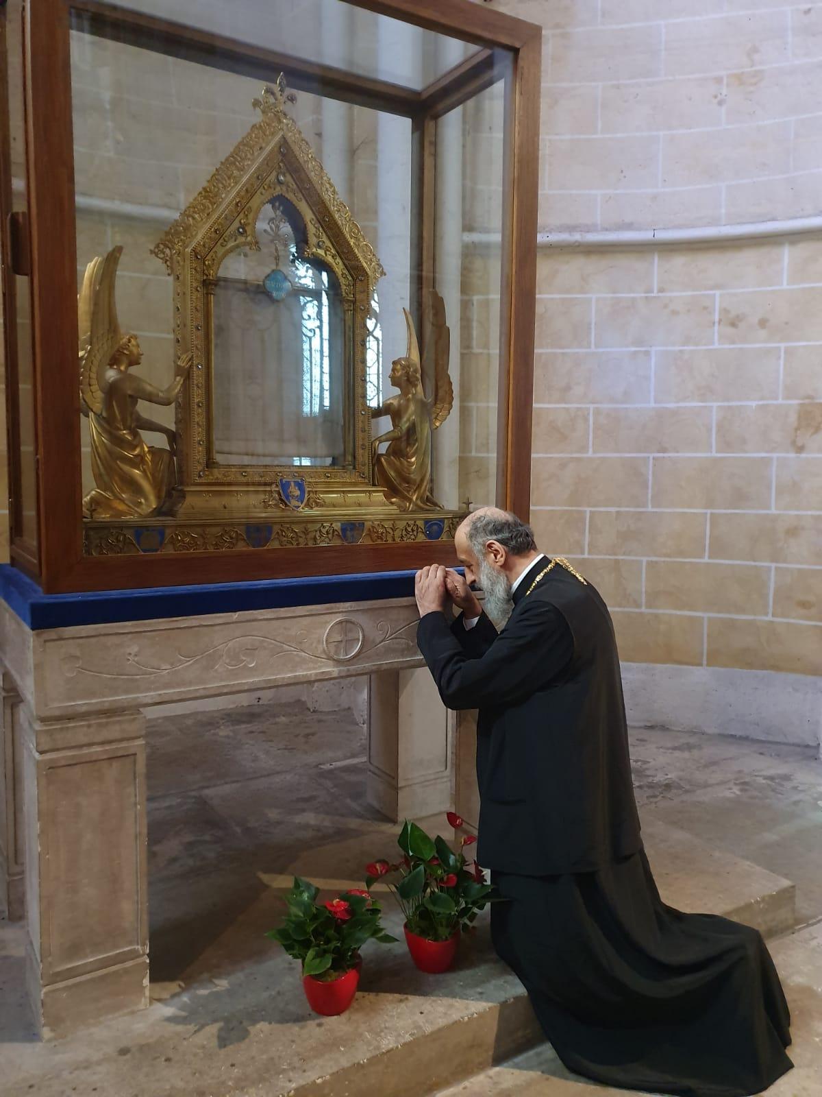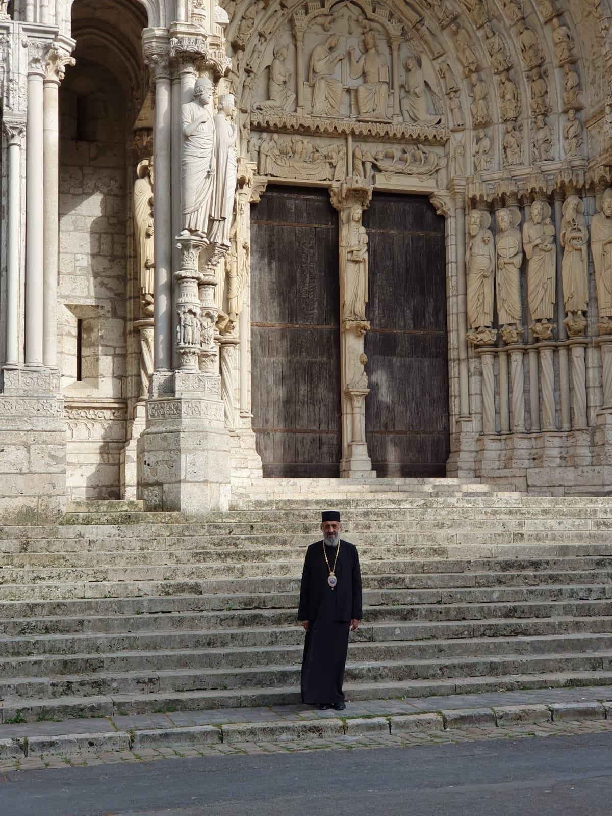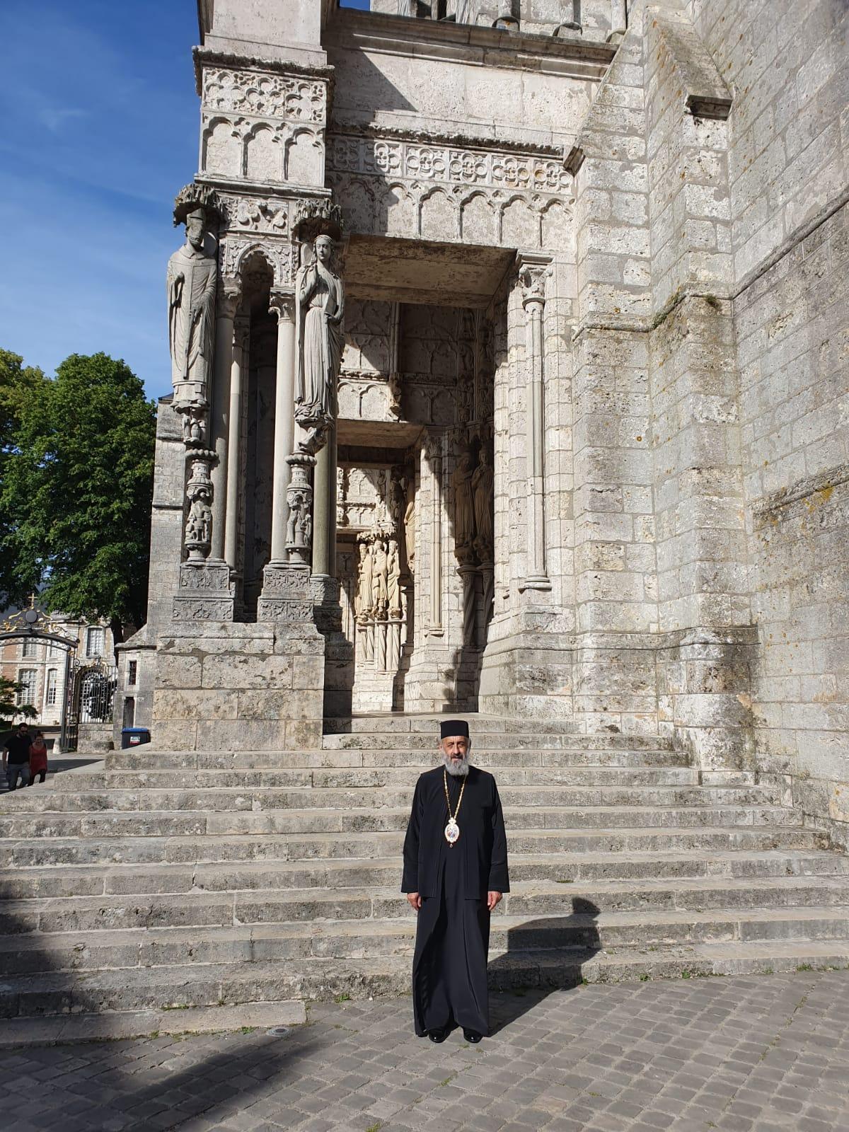 În după-amiaza acestei zile, Părintele Arhiepiscop Irineu a vizitat Catedrala Notre Dame din Chartres. Situat la 80 de km sud-vest de Paris, acest oraș are adânci rădăcini creștine încă din primele secole, când deja în jurul anului 350 exista un scaun episcopal legat de persoana episcopului Aventin și când s-a construit prima biserică creștină din acest loc. Actuala catedrală, amplasată pe același loc, datează din secolul al XI-lea și păstrează un tezaur spiritual și artistic deosebit de valoros. Vitraliile vechi ale bisericii reprezintă o podoabă prețioasă a locașului de cult, fiind desfășurate pe o suprafață de 2600 mp. Unul dintre acestea, ce o reprezintă pe Maica Domnului, are o vechime de 1000 de ani. Celebritatea orașului este datorată acestor vitralii care sunt predominate de o cromatică albastru luminoasă, cunoscută ca fiind „bleu de Chartres”. Catedrala adăpostește și un alt prețios odor: vălul Maicii Domnului, care a fost purtat de Fecioara Maria în momentul Bunei Vestiri. Acesta ar fi fost dăruit împăratului Carol cel Mare de către împărăteasa bizantină Irina.