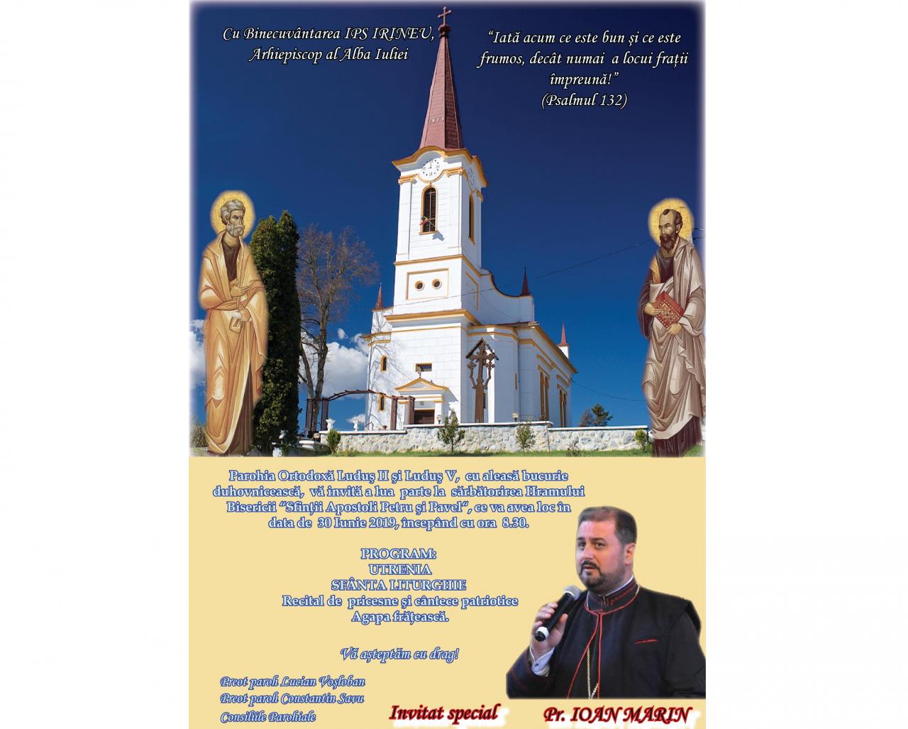 Cu binecuvântarea Înaltpreasfințitului Părinte Irineu, Arhiepiscop al Alba Iuliei, sâmbătă, 29 iunie, și duminică, 30 iunie a.c., biserica „Sfinții Apostoli Petru și Pavel” din Luduș își va serba hramul. Astfel, în ziua de 29 iunie 2019, când Biserica noastră îi prăznuiește pe Sfinții Apostolii Petru și Pavel, în locașul de cult al parohiilor Luduș II și Luduș V, după oficierea Sfintei Liturghii, va avea loc slujba parastasului pentru toți preoții care au slujit la Sfântul Altar și care au trecut la Domnul: preotul Arhimon Ludaşi, preotul Filon Boeriu, preotul Ioan Graur, preotul Ioan Boeriu, preotul Filon Orban, preotul Ioan Boeriu, preotul Nicolae Solomon, preotul Vasile Suciu, preotul Enea Pop Bota, preotul Ioan Oltean, preotul Bogdan Naşcu, preotul Vasile Samoilă, preotul Ioan Orăşean și preotul Eugen Chirilă Părău.